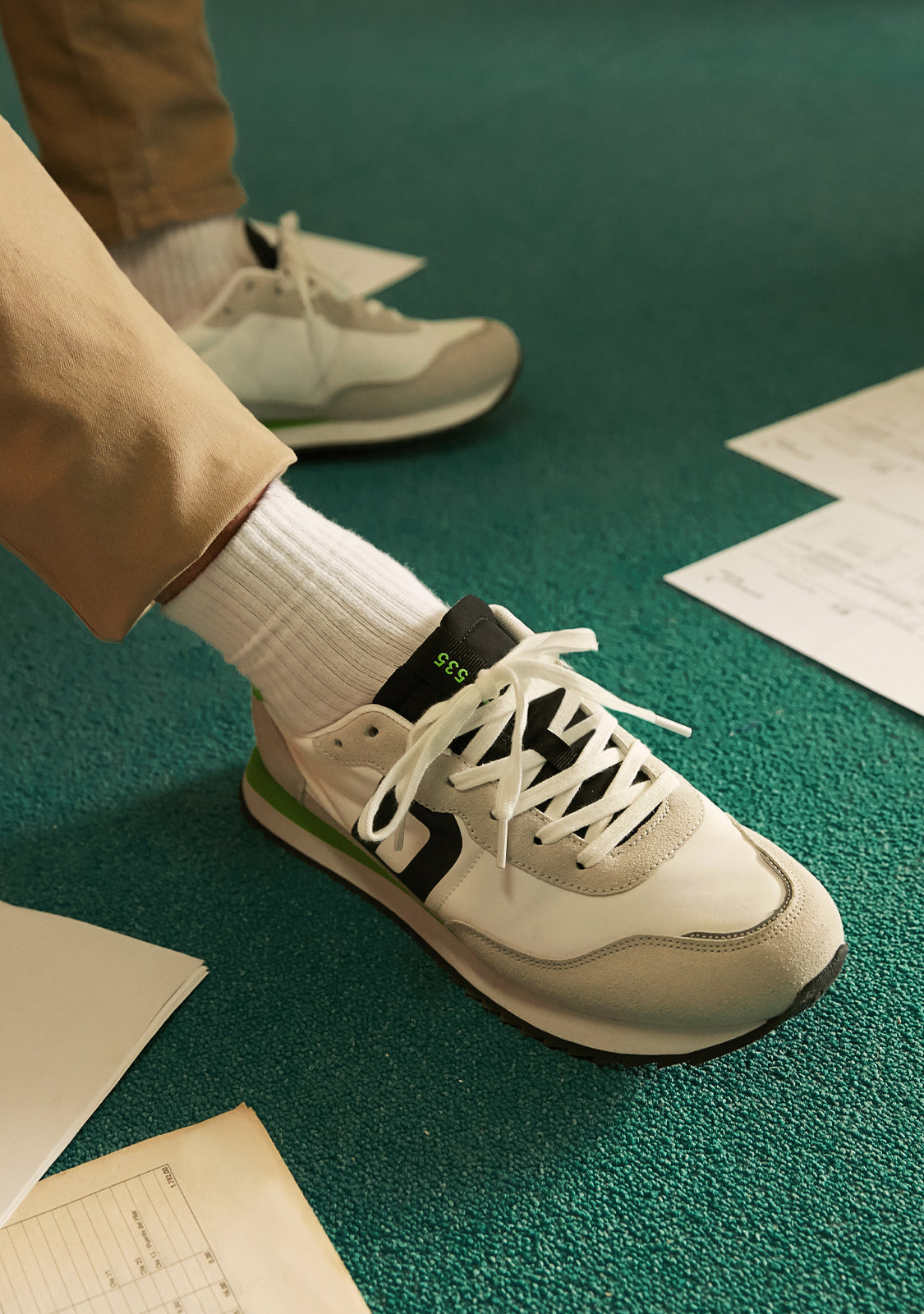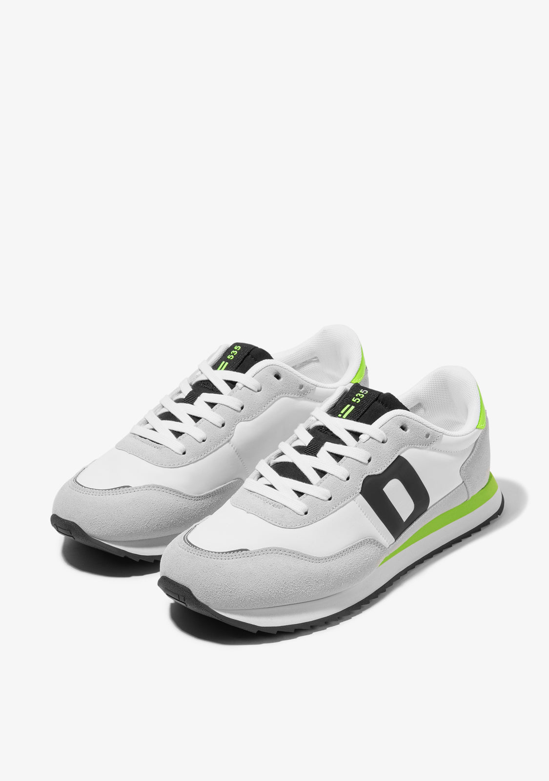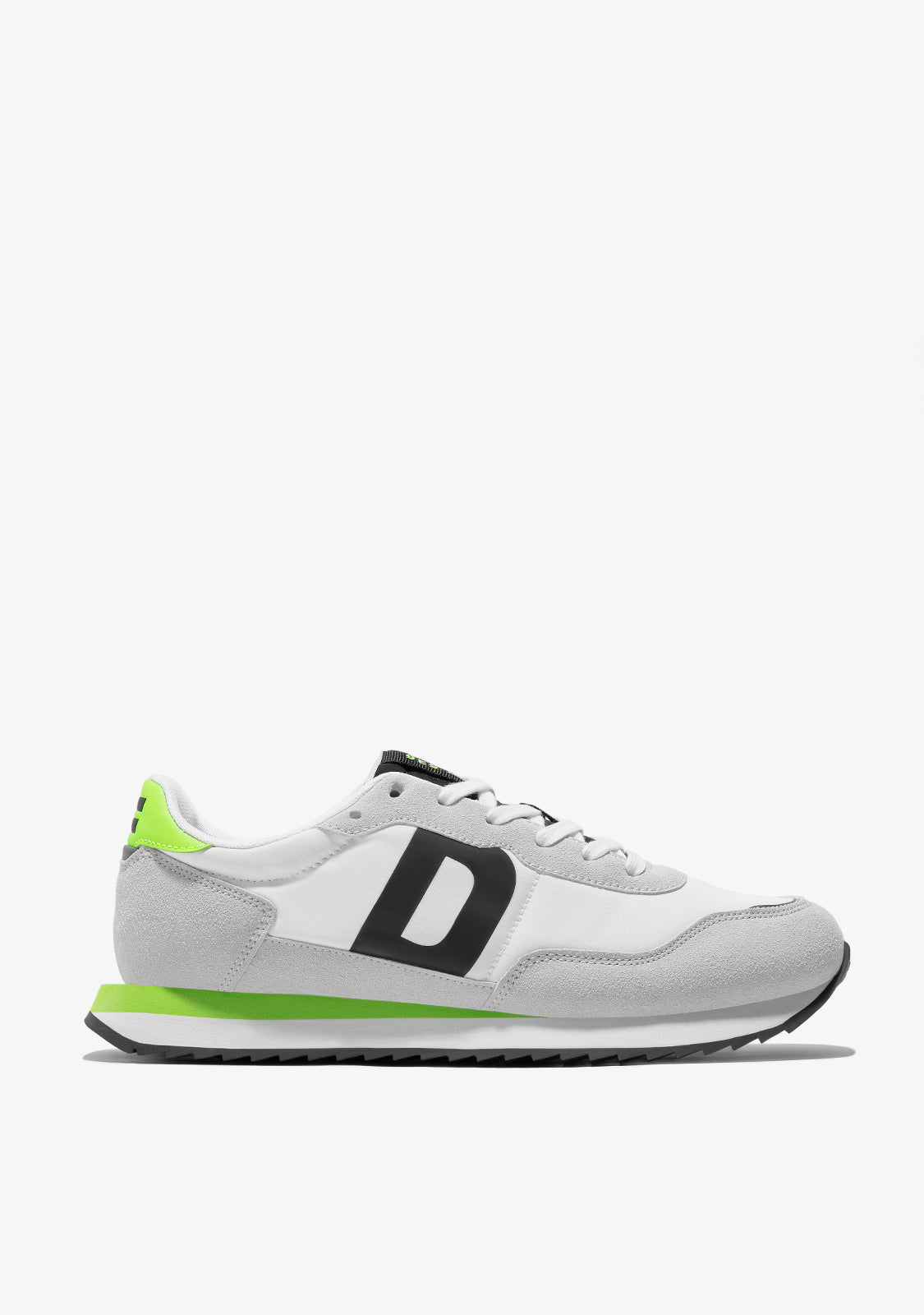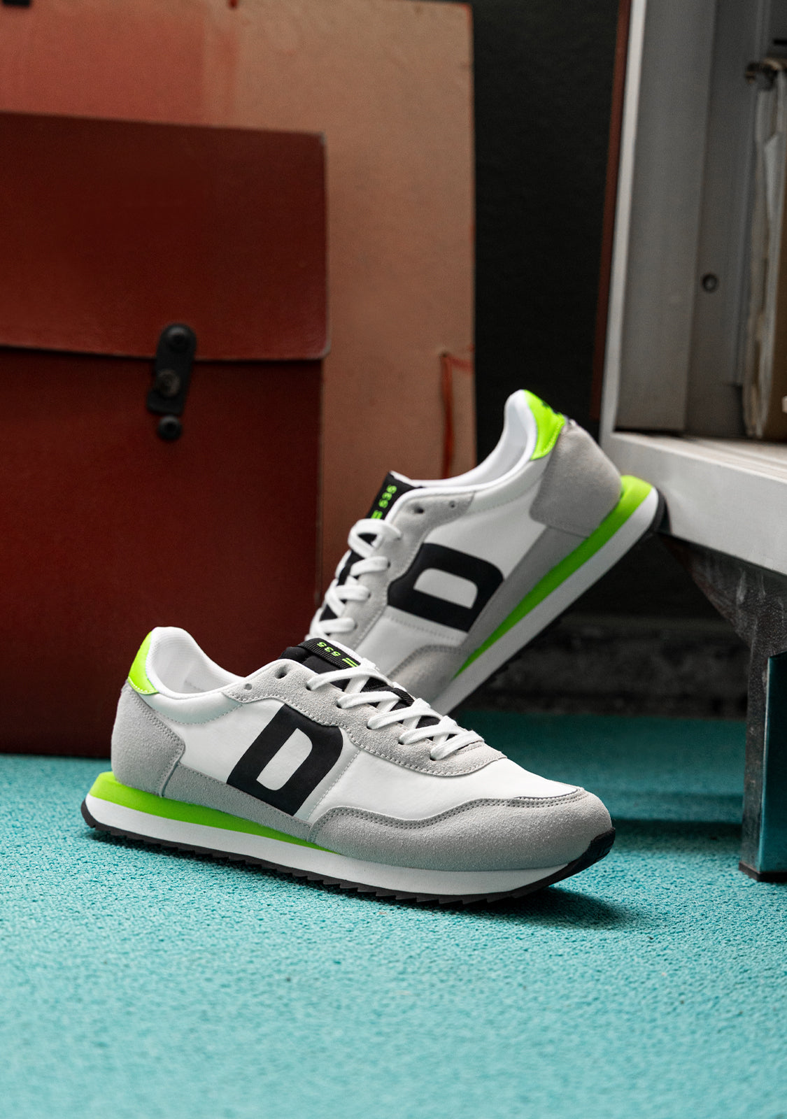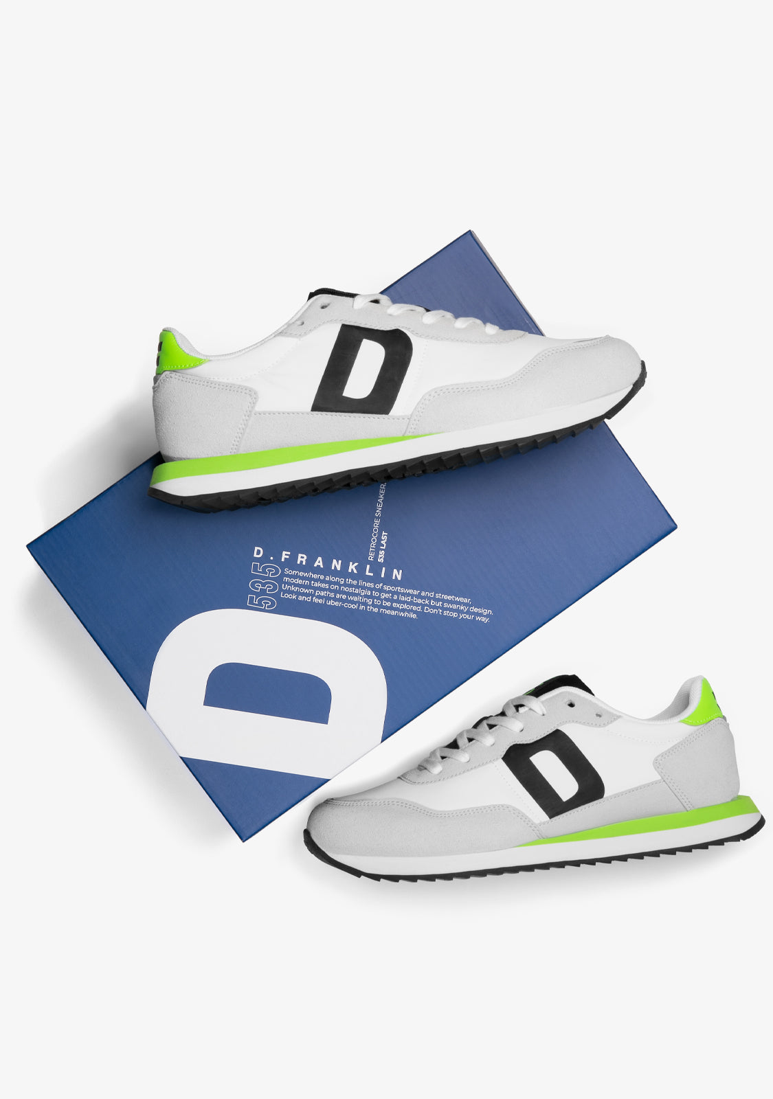 Unaffected by the passage of time. Created using synthetic materials. Sole in a combination of materials: TR skate for maximum traction and dual density EVA wedge for a firm and comfortable tread. Padded collar and cotton lace-up closure. Embossed D.Franklin logo on heel on lime green and black emblem on the side. Made for the city.