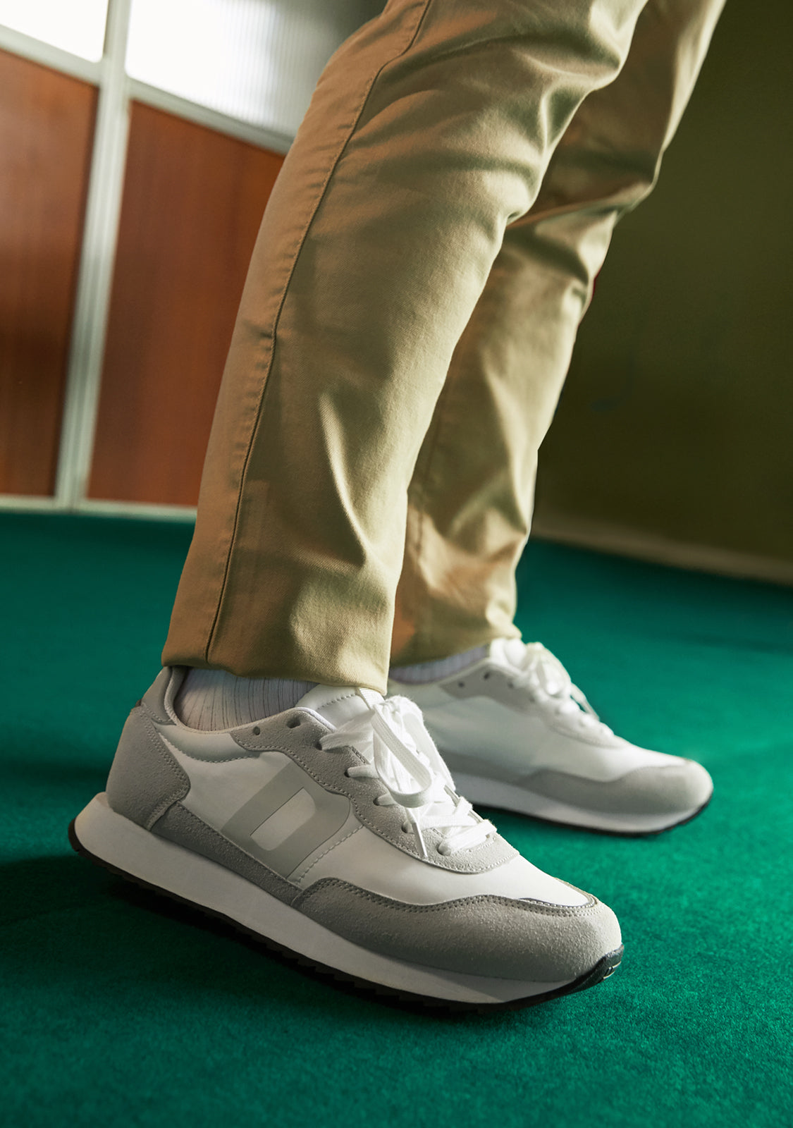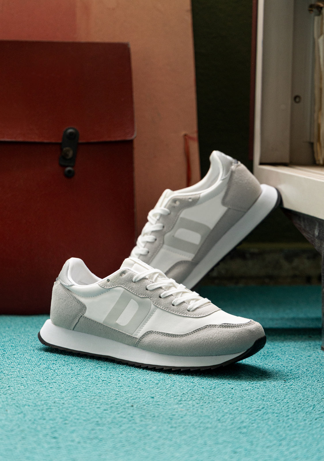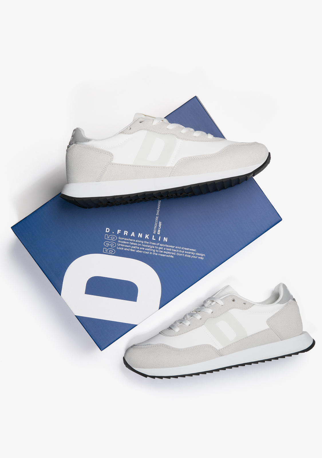 Unaffected by the passage of time. Created using synthetic materials. Sole in a combination of materials: TR skate for maximum traction and dual density EVA wedge for a firm and comfortable tread. Padded collar and cotton lace-up closure. Embossed D.Franklin logo on heel and emblem on side. Made for the city.
