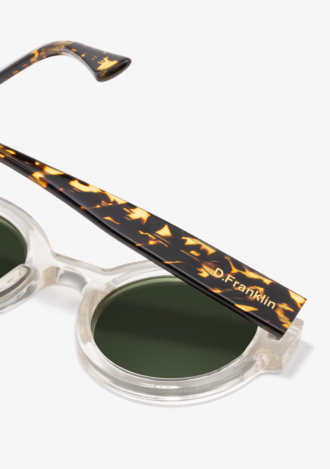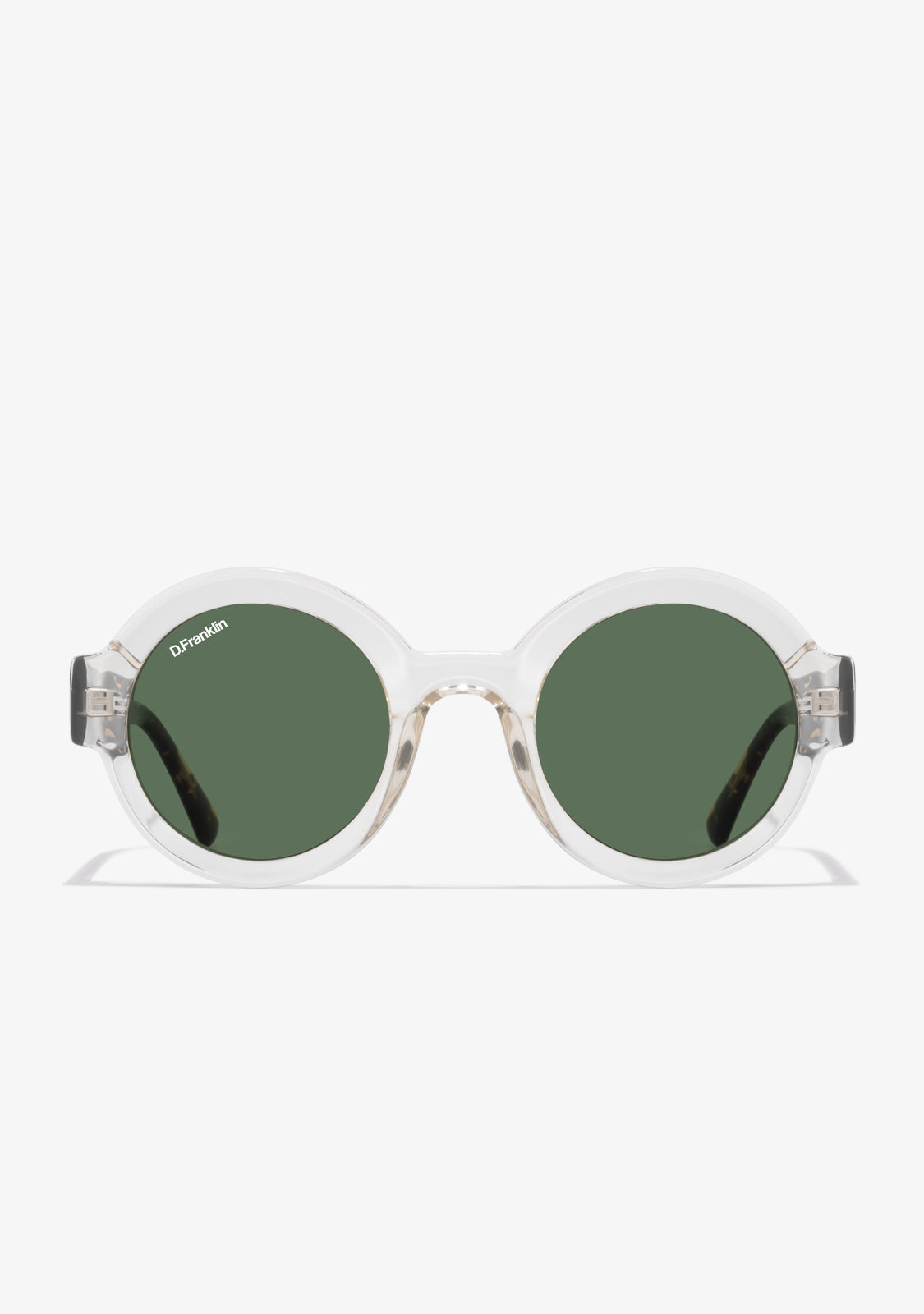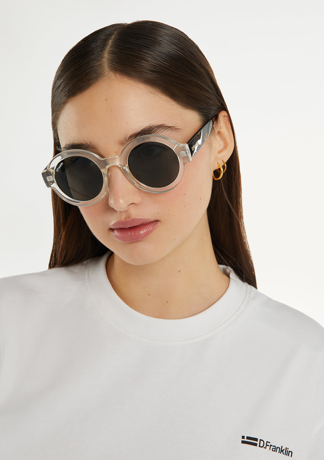 Round-frame sunglasses with a transparent finish in shades of green. A distinctive piece for your most daring outfits.