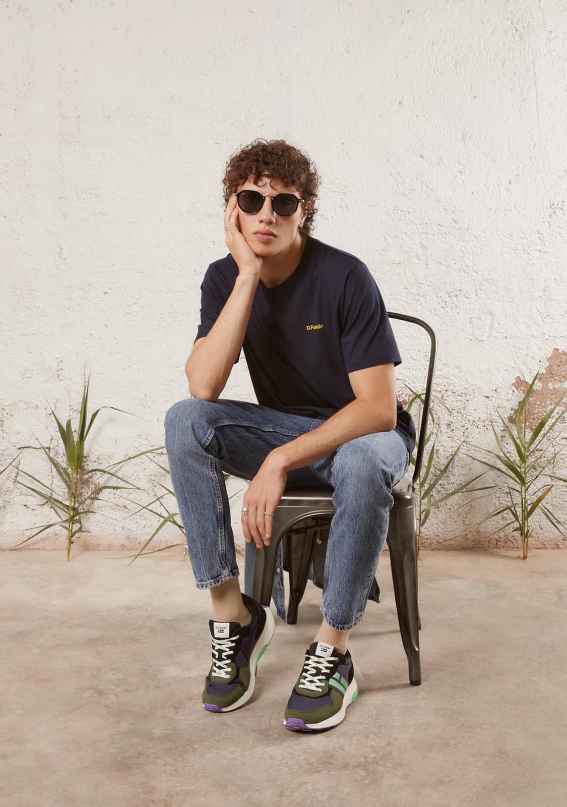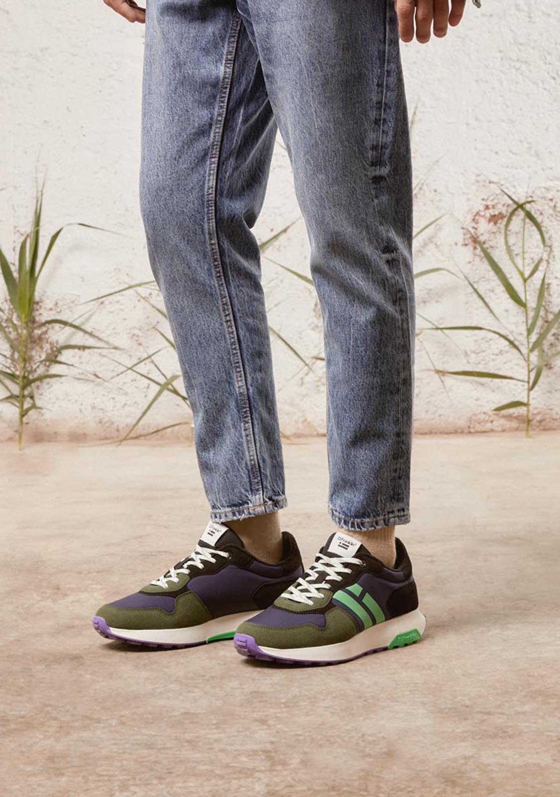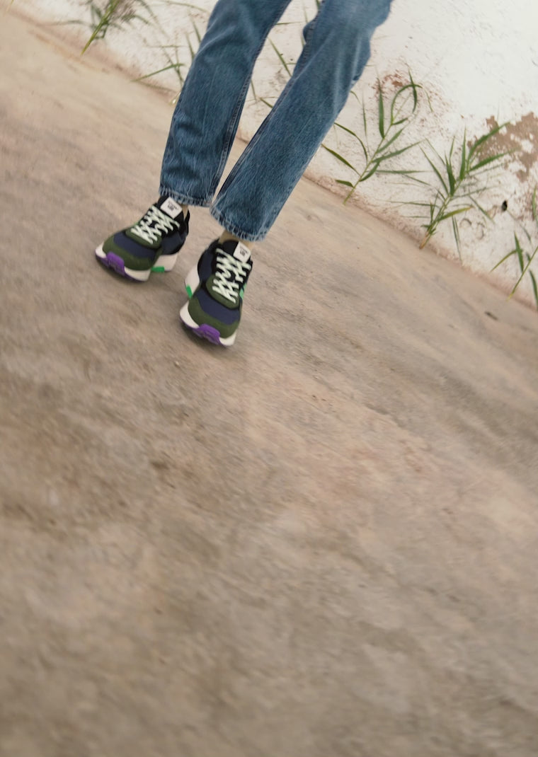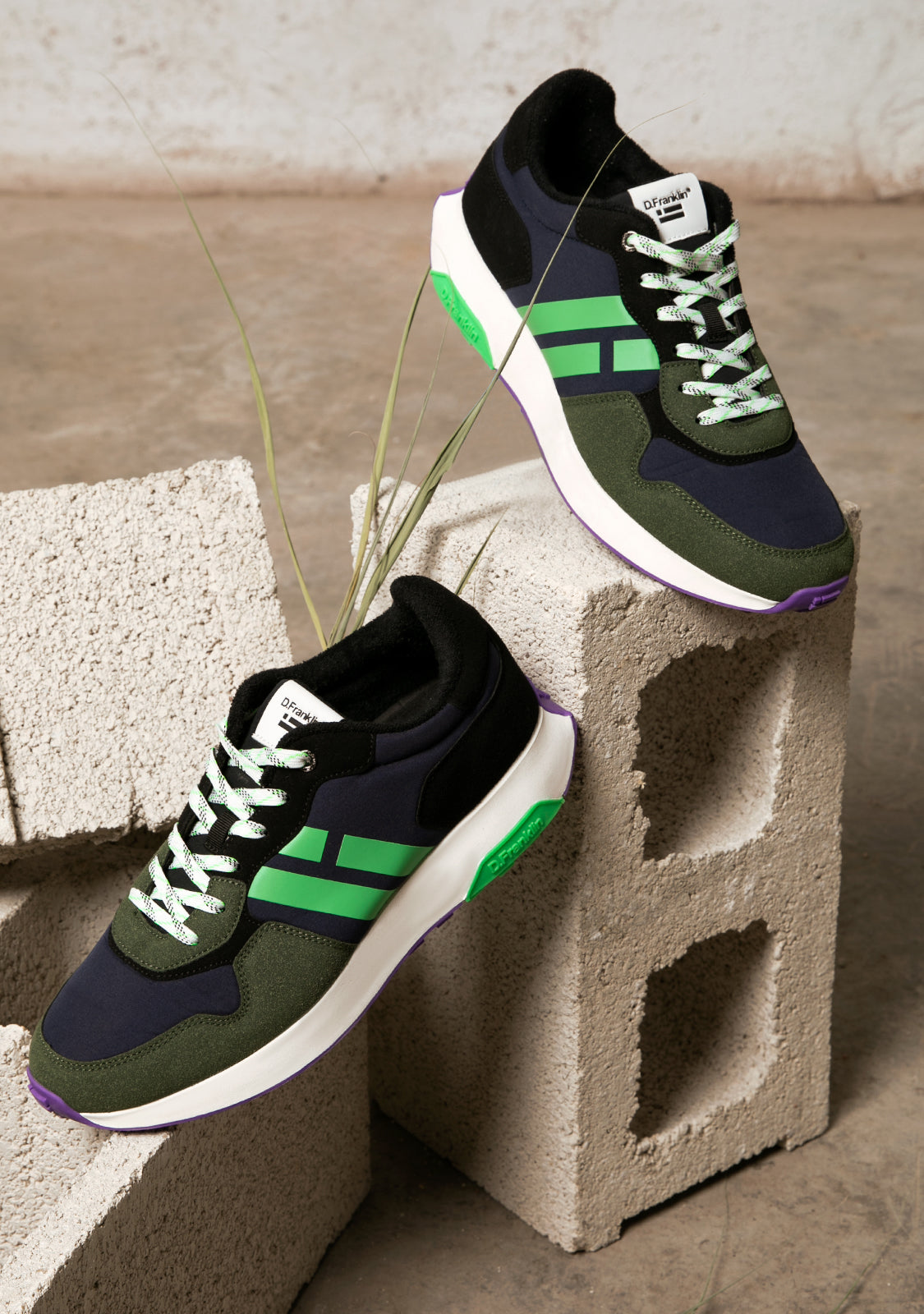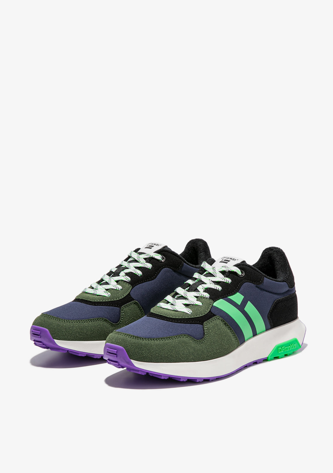 This model contrasts blue and green tones in a distinctive design. It features a D.Franklin flag on the side and trail laces for a perfect fit. It also features a two-tone sole with two densities. The first is made of recycled materials for a comfortable, lightweight ride, and the second is embossed for grip.