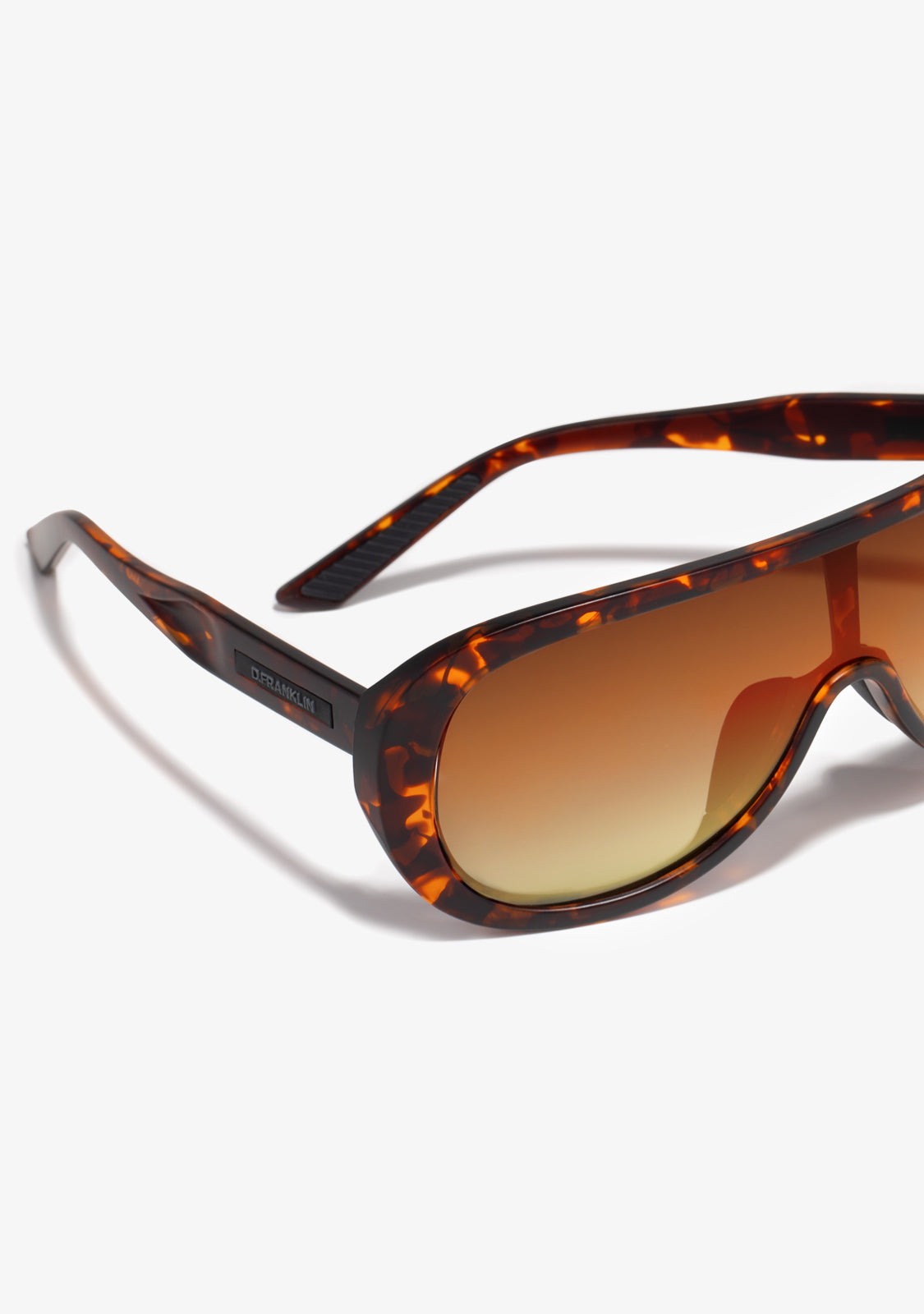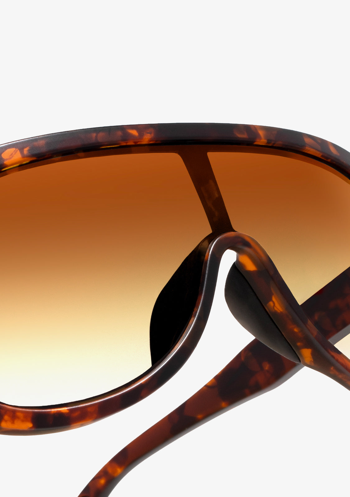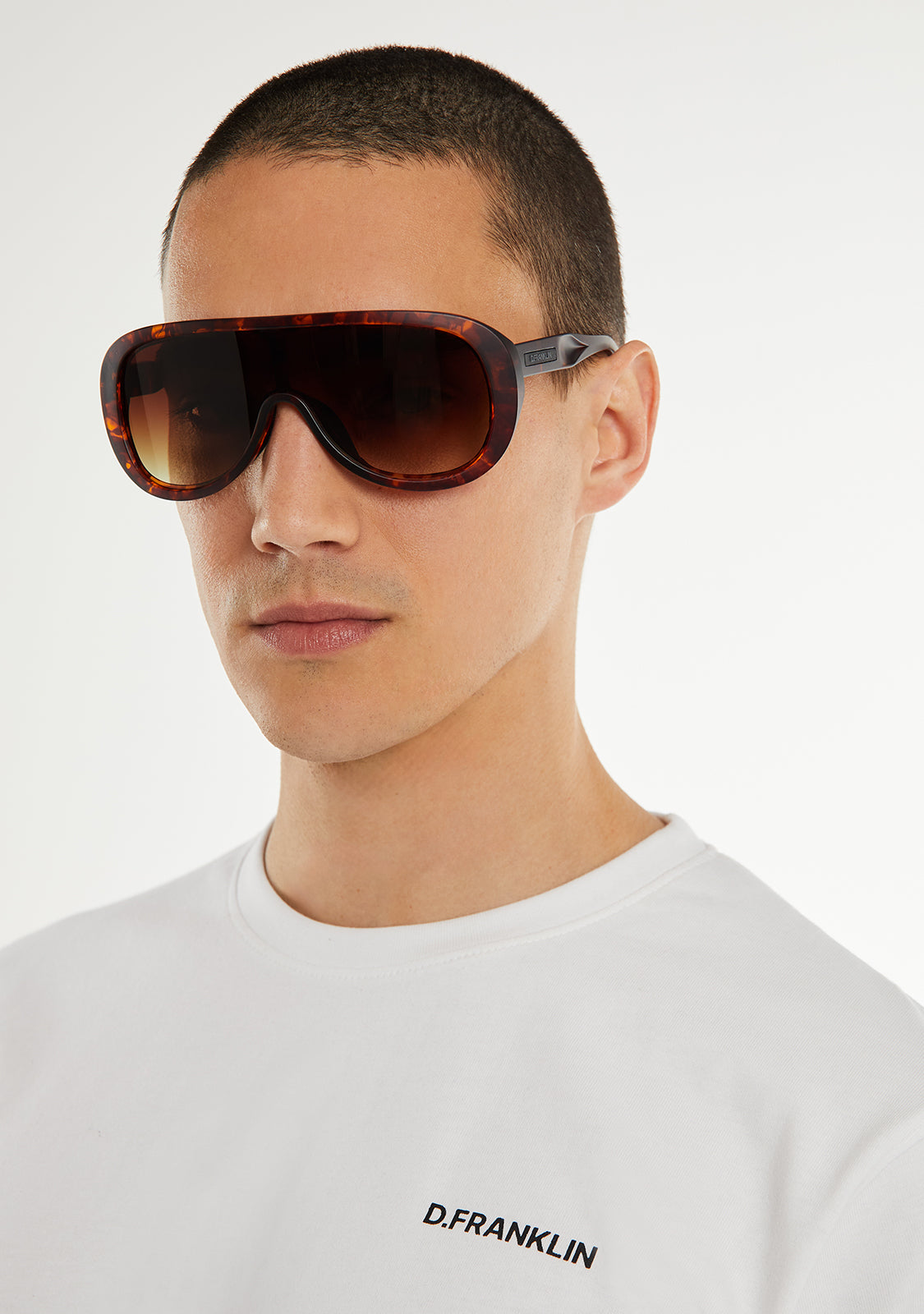 This model features a tortoiseshell frame with a slightly curved aesthetic. It features smoked lenses and our signature emblem on the side of the temples. The uniform 131mm lens width and 147mm front frame are joined by a 135mm temple.