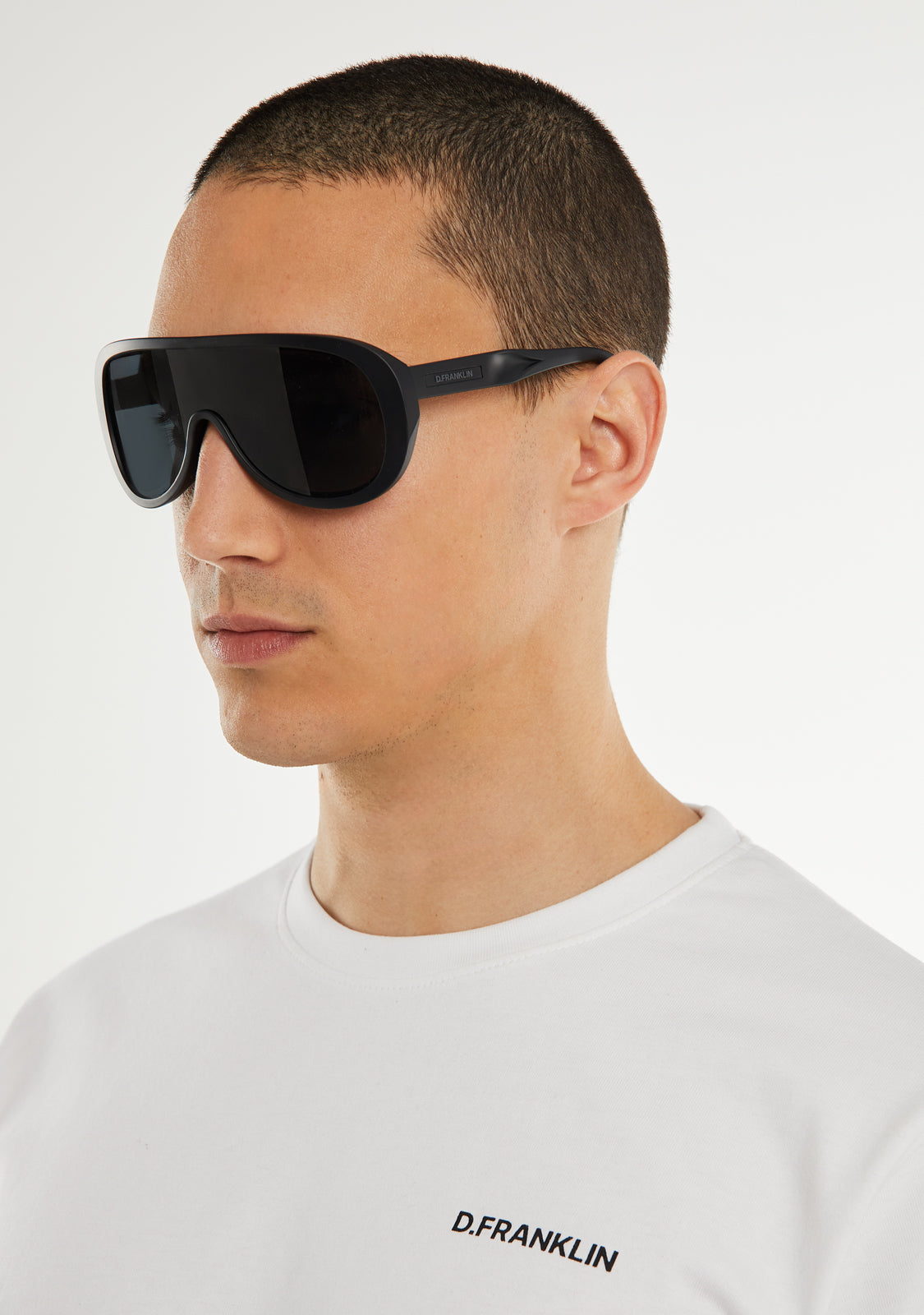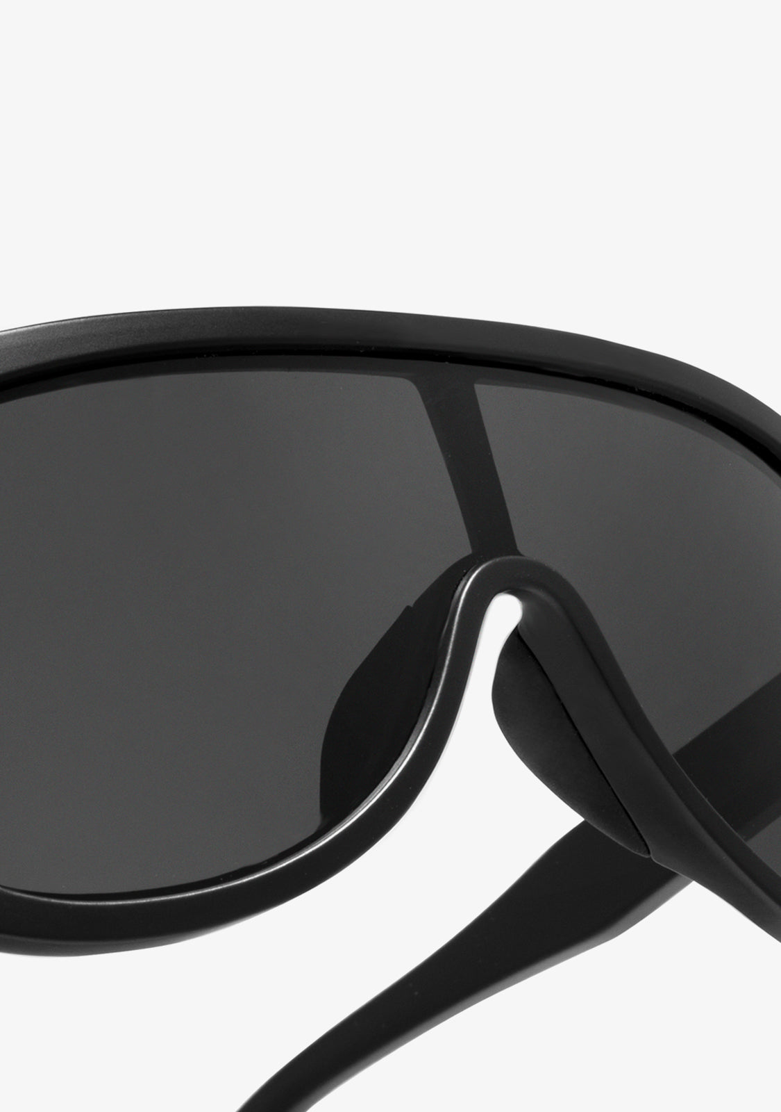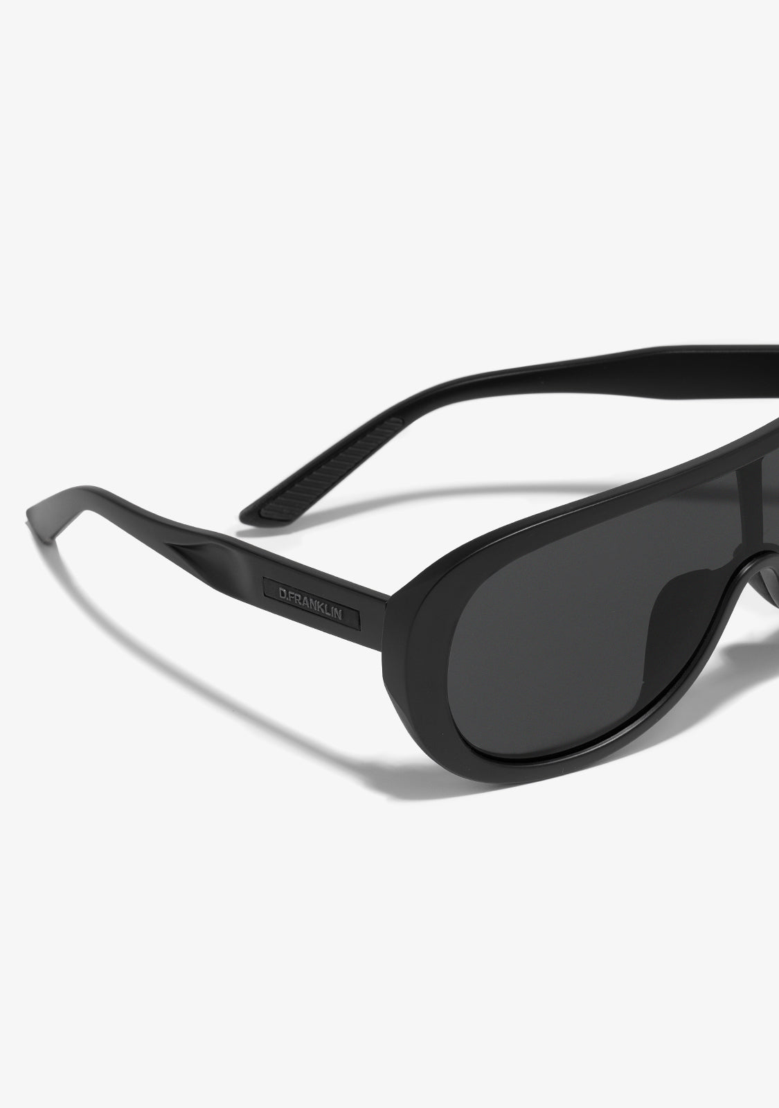 This model features a black matte finish frame with a slightly curved aesthetic. It features smoked lenses and our signature emblem on the side of the temples. The uniform 131mm lens width and 147mm front frame are joined by a 135mm temple.