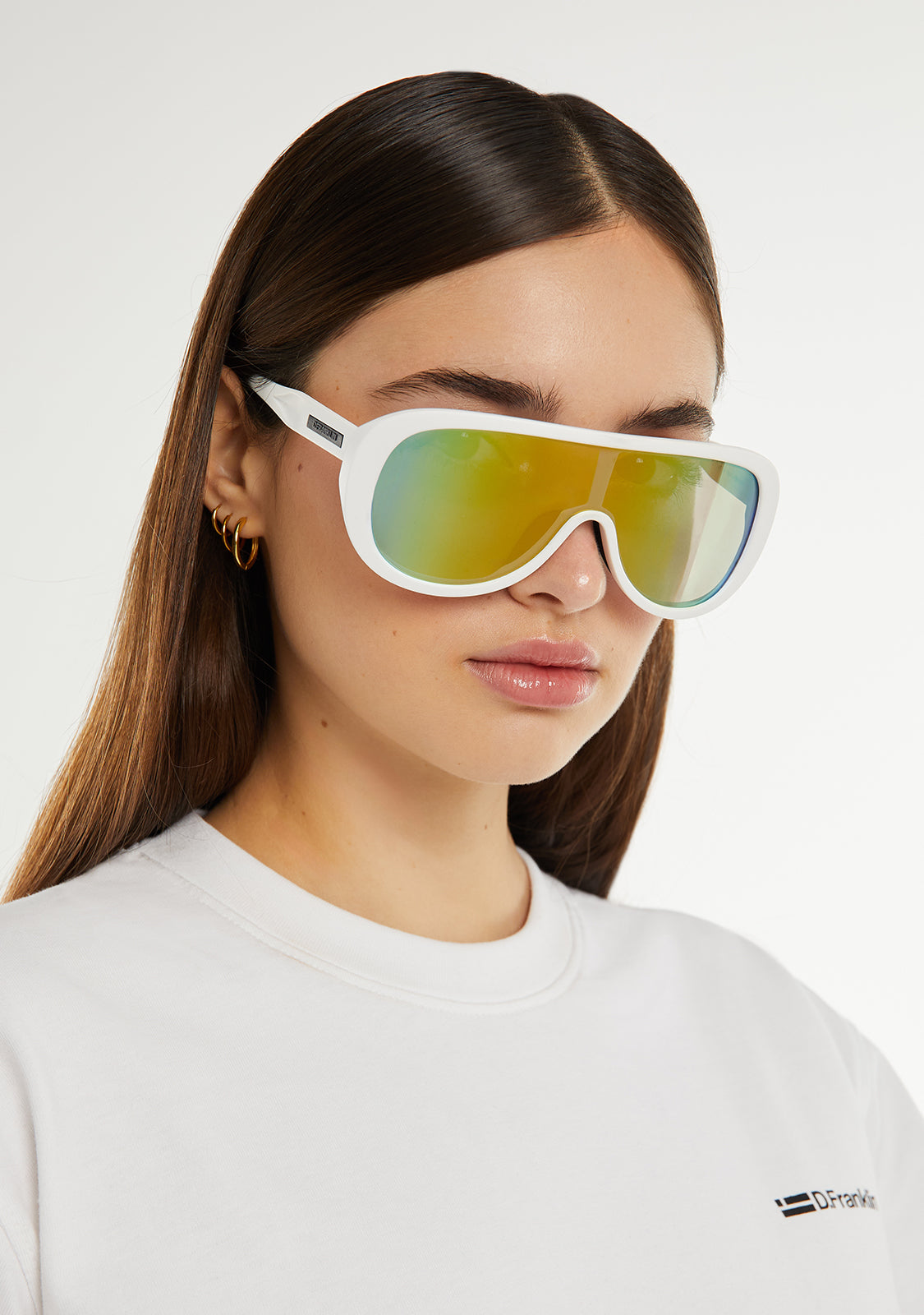 The frame has a white finish and a slightly curved aesthetic. It features yellow-tinted lenses and our signature emblem on the side of the temples. The uniform 131mm lens width and 147mm front frame are joined by a 135mm temple.
