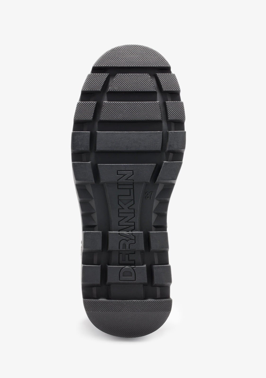 This D.Franklin model in black features an inner zipper on one side for a perfect fit. Its track-style sole provides unmatched grip. It features our logo and emblem embossed on the wedge and toe. Additionally, it has the iconic buckle details on the lower and upper part, adding to its characteristic aesthetic.