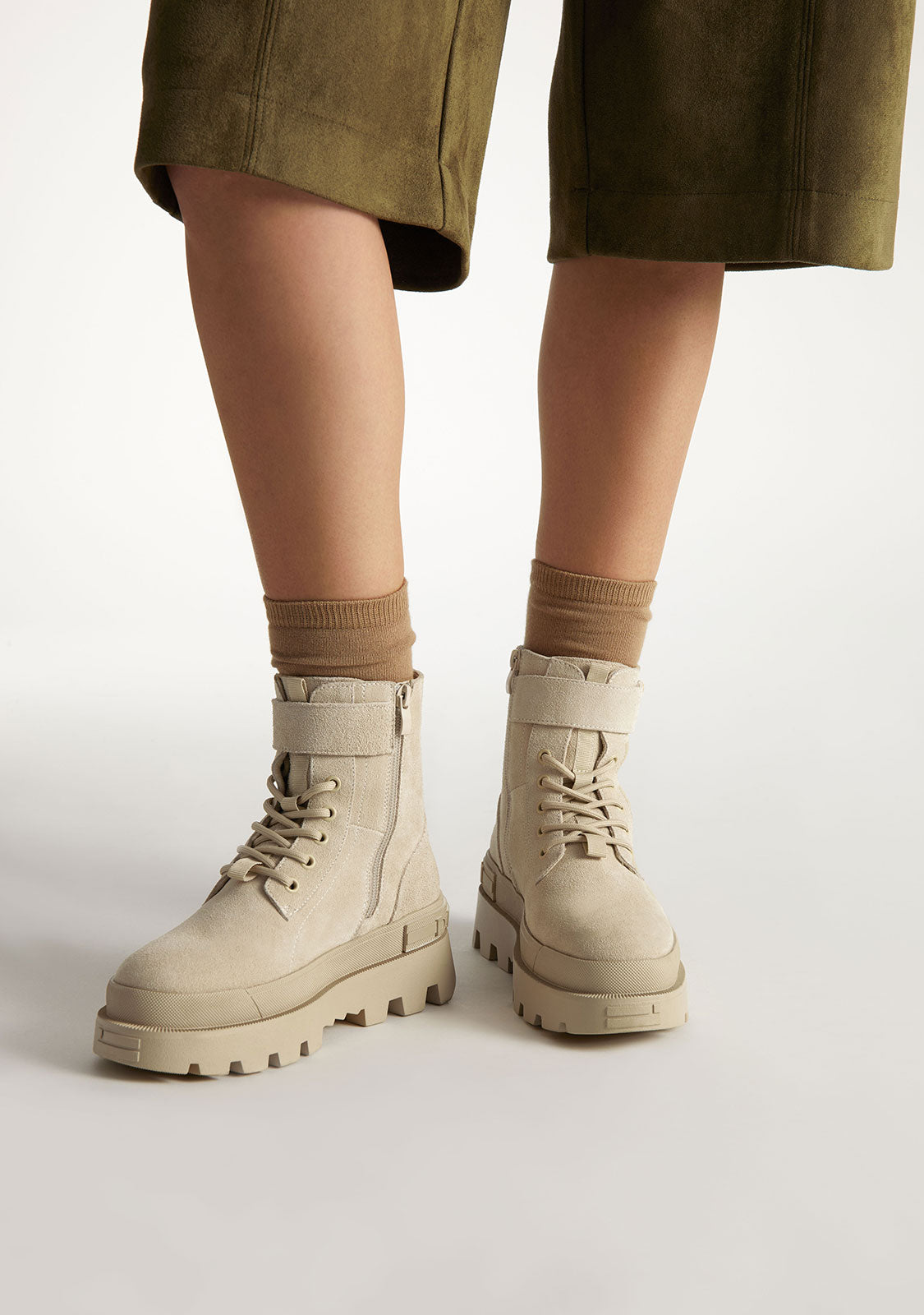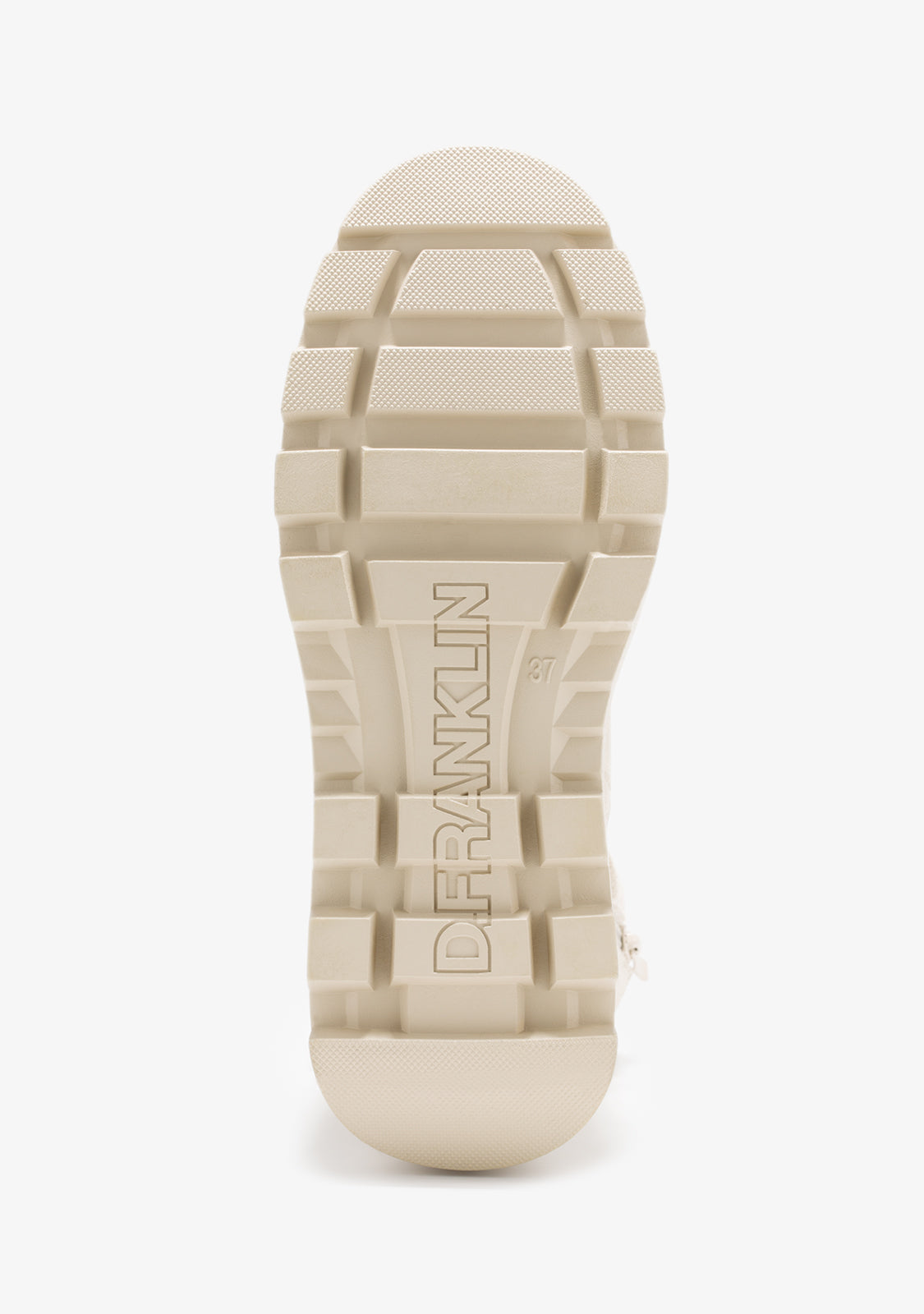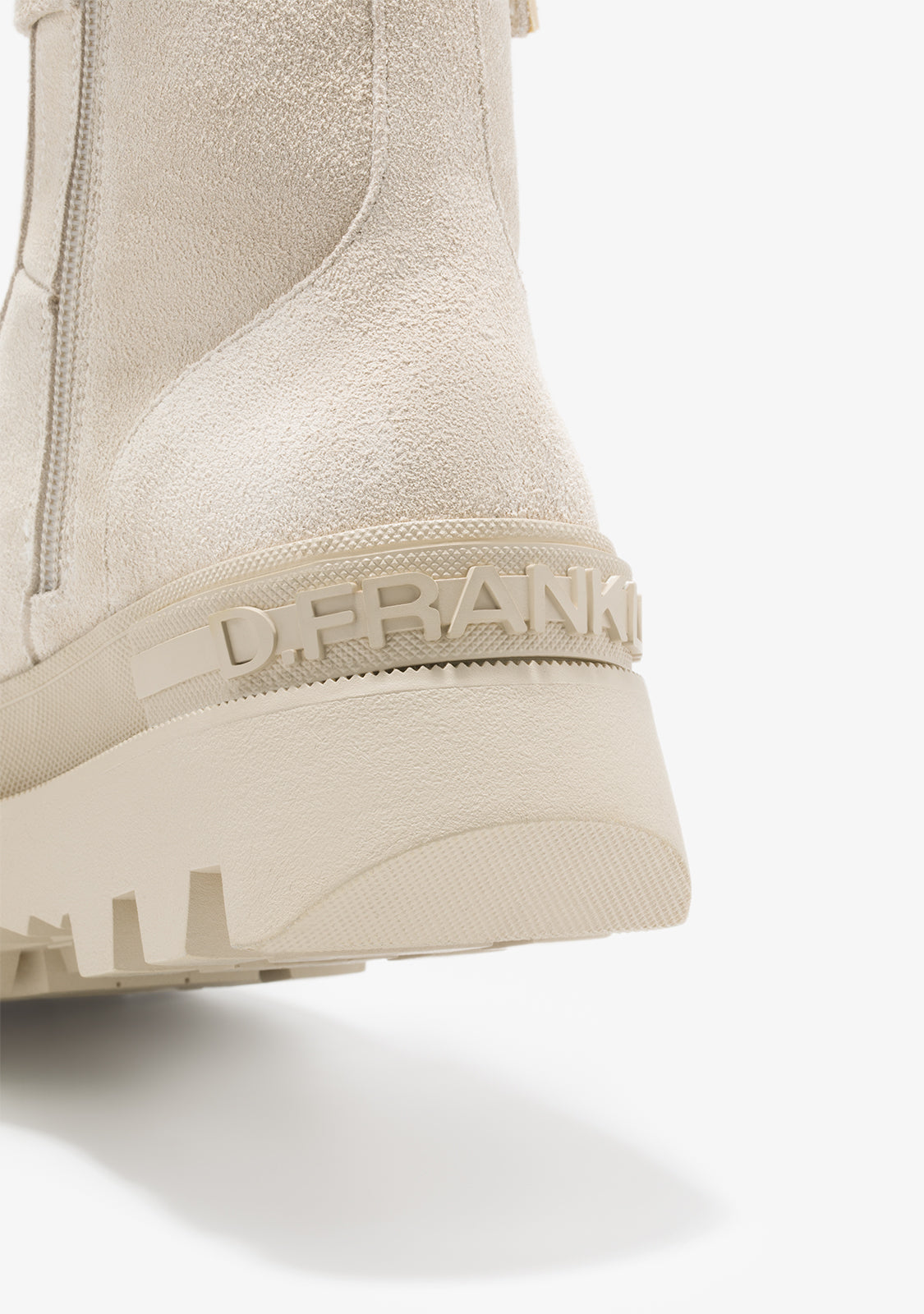 This D.Franklin model in beige features an inner side zipper and adjustable cotton laces. Its track-style sole ensures excellent grip and durability, while the logo and emblem are subtly embossed on the wedge and toe.