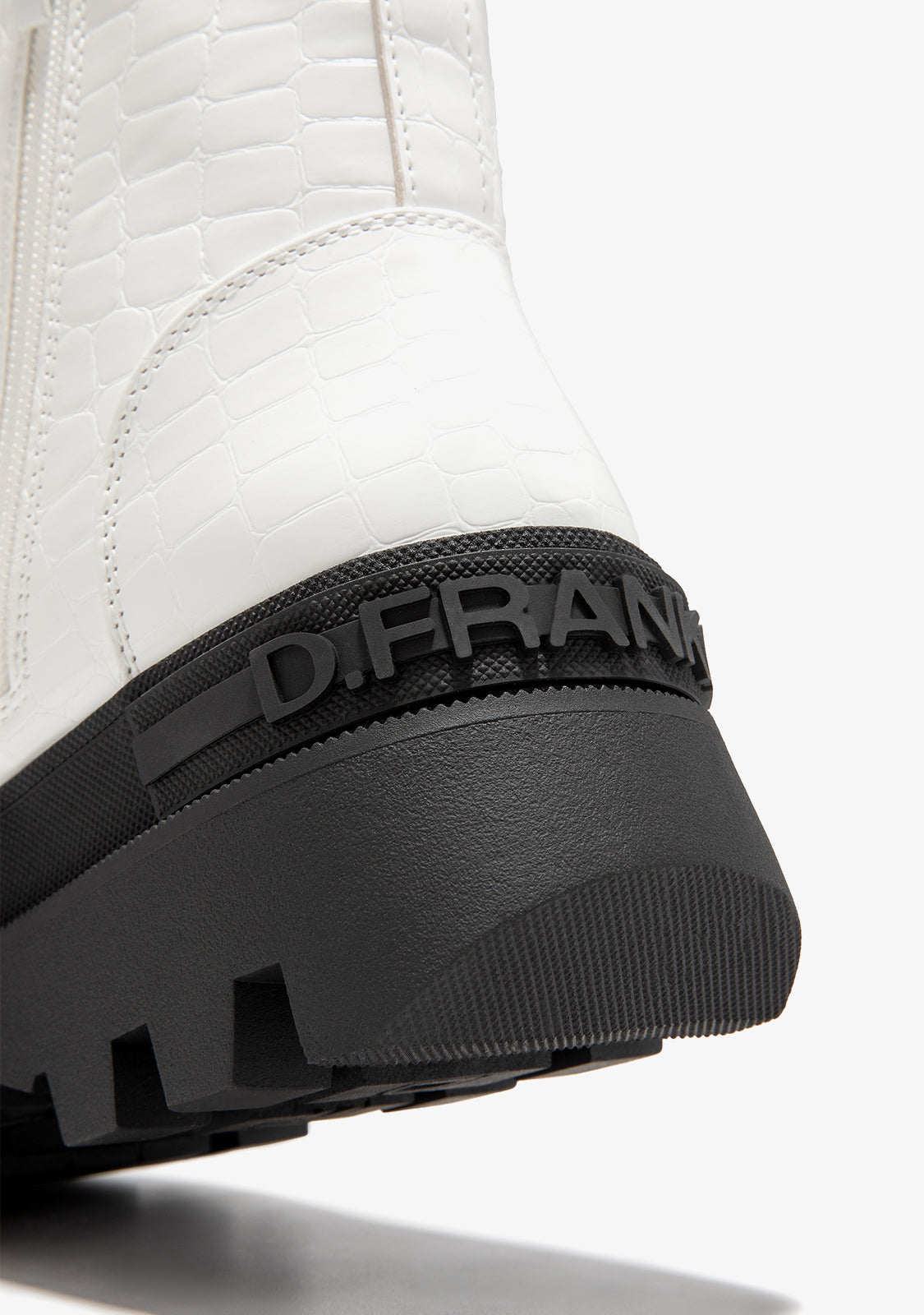 This D.Franklin model in white with a textured finish features an inner zipper on one side and adjustable cotton laces. Its track-style sole provides unmatched grip. It also features our logo and emblem embossed on the wedge and toe.