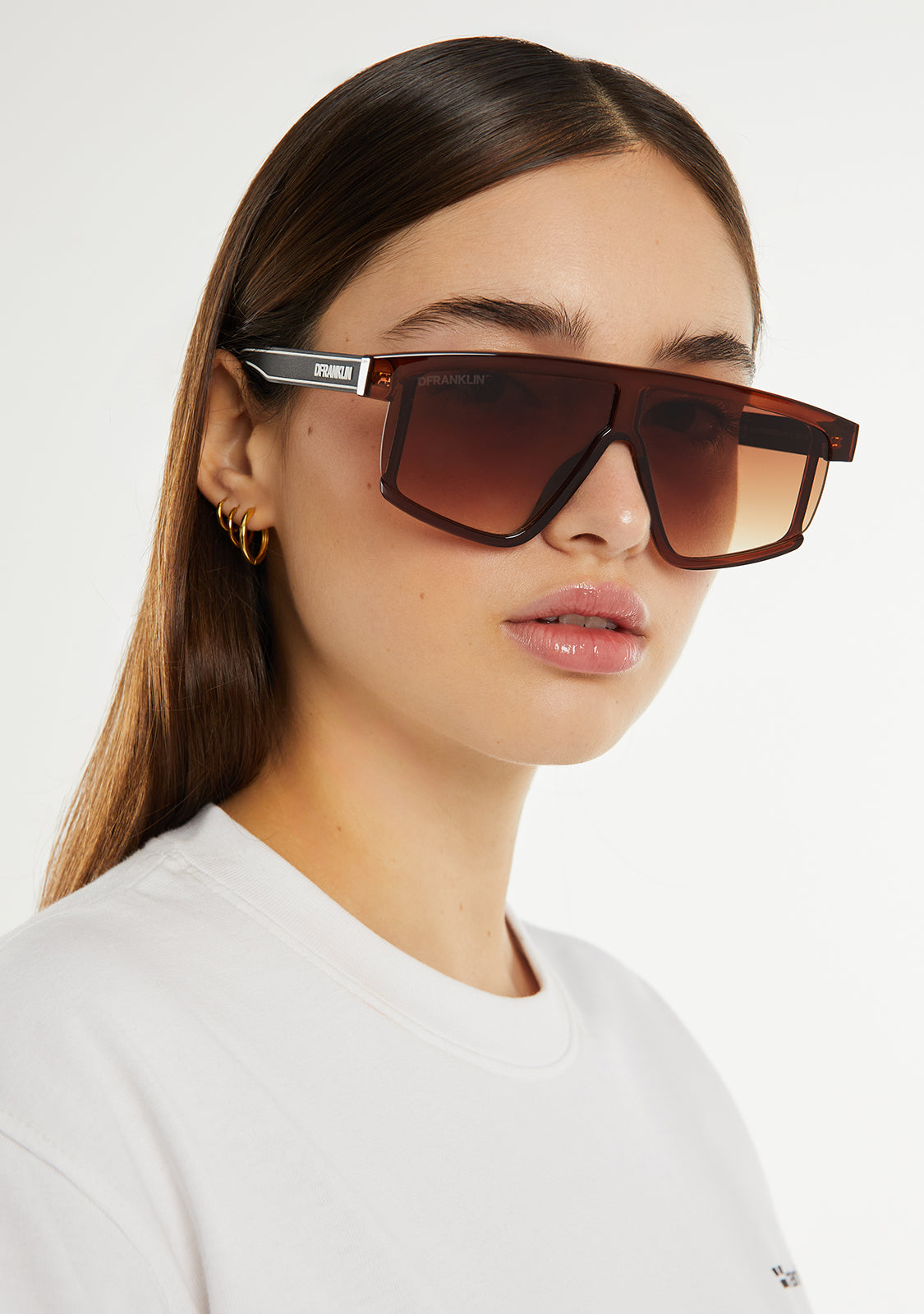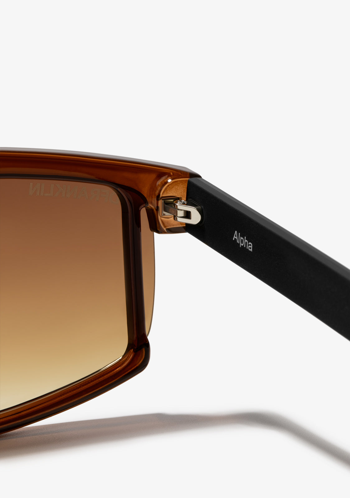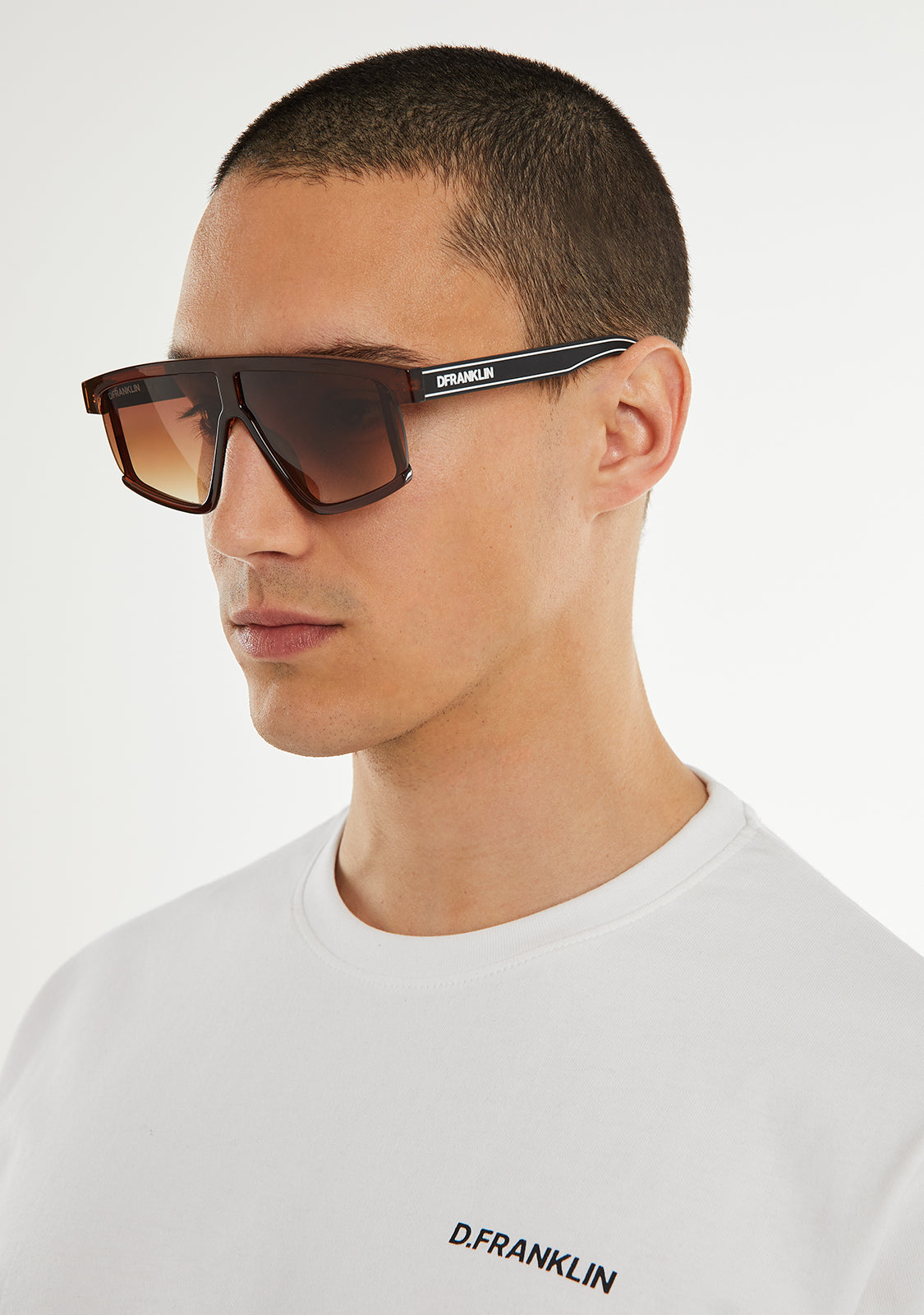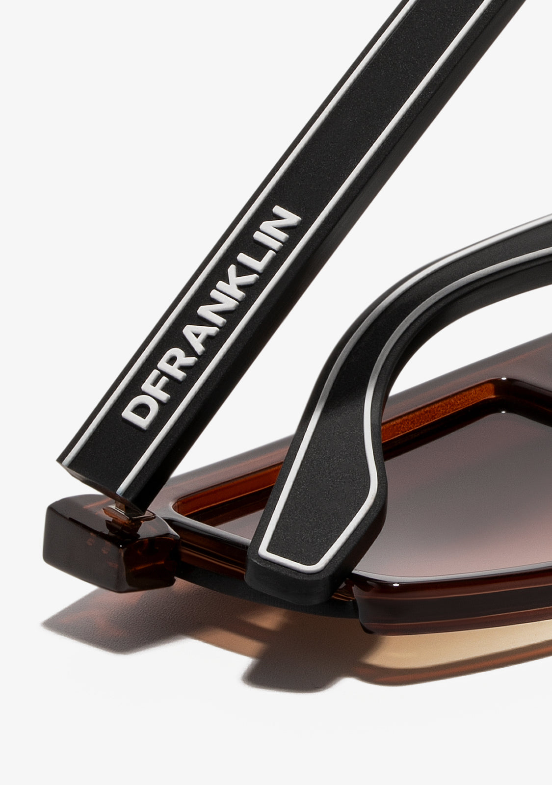 Brown tinted polycarbonate lenses and matching frame highlight the uniqueness of this model. Featuring our signature D.Franklin details: engraved logo on the temples and emblem on the right lens. With a lens width of 65.5 mm and a 152 mm front frame, these glasses will suit most faces. The side temples are 150 mm long.