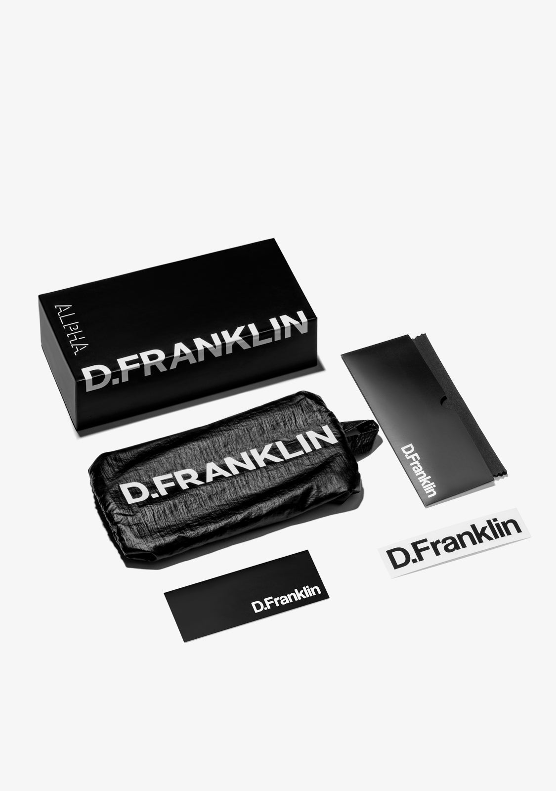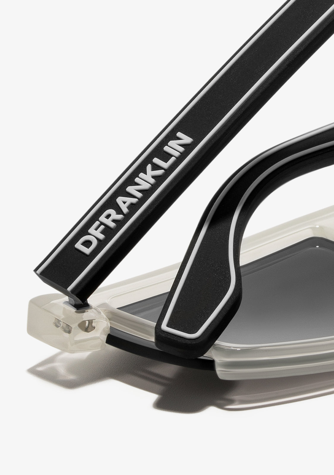 Black tinted polycarbonate lenses and a clear frame highlight the uniqueness of this model. Featuring our signature D.Franklin details: engraved logo on the temples and emblem on the right lens. With a lens width of 65.5mm and a 152mm front frame, these glasses will suit most faces. The side temples are 150 mm long.
