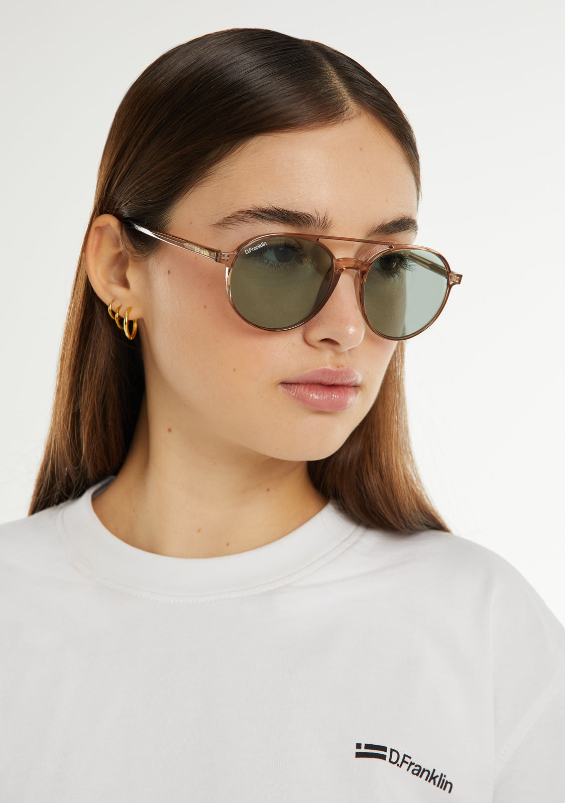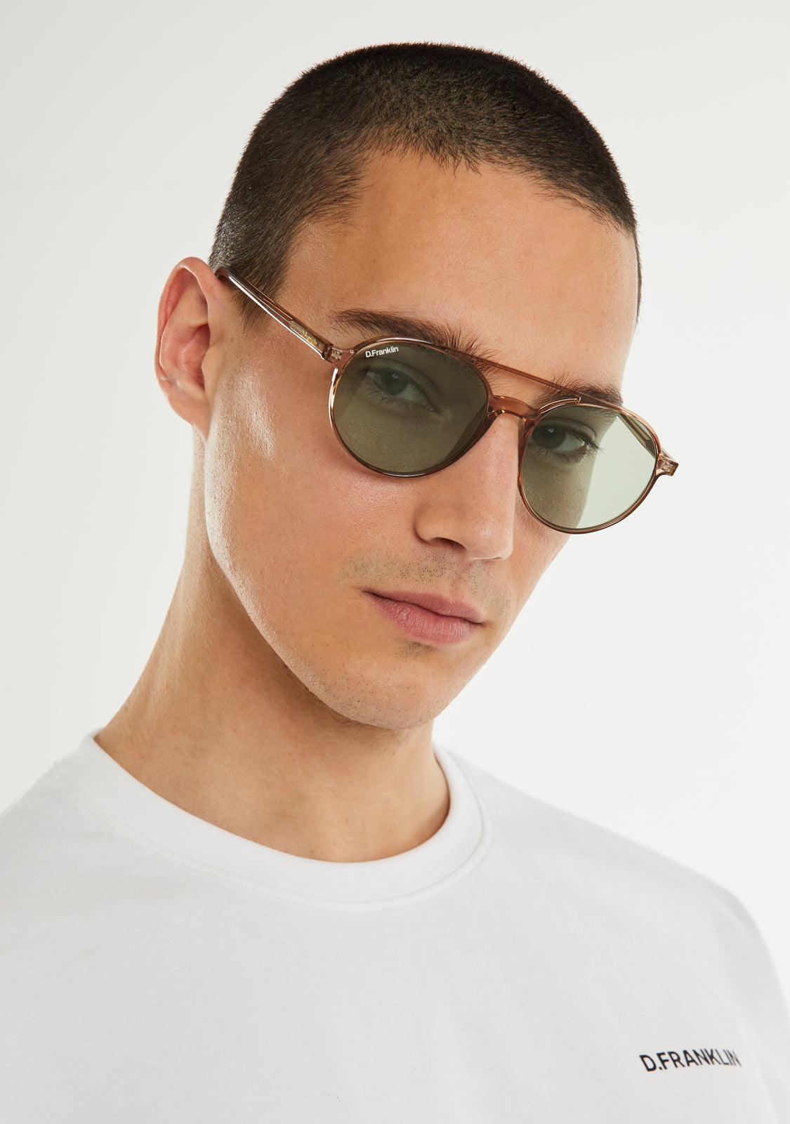 Our America model in olive green features the distinctive details of the D.Franklin brand, the logo engraved on the temples and the emblem on the lens. The lens width is 54 mm and the front is 139 mm. The side temples have a length of 145 mm.