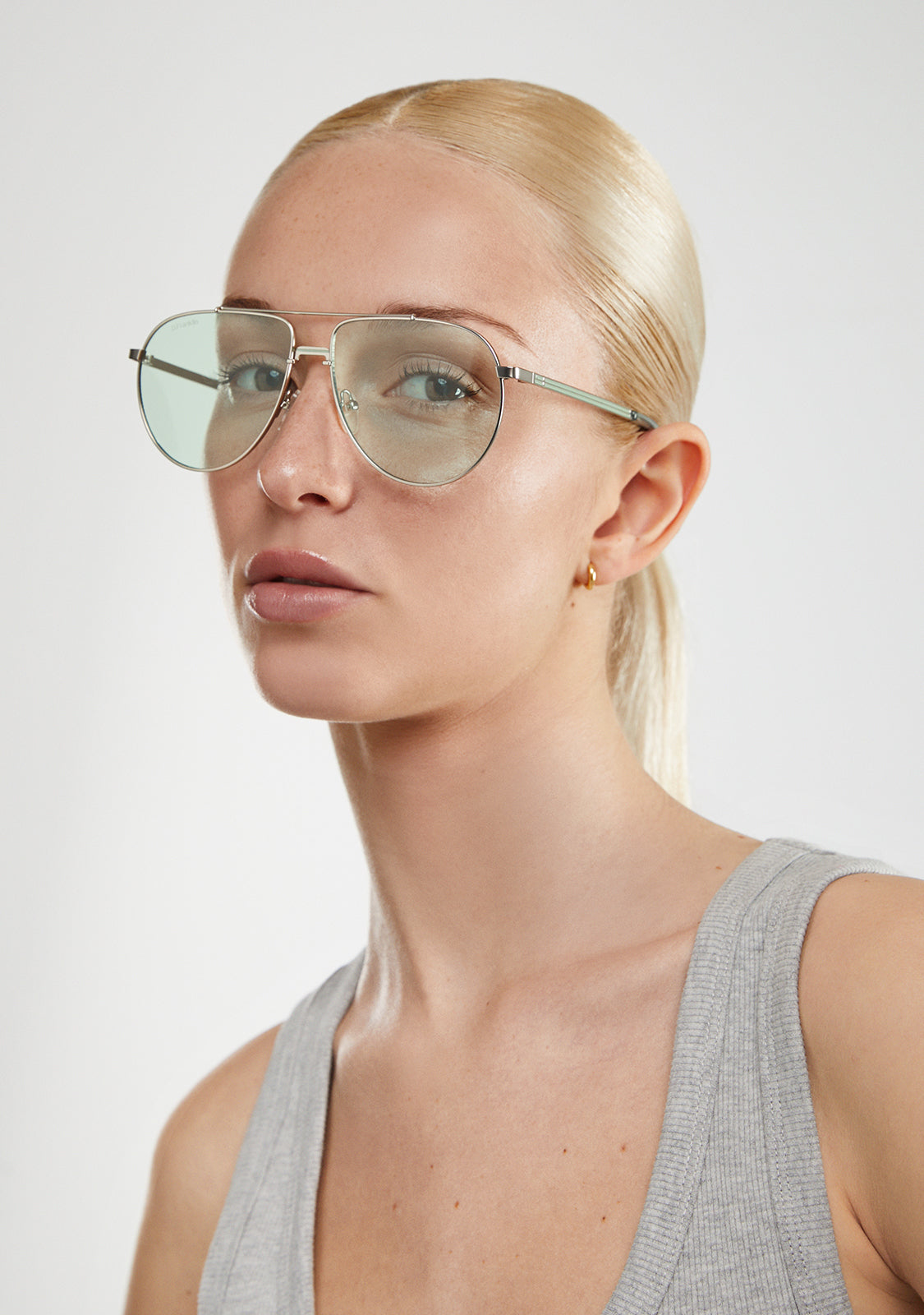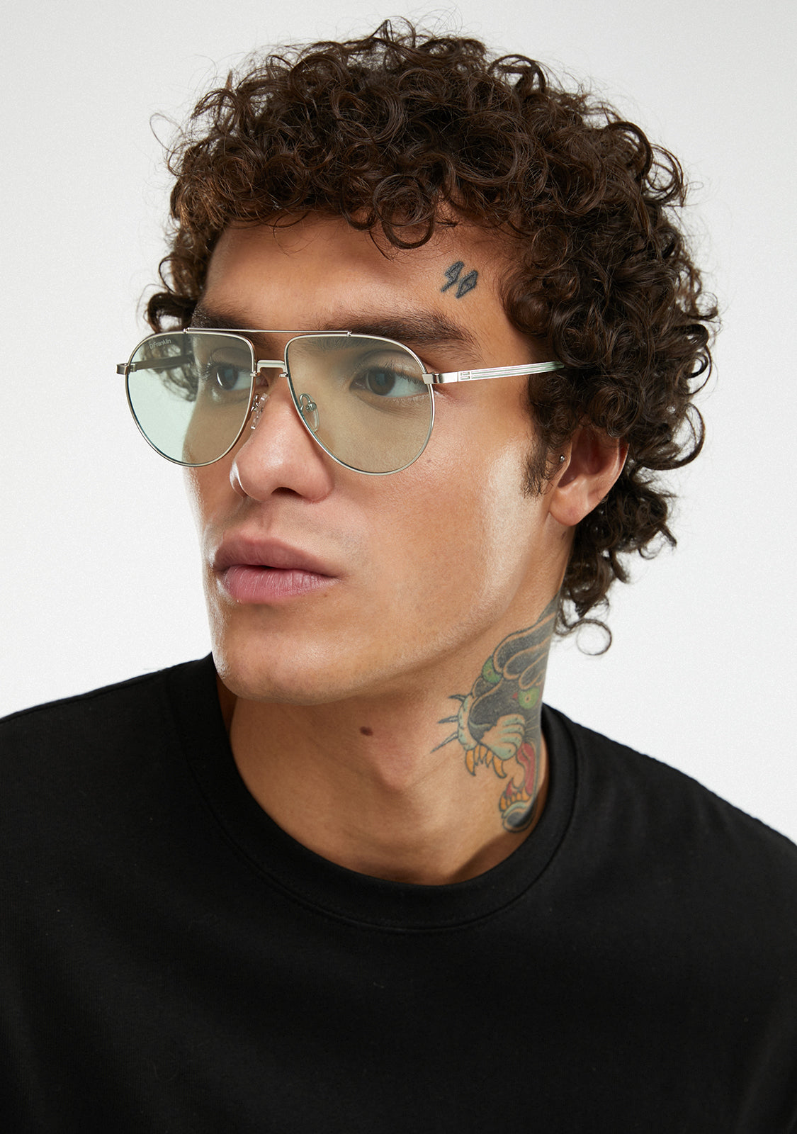 Smoked lenses tinted in a light green hue and a metallic silver frame reinforce its unmistakable aesthetic. This model features our emblem on the right lens and logo on the side of the temples. It also has a 140 mm front frame and 60 mm lens width, which fits most faces. The temples are 140 mm long.In addition, this design has a Rim Lock system that allows the lenses to be replaced with prescription lenses. Ultraviolet protection UV 400 cat. 0.