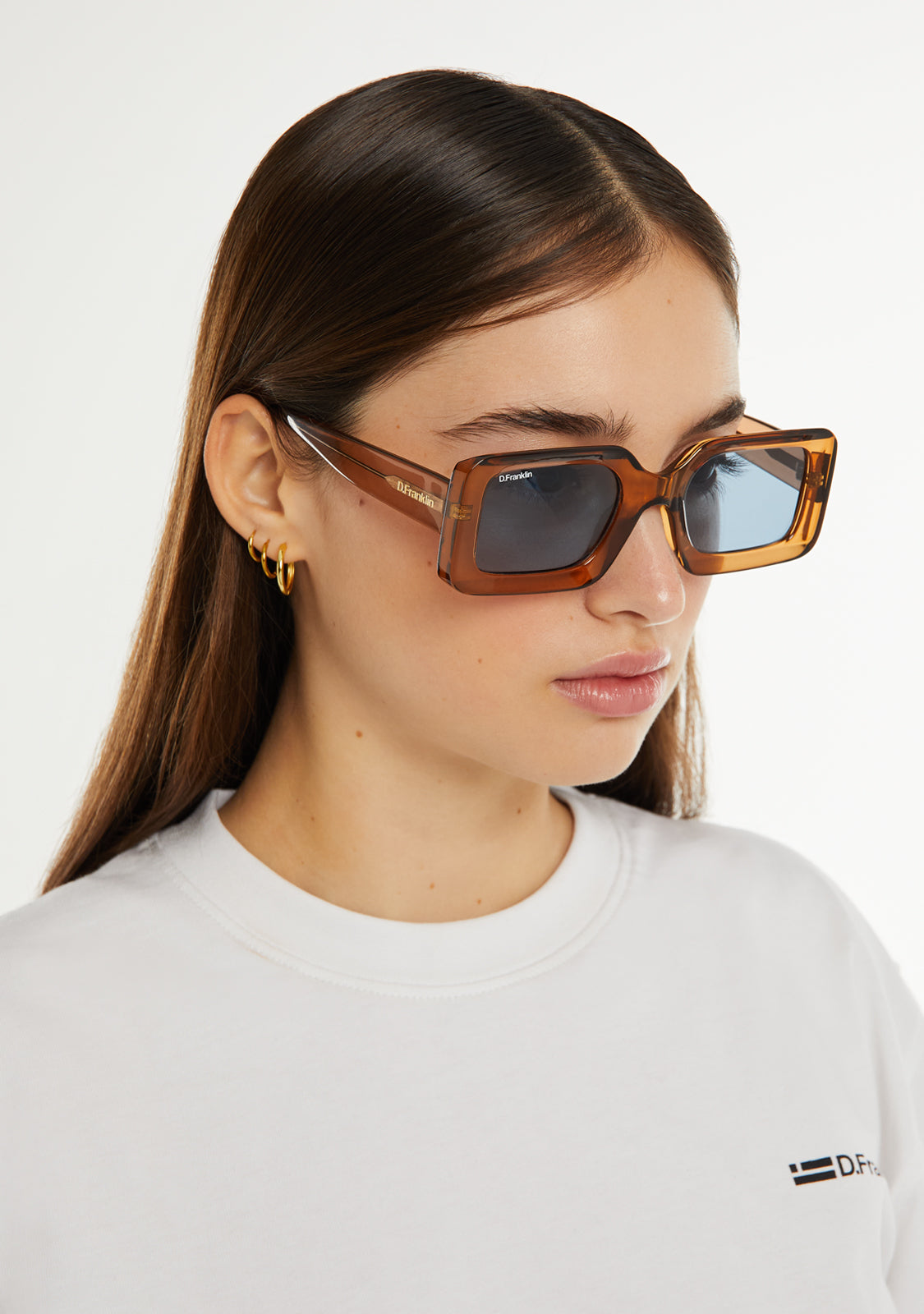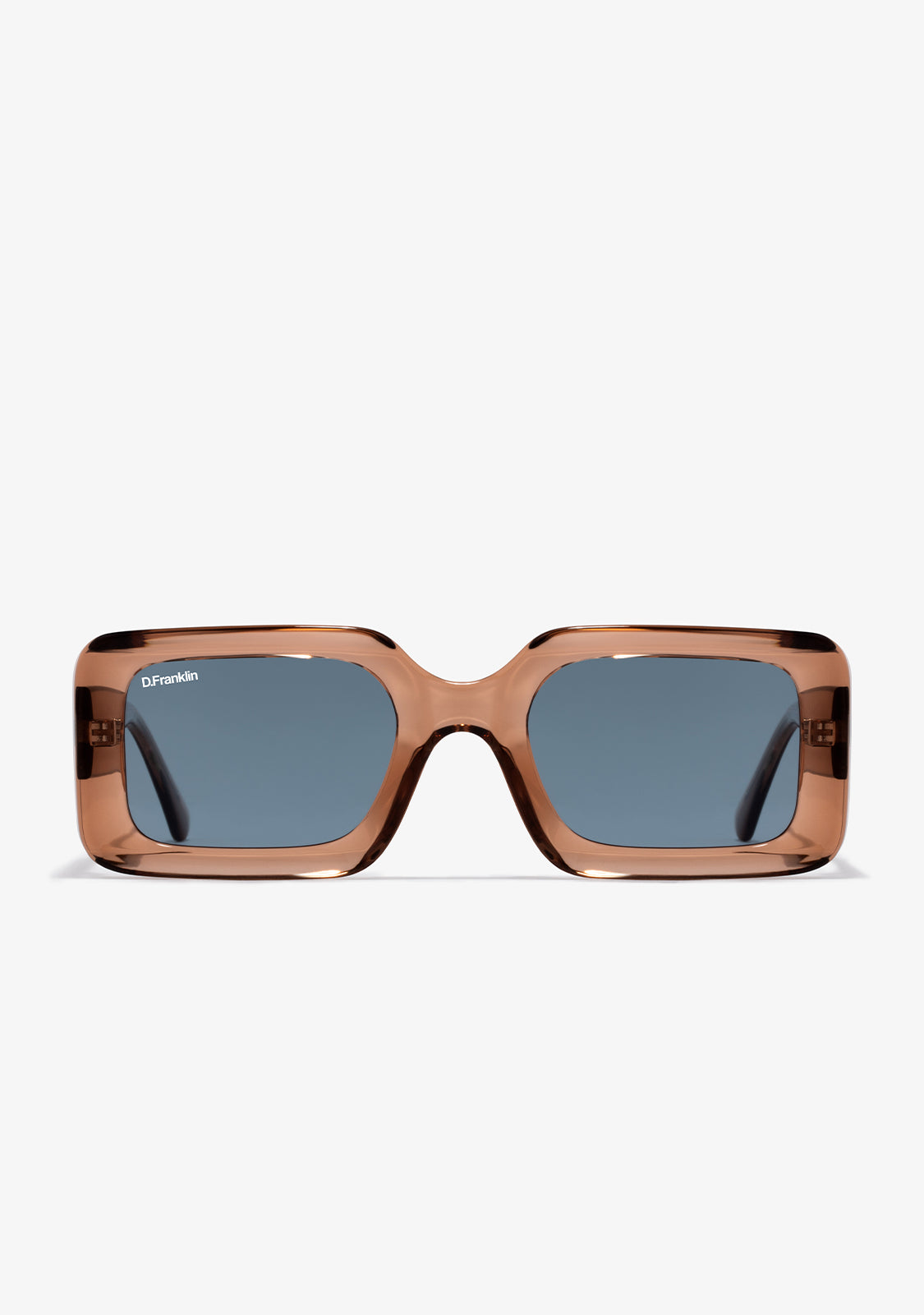 Sunglasses with rectangular frames and transparent finish in brown. Inspired by the landscapes of the places we want to travel.