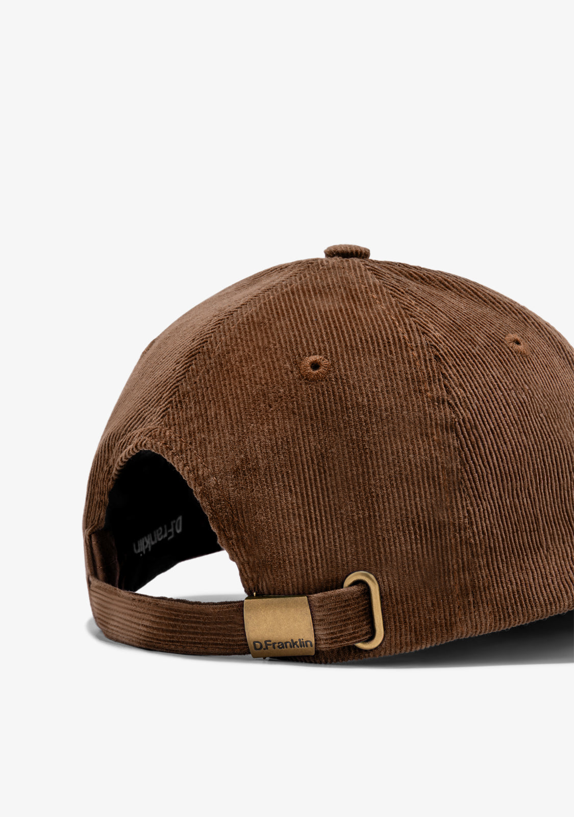 Cap designed in brown corduroy cotton with a D.Franklin emblem embroidered on the visor in beige contrast. It also features an adjustable snapback strap system with a metal buckle on the back.