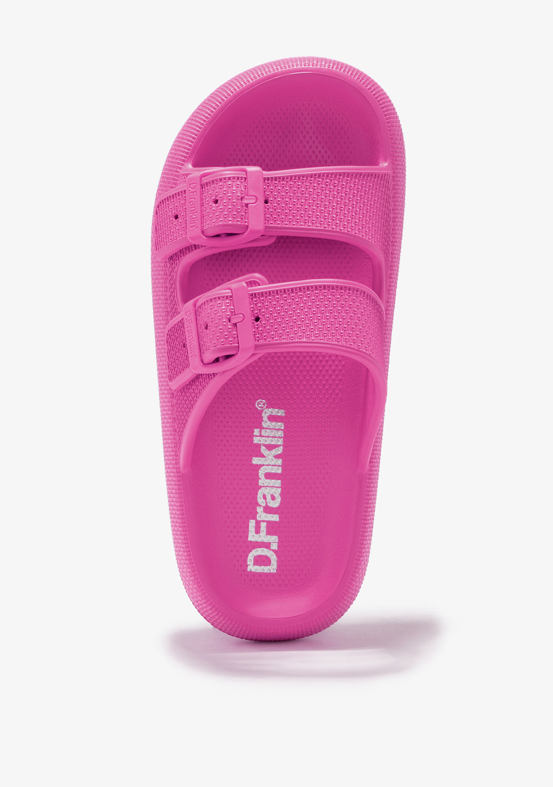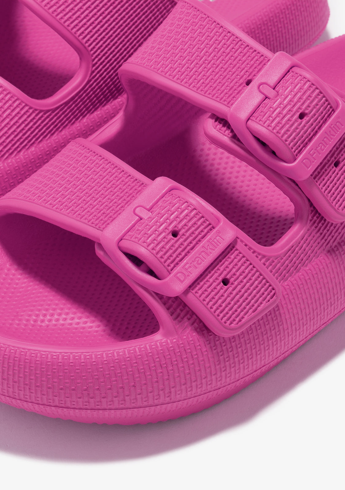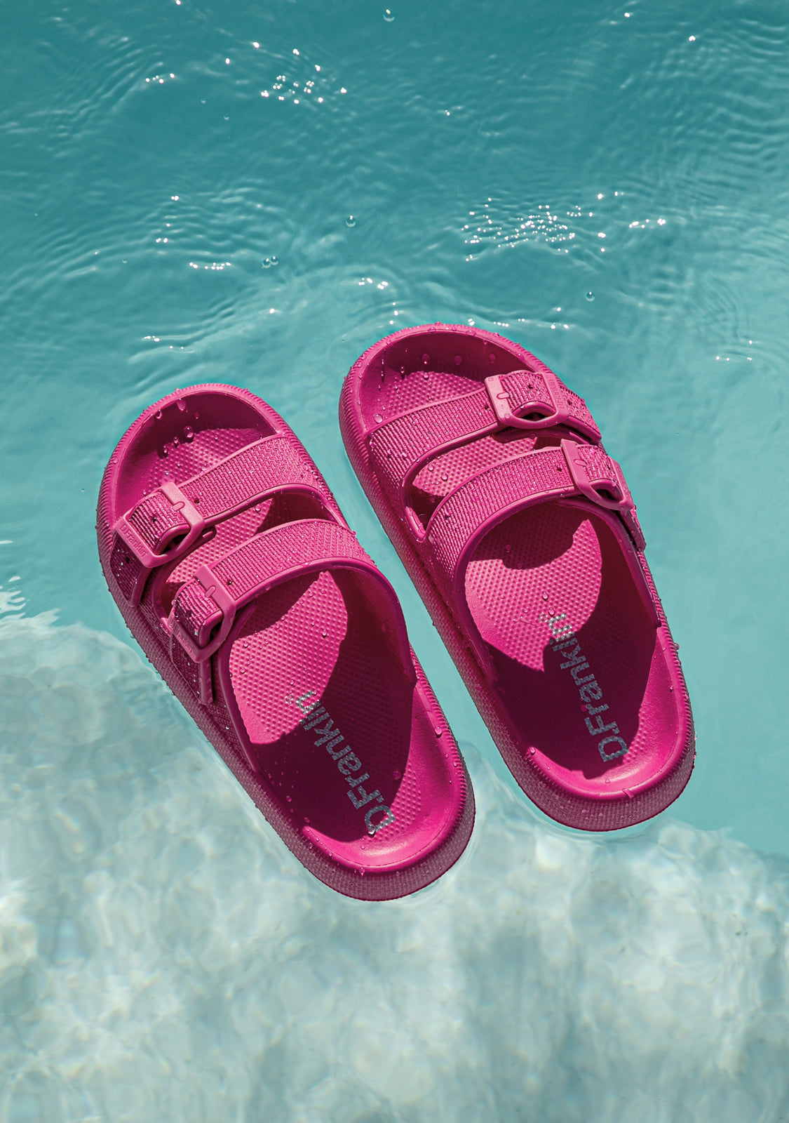 The corals discovered in the depths of Paradise Island, Maldives give color to this sandal. Made with EVA for a lightweight feel. Designed with a rounded silhouette and double buckle closure in coral color. D.Franklin logo on the sole. Bloomer Bio sandals run slightly small. We recommend choosing one size larger than your usual size.