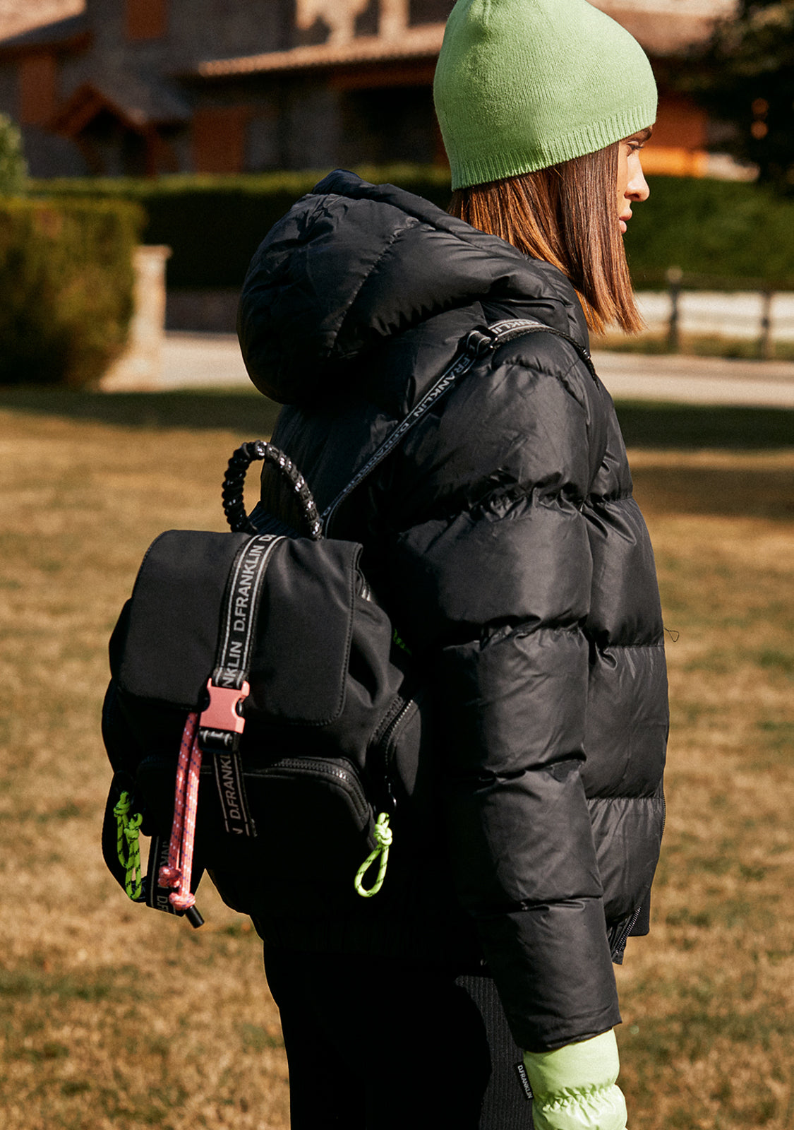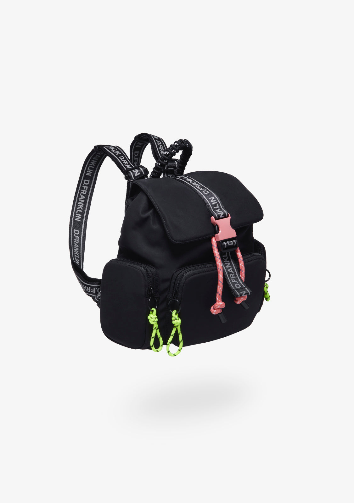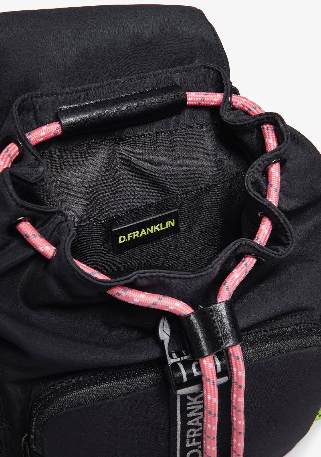This black design is made of 100% polyester, while its interior has a cotton lining. It has small contrasting details in lime and fuchsia tones that give it a unique and differentiating touch. It also features a clasp closure and adjustable straps.