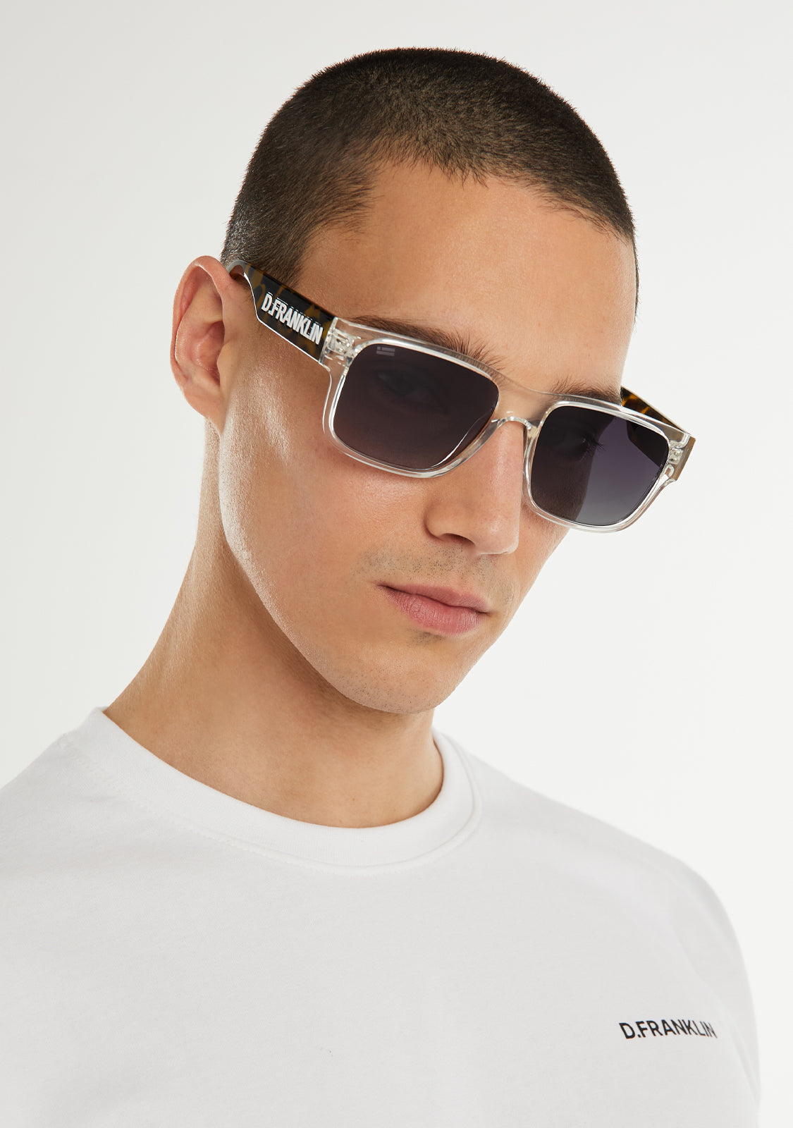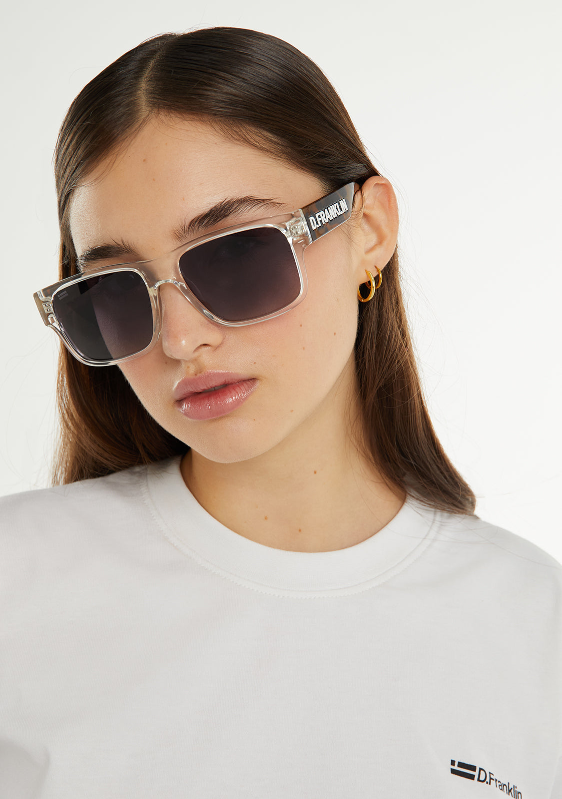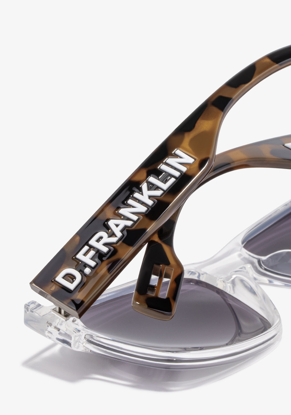 D.Franklin California sunglasses. A model designed in transparent and with vibrant details. Created with our signature D.Franklin details: logo engraved on both temples and emblem on the right lens. The lens width is 57 mm and the front lens width is 148 mm. Side temples are 145 mm long.