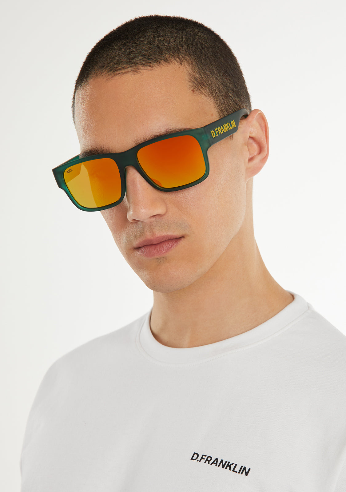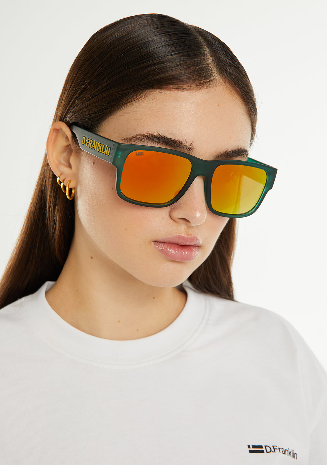 D.Franklin California sunglasses. A model designed in green tones and vibrant details. Created with our signature D.Franklin details: logo engraved on both temples and emblem on the right lens. The lens width is 57 mm and the front lens width is 148 mm. Side temples are 145 mm long.