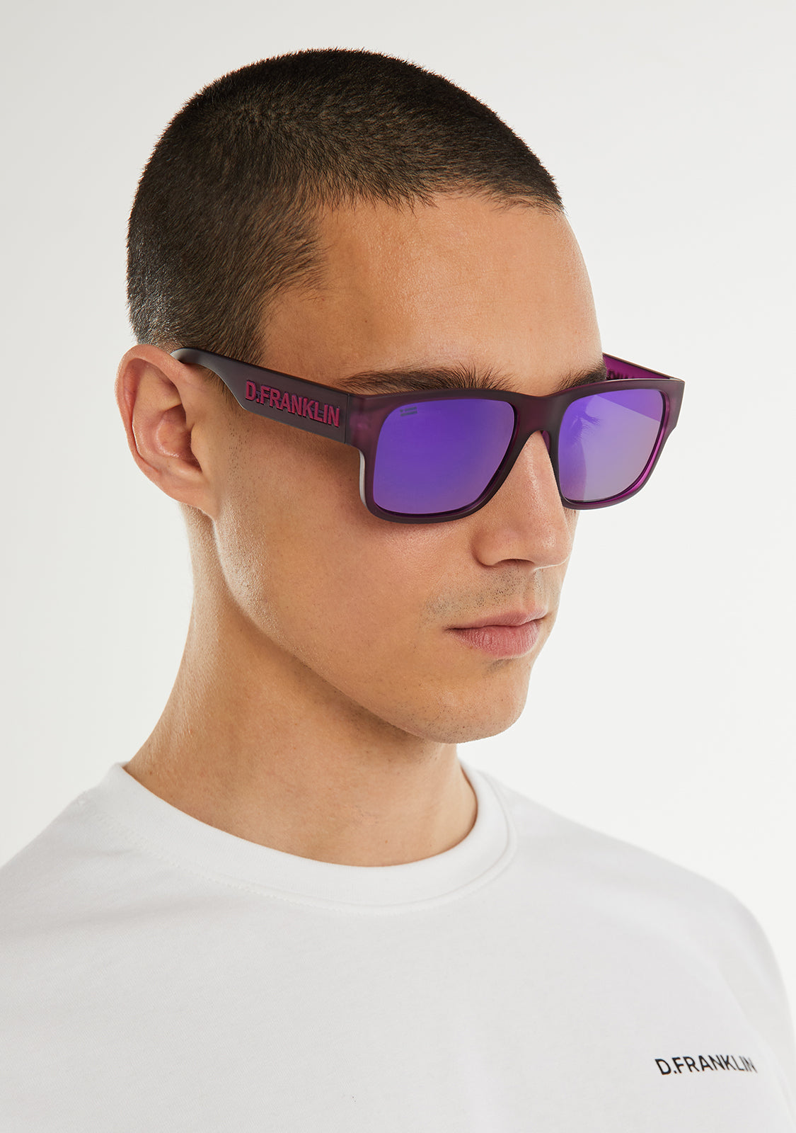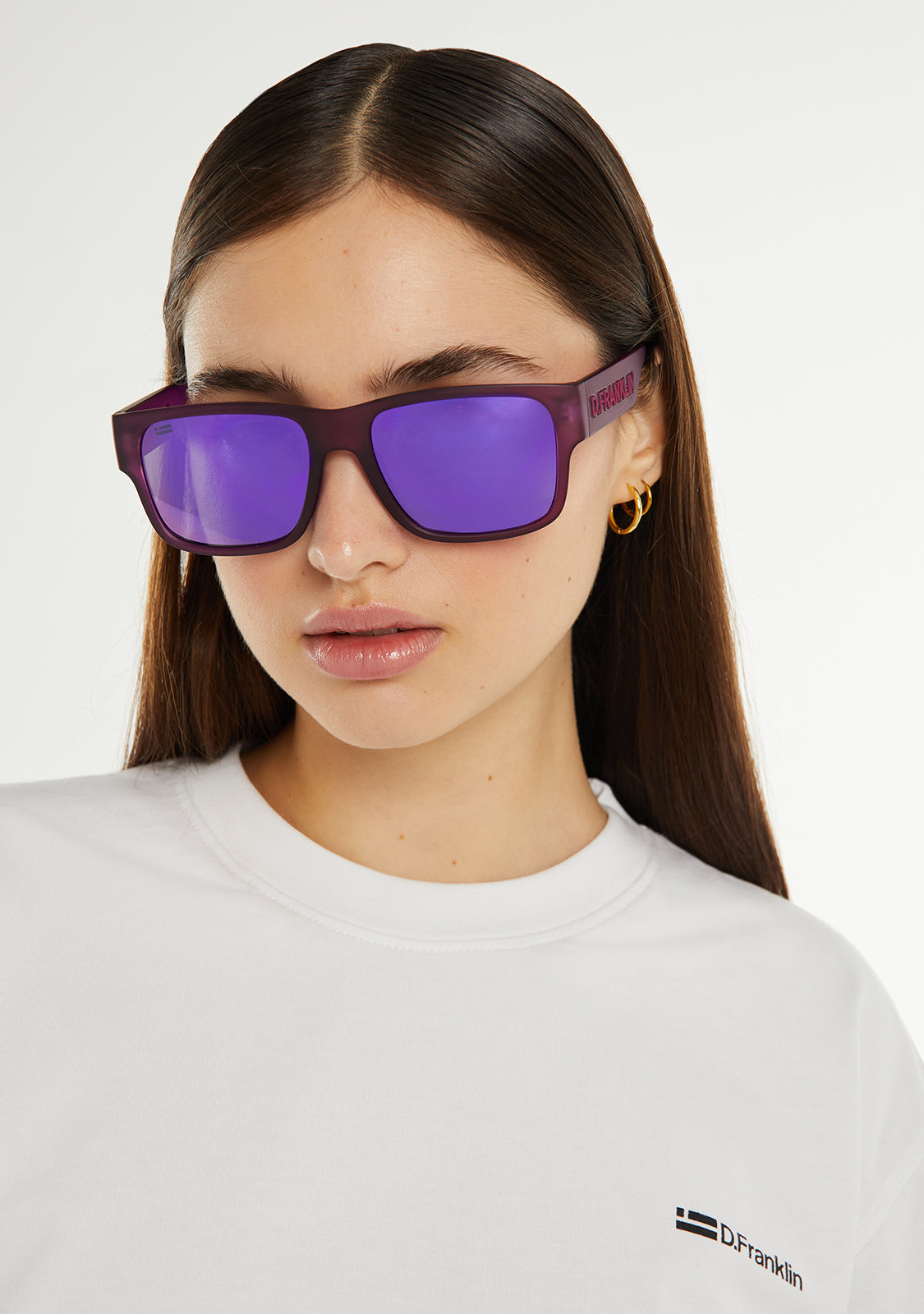 D.Franklin California sunglasses. A model designed in purple tones and vibrant details. Created with our signature D.Franklin details: logo engraved on both temples and emblem on the right lens. The lens width is 57 mm and the front lens width is 148 mm. Side temples are 145 mm long.