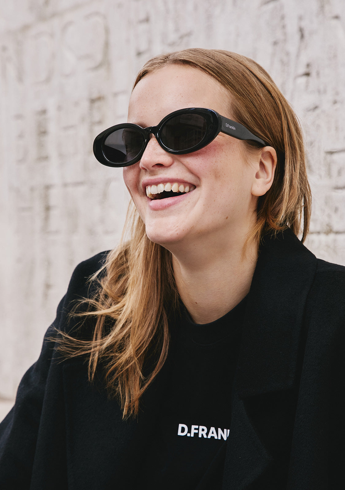 Our Capri model in black has the distinctive D.Franklin details, the logo engraved on the temples and the emblem on the lens. The lens width is 53 mm and the front is 150 mm. The side temples have a length of 145 mm.