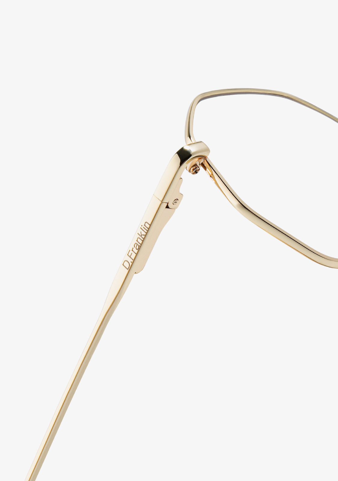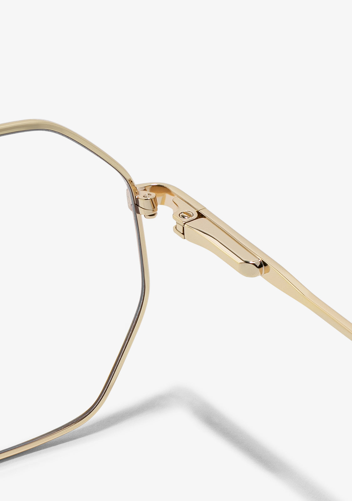 The geometry of a unique style. The Hexagon collection redefines retro style through its hexagonal mount and combination of materials. The Classic Hexagon Blue Block Carey / Gold inspires the sixties style through its angles. Hexagonal glasses with ultra light metallic frame.