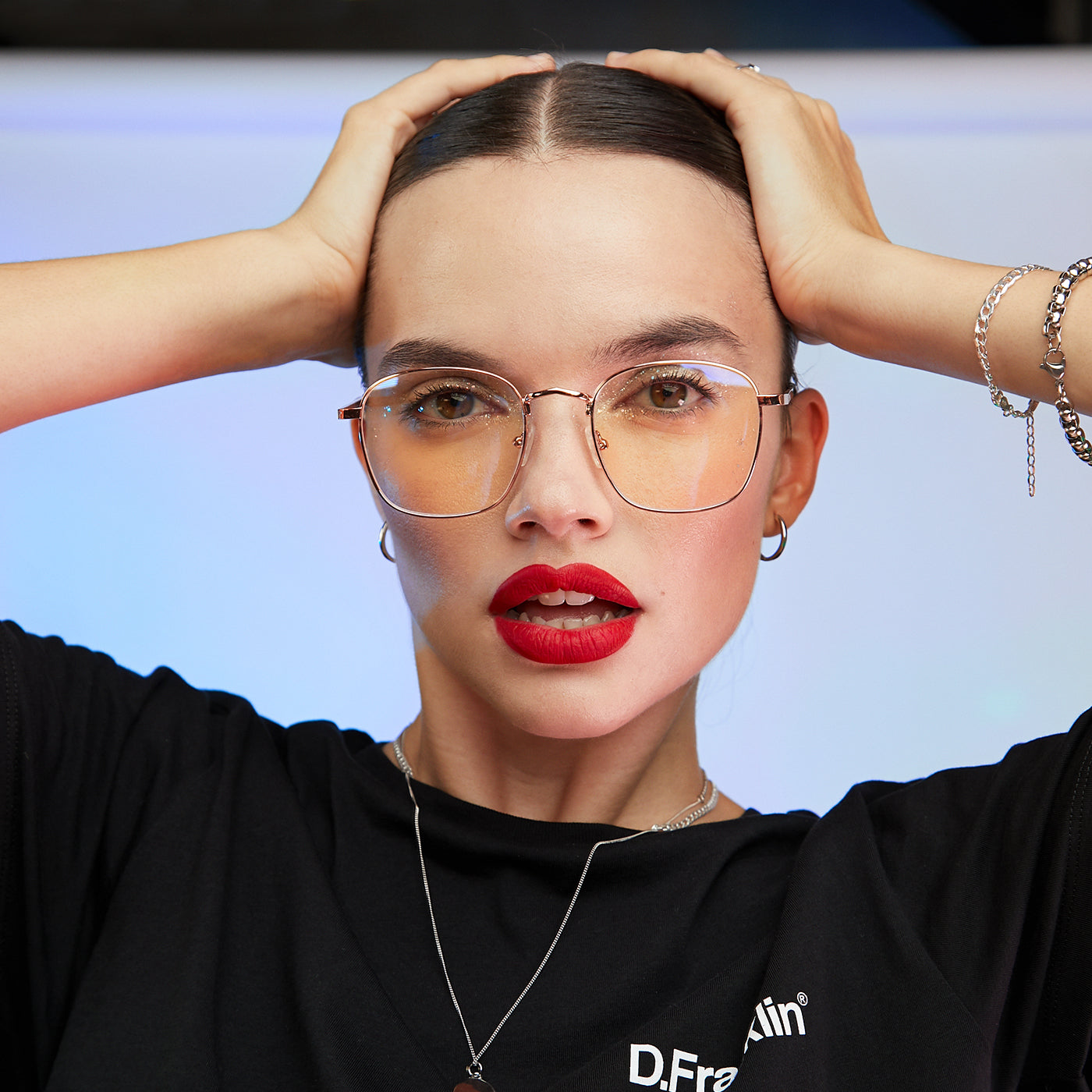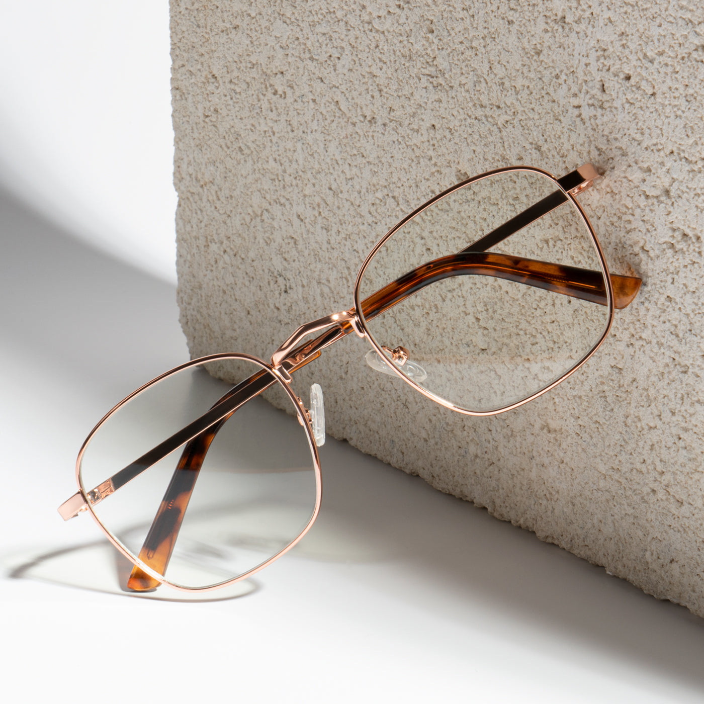 A perfect symmetry. Discover the exclusive Classic Square Blue Block / Rose Gold collection, square glasses with metal-finished frames and inspired by the most popular classics of the 70s.
