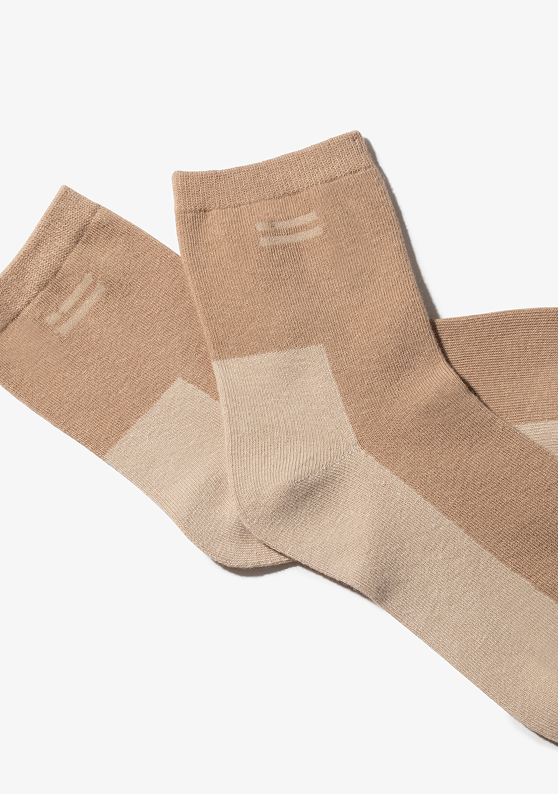 Two-pack of comfortable, versatile socks made for everyday wear. The Color Block Socks 2 Pack Sand-Mint features colour-block designs in sand and peach tones, adding a modern touch to any look. With a round cut that fits smoothly around the foot, they offer secure support without feeling tight. Branded details add style and personality. Perfect to pair with trainers or sports footwear.