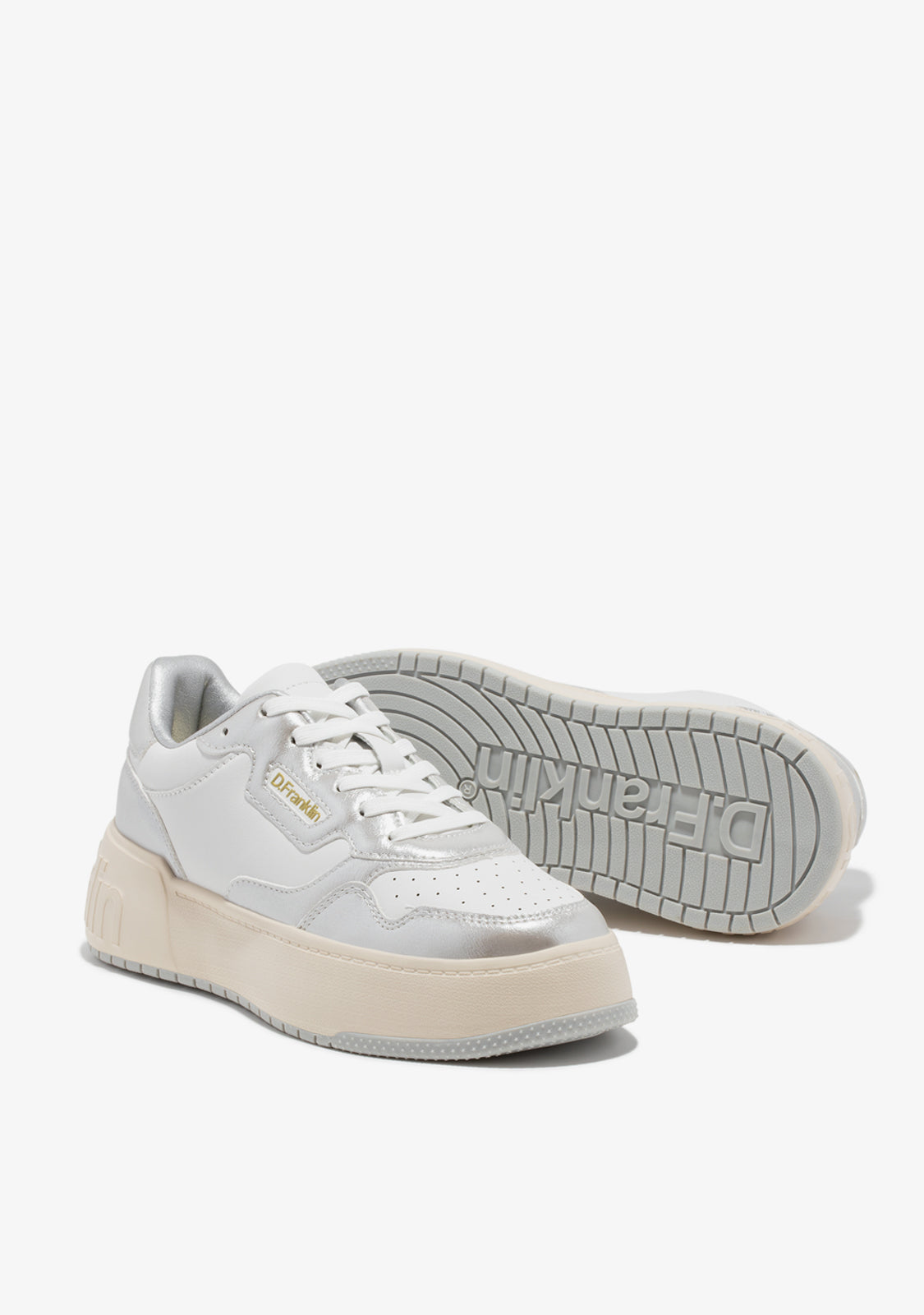 The white Court D.Franklin trainers are crafted with silver detailing and cotton laces. The contrasting sole features an embossed logo on both the heel and sole. They have 4cm of height and a phylon sole for lightweight cushioning.