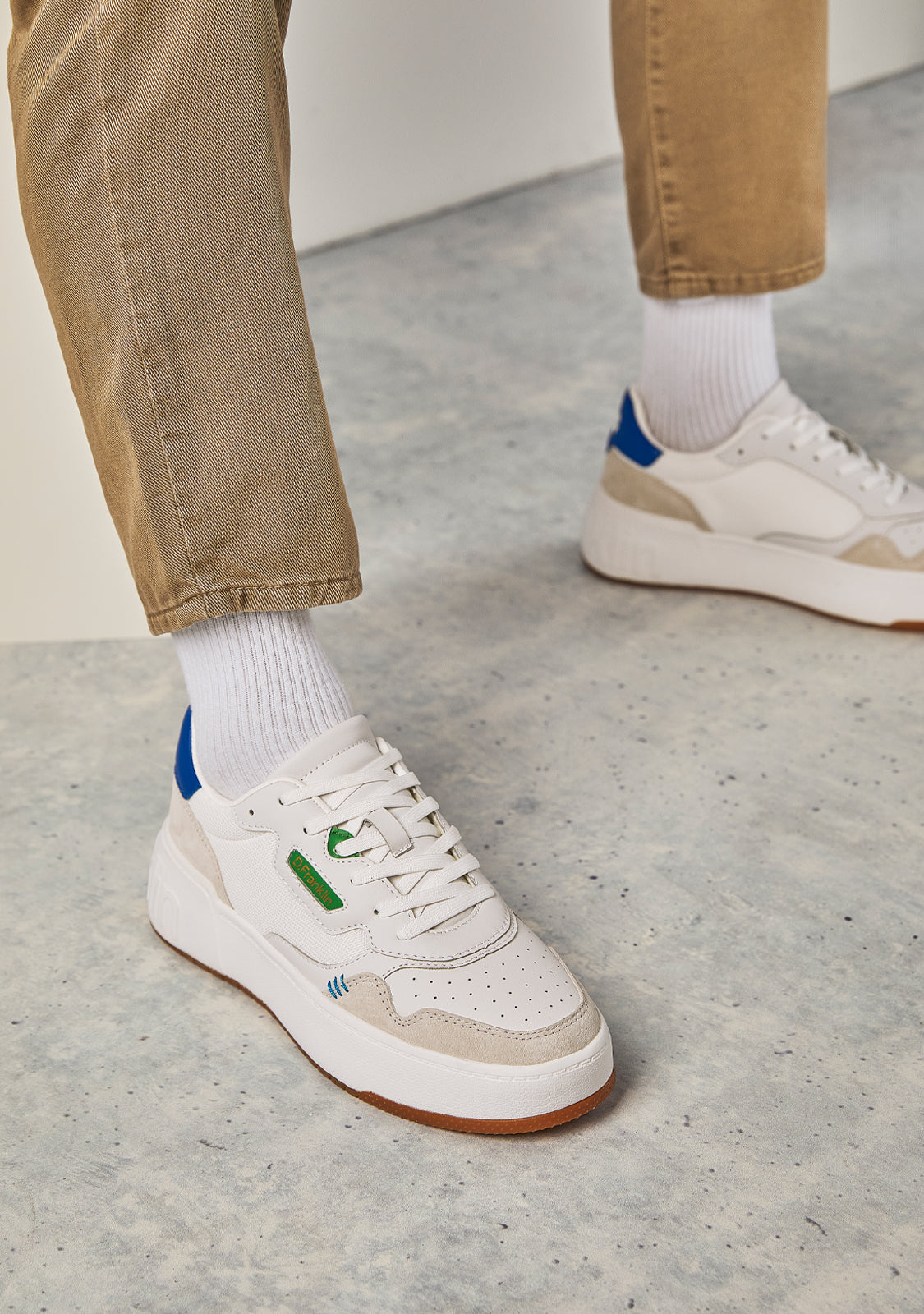 Our Court model is crafted with navy, green and grey detailing. As well as matching embroidery with triple stitching. The sole features an embossed logo on the heel, sole and side. With 4 cm height and phylon sole for lightweight cushioning. In addition, the insole is anatomical and removable.