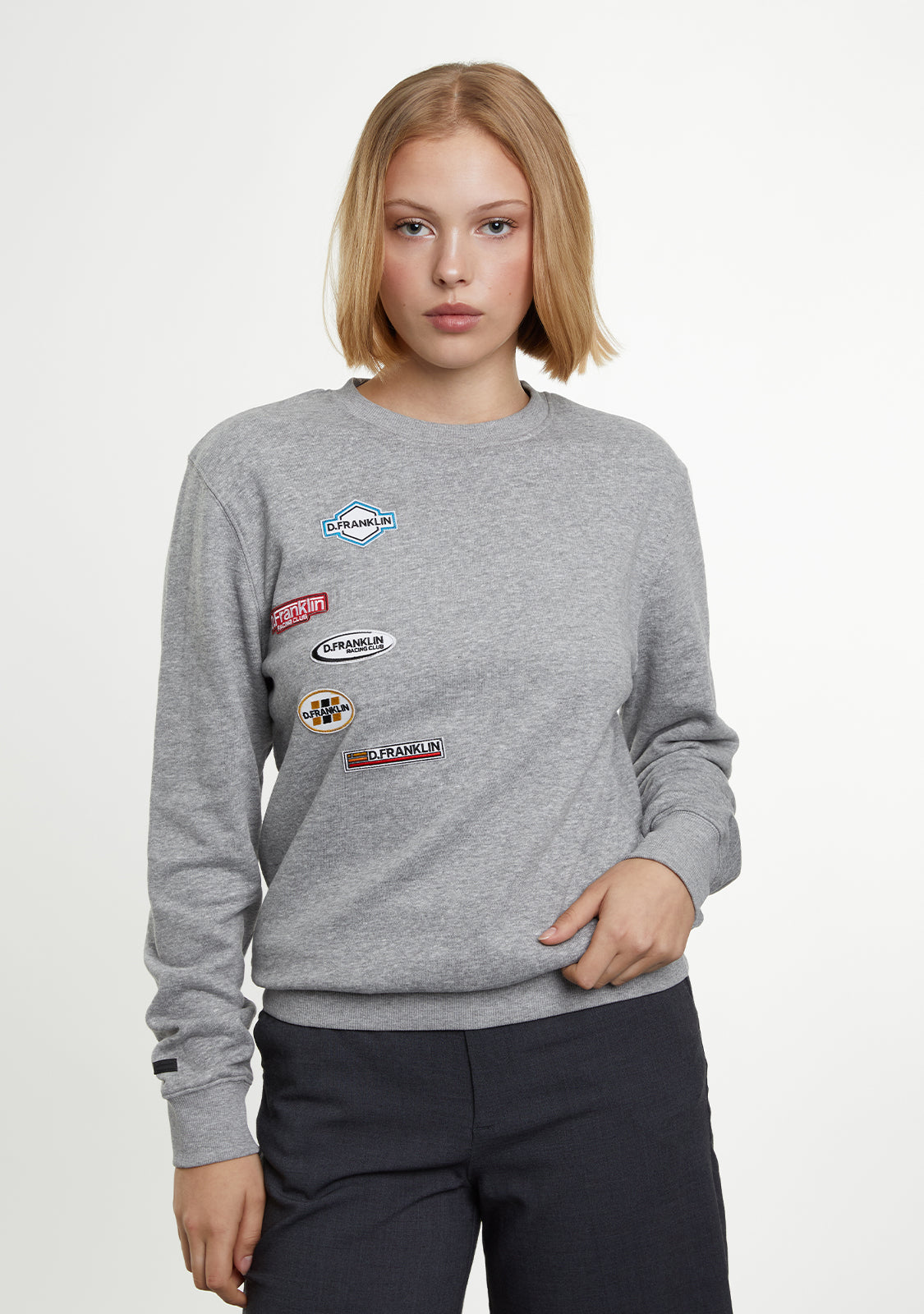 This grey round-neck sweatshirt without a hood features embroidered patches inspired by retro racing club aesthetics on the front. Additionally, the back showcases the D.Franklin logo designed with automotive inspiration in white contrast.
