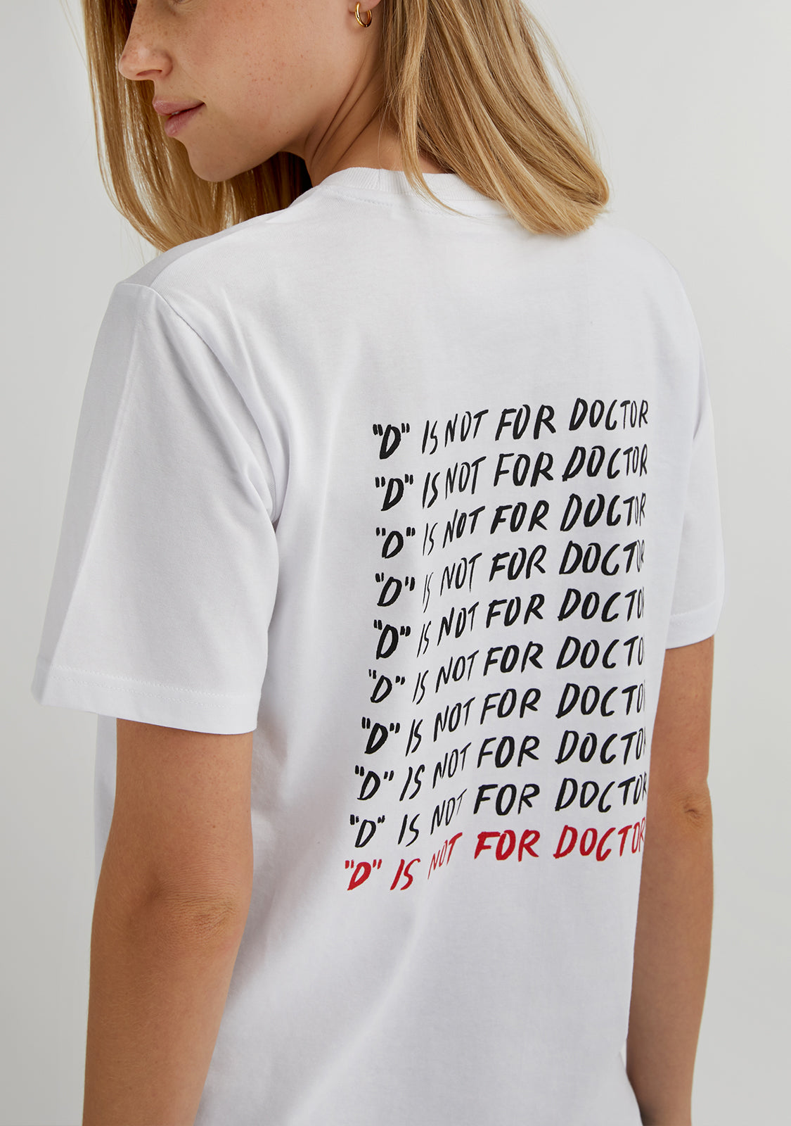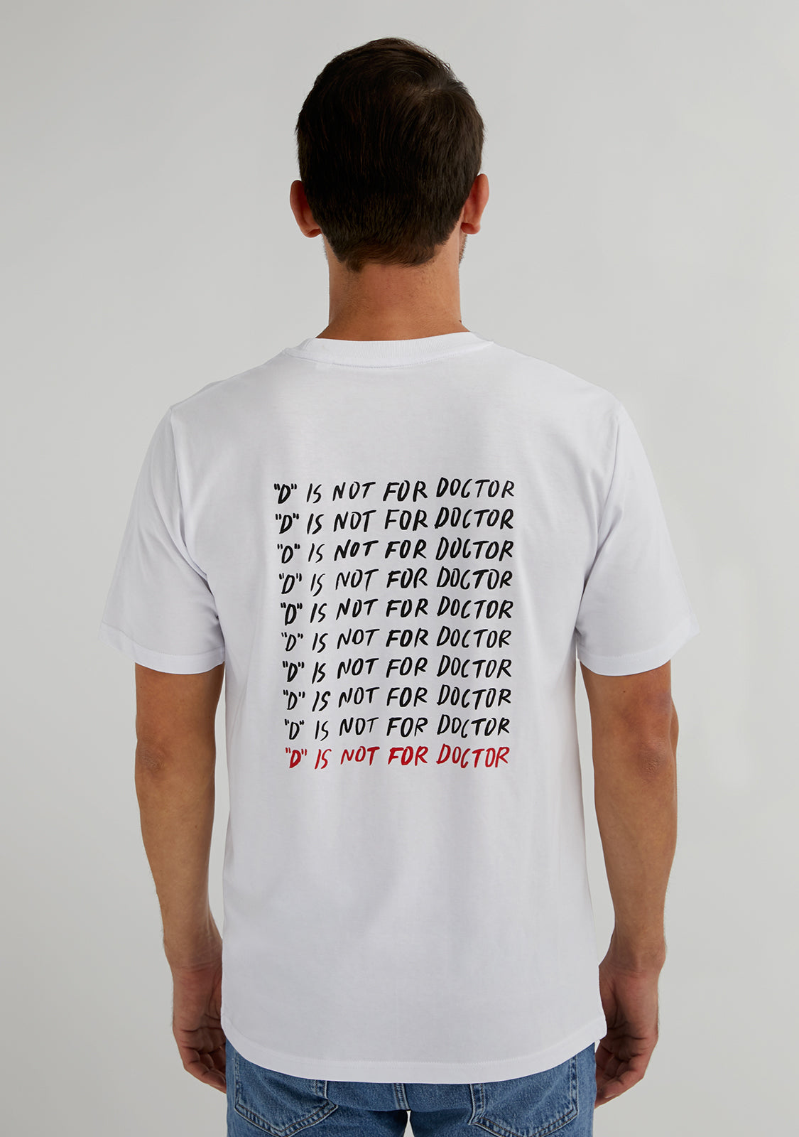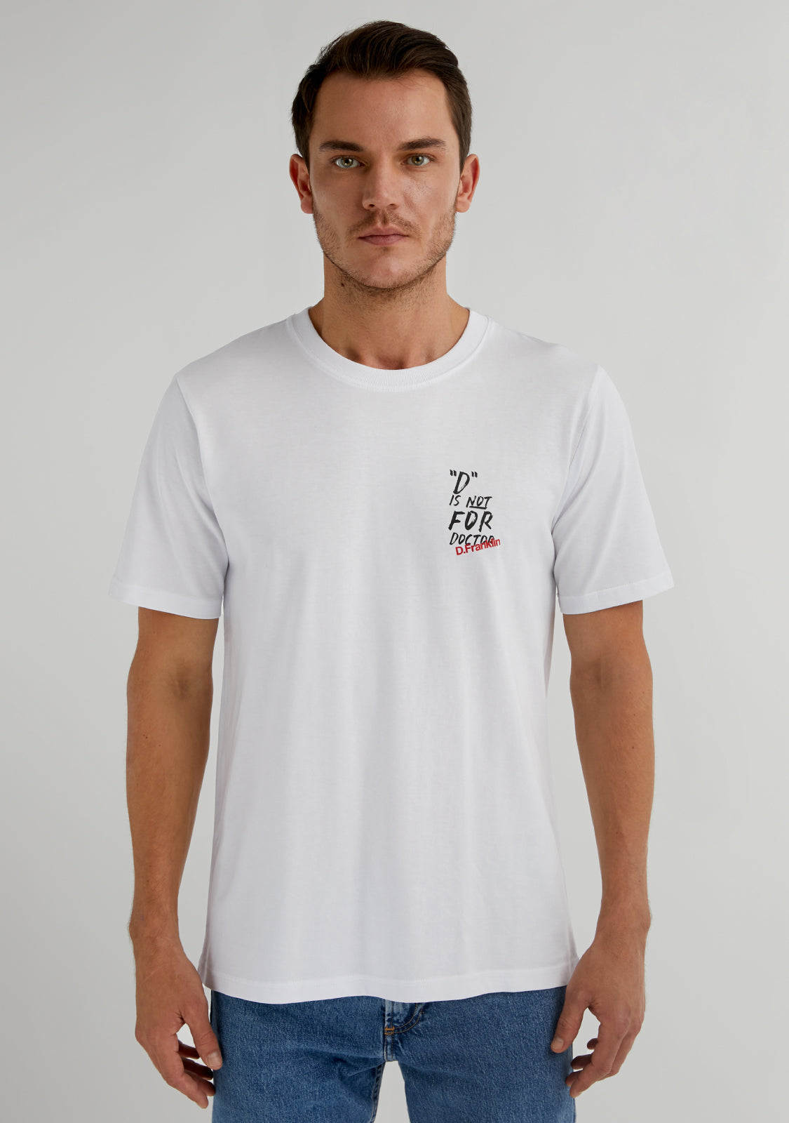 Join the D.Franklin style with its latest addition D Is Not For Doctor T-Shirt White. Made with the best materials, which gives it great breathability, elasticity and comfort. Stitched sleeves. Ribbed neck. White finish combined with the message both front and rear screen-printed.