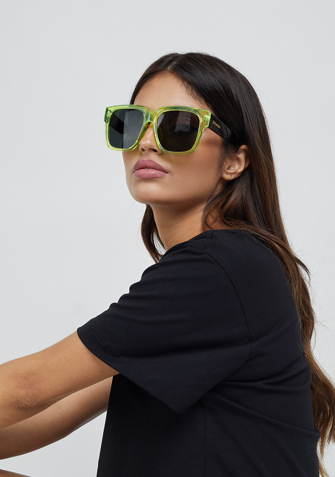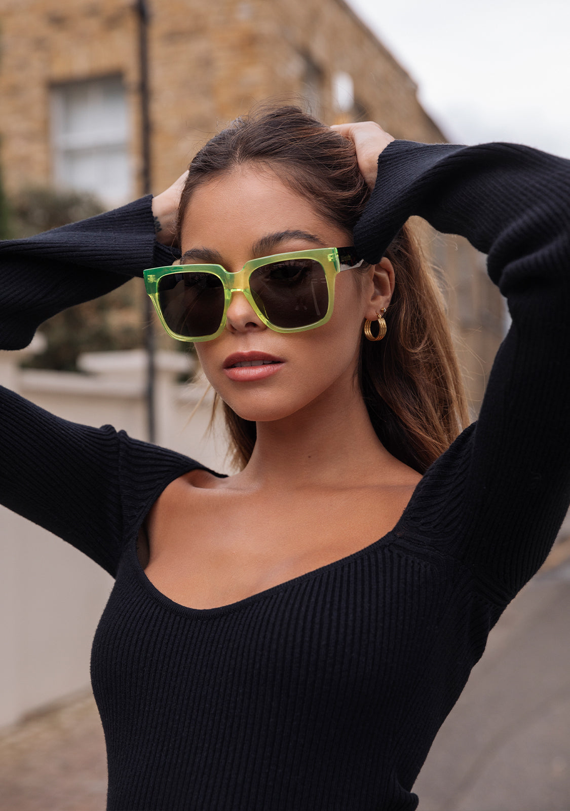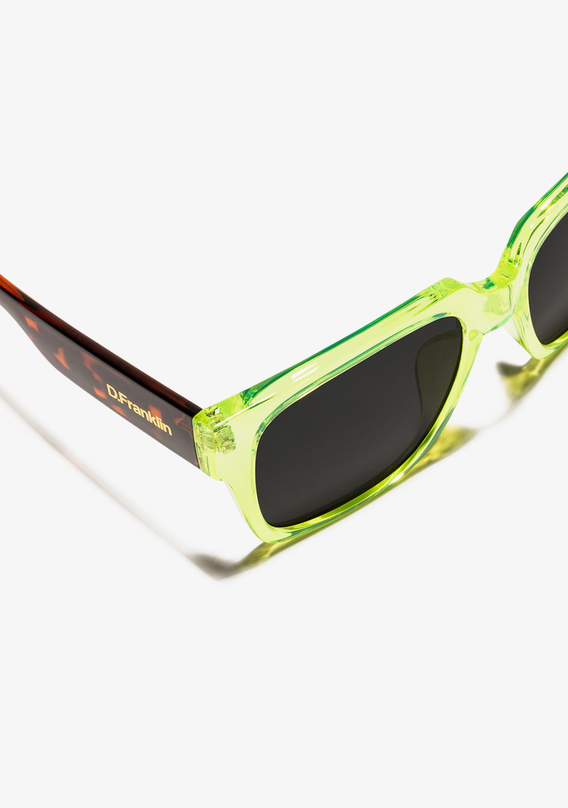Sunglasses with an extralarge frame and a trendy seasonal style. This is D.Franklin Dunar Day Glo / Black model. A daring and rule-breaking design that suits the different textures and effects of its characteristic squared frame.