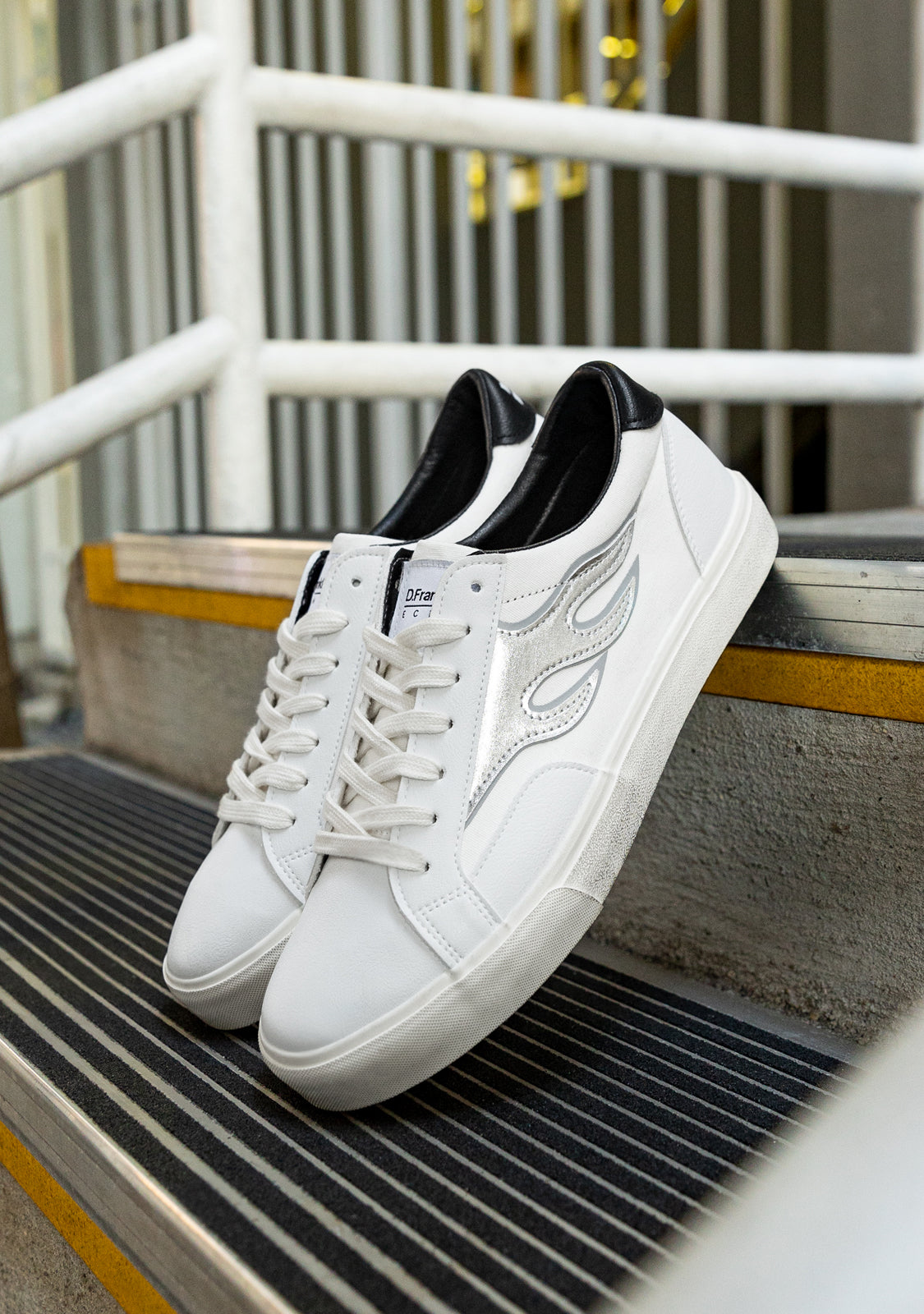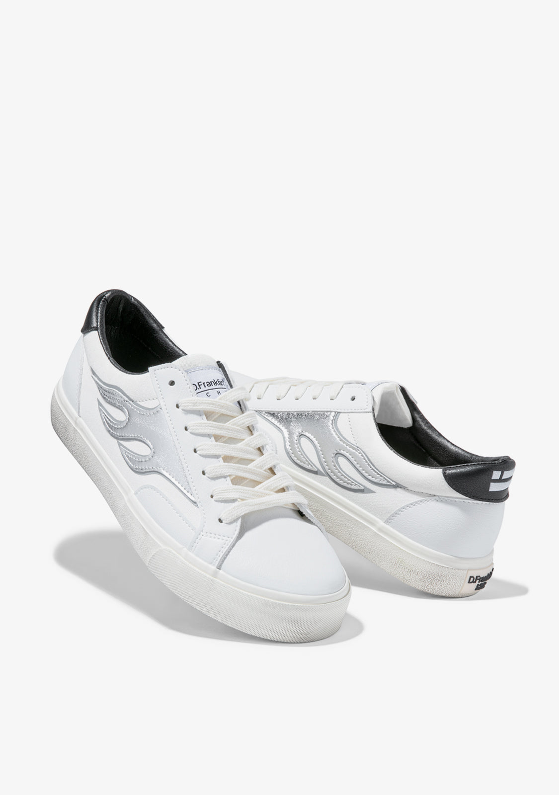 Low-cut trainer inspired by the skateboarding scene in Venice Beach, Los Angeles. Flame detail on the side in silver metallic texture on white recycled textile. Embossed logo at heel on red background. Cotton laces.