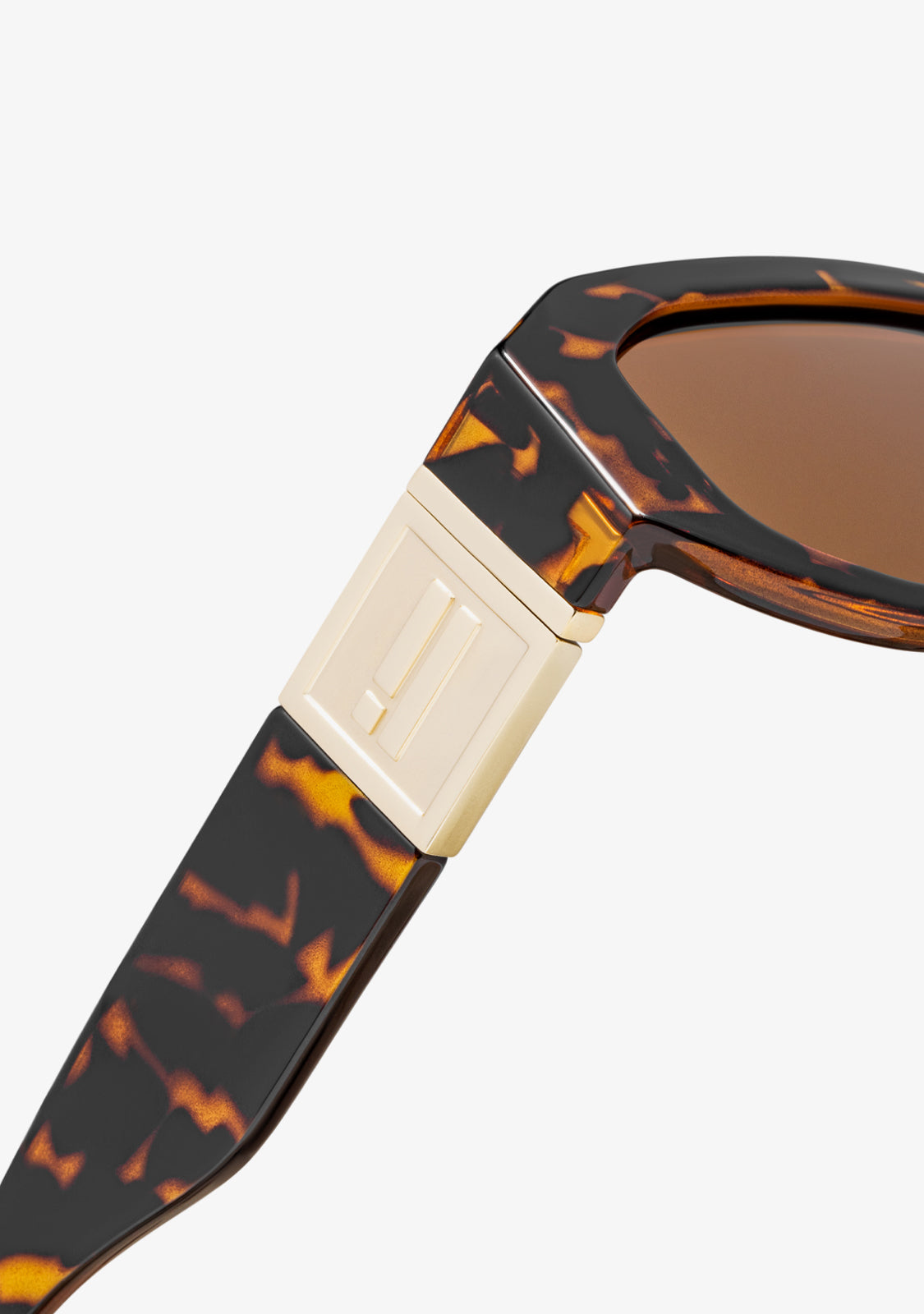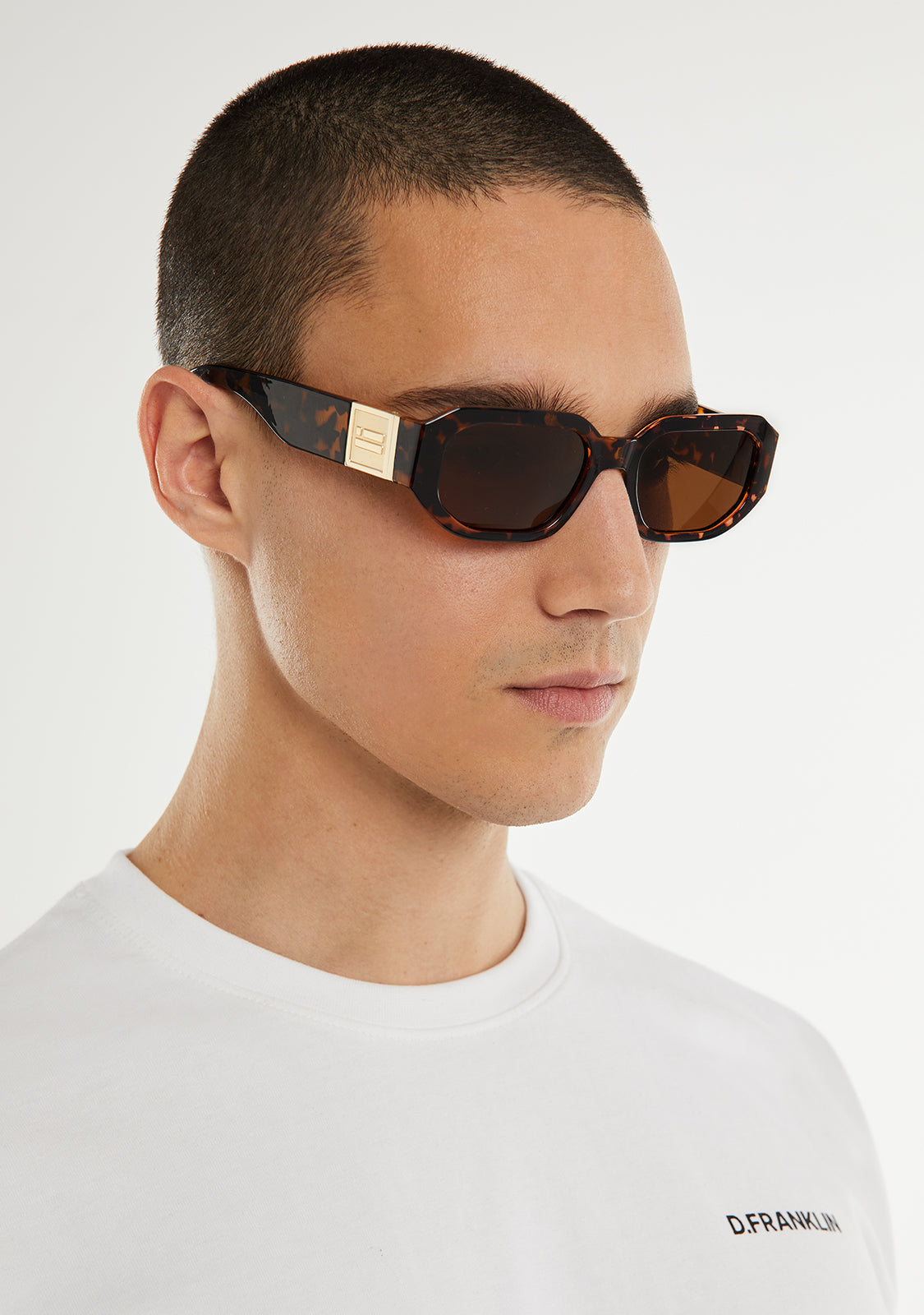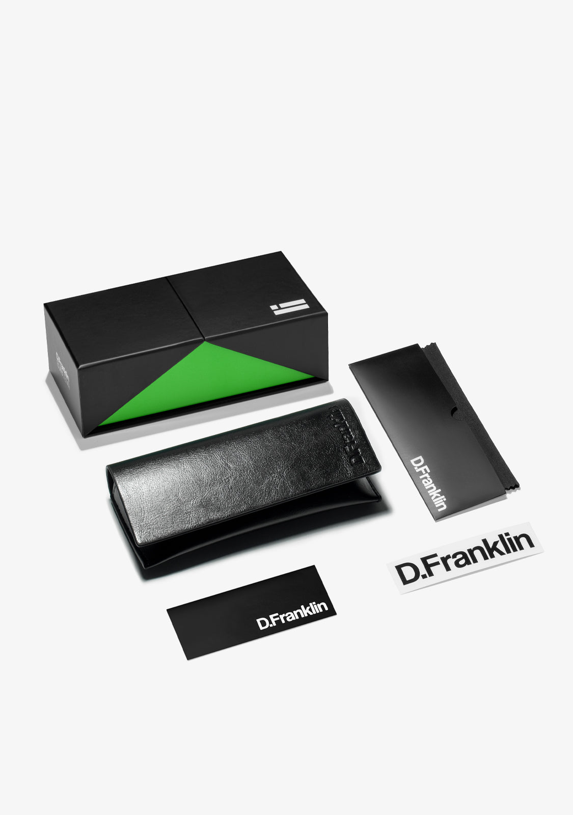 Brown polarized lenses and tortoiseshell frames enhance the uniqueness of this design. It features our distinctive D.Franklin flag with a metallic gold finish on both temples. The 52 mm lens width and 139 mm front frame are joined by an asymmetrical 140 mm temple.