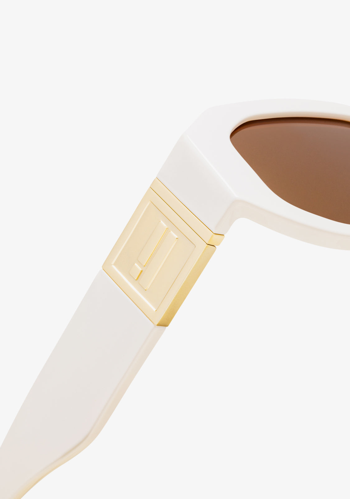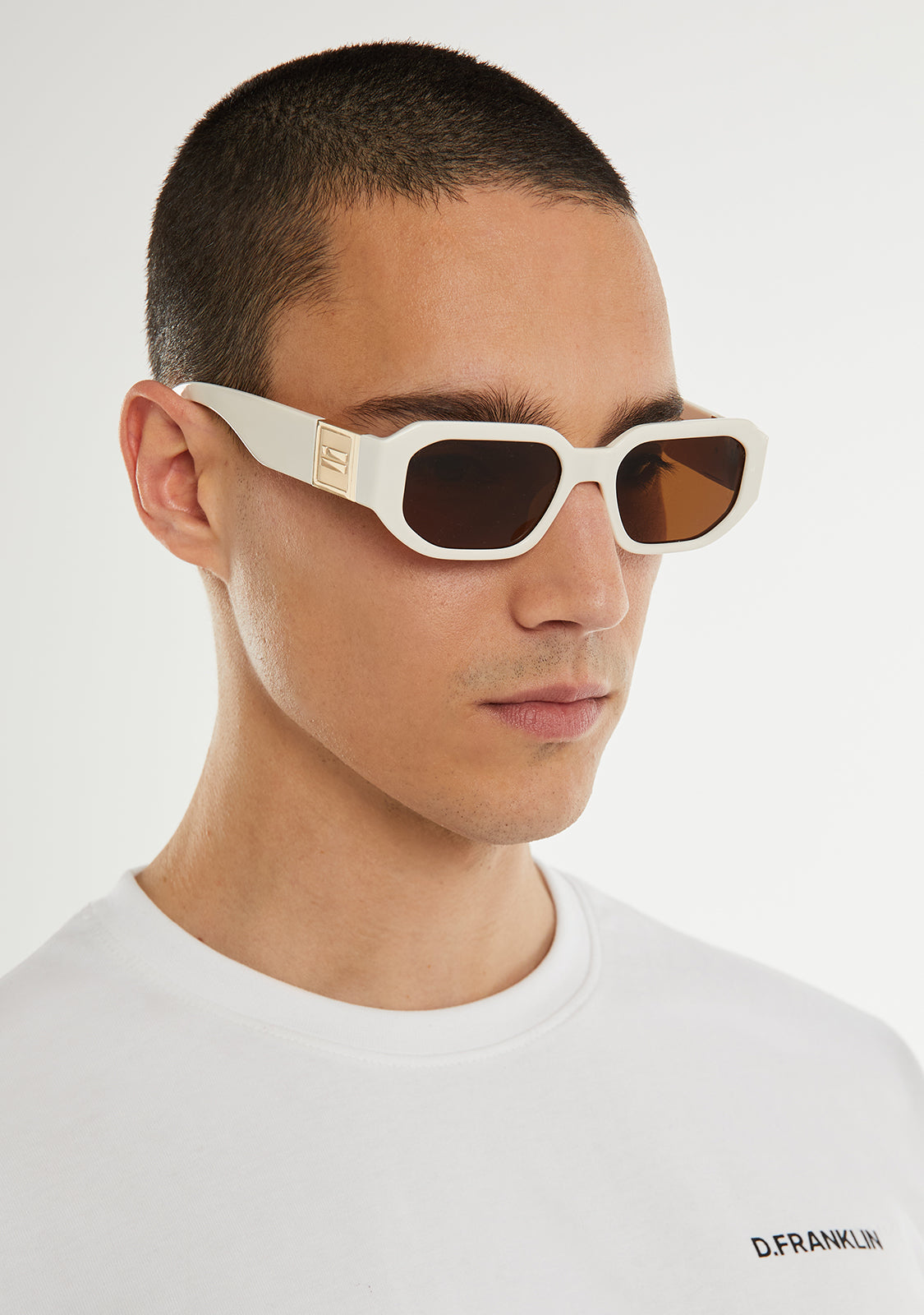 Brown polarized lenses and white frames highlight the uniqueness of this design. It features our distinctive D.Franklin flag with a metallic gold finish on both temples. The 52mm lens width and 139mm front frame are joined by an asymmetrical 140mm temple.