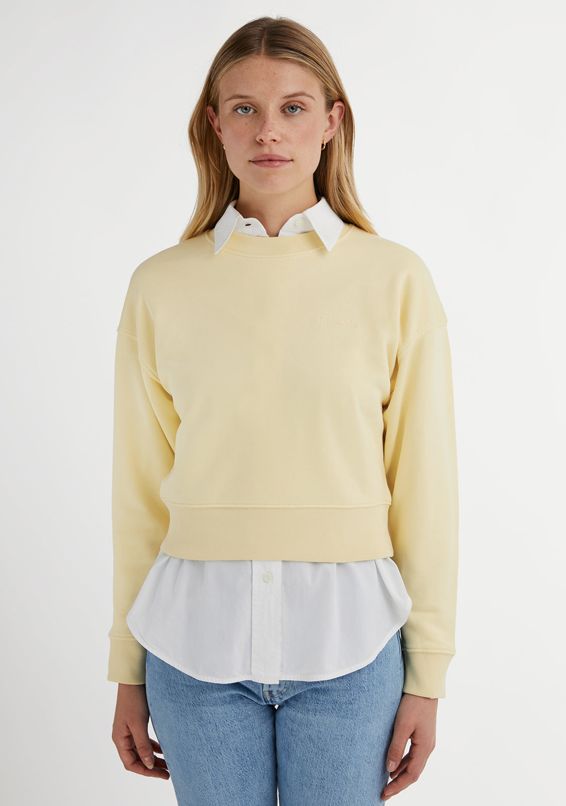 Join the D.Franklin fashion with our latest collection of sweatshirts. Simple and comfortable, they are the perfect combination of basic, mix-and-match colors and the brand's logo application. The Embroidery Logo Cropped Crew Neck Sweatshirt / Butter is made with the best materials, which gives it great breathability and elasticity.