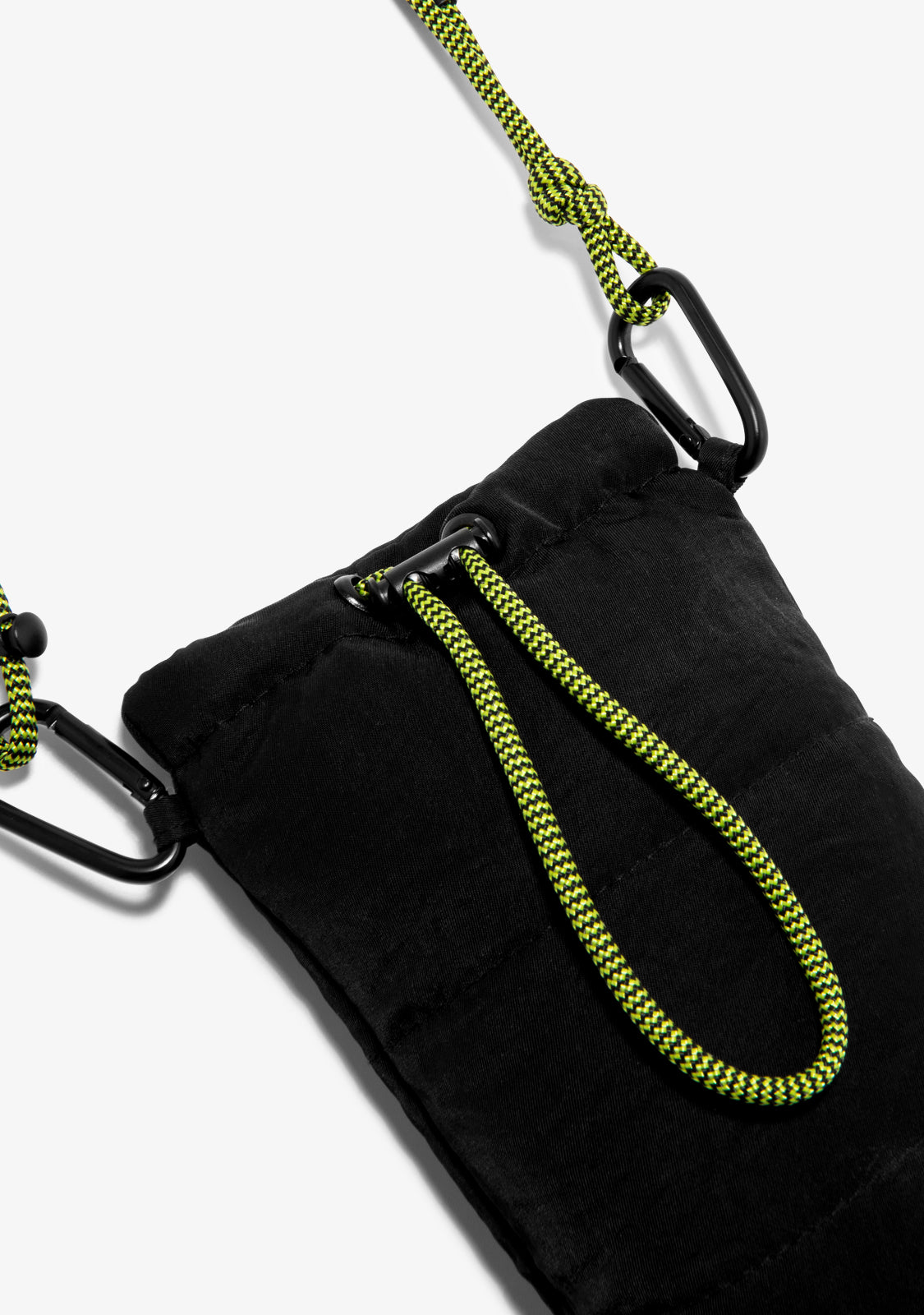 This model with black finish has a removable lime-coloured cord thanks to its carabiners that allow you to adapt its length. It has an adjustable closure and a lime-coloured D.Franklin logo screen-printed on the front.