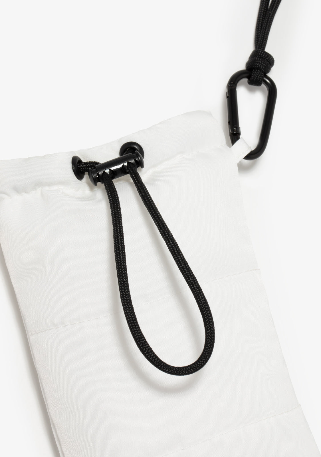 This model with white finish has a removable black cord thanks to its carabiners that allow you to adapt its length. It features an adjustable closure and a black screen-printed D.Franklin logo on the front.