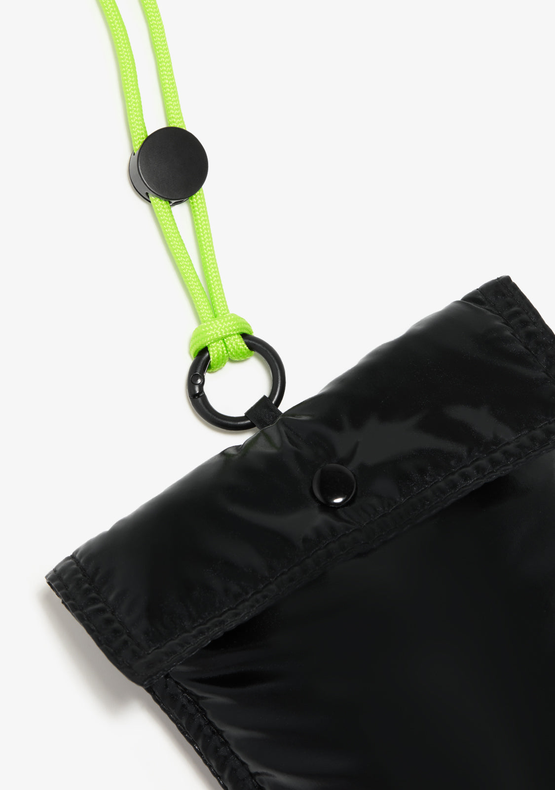 This model with iridescent black finish has a removable lime-coloured cord thanks to its metal ring that allows you to adapt its length. It features a button fastening and a lime-coloured screen-printed D.Franklin logo on the front.