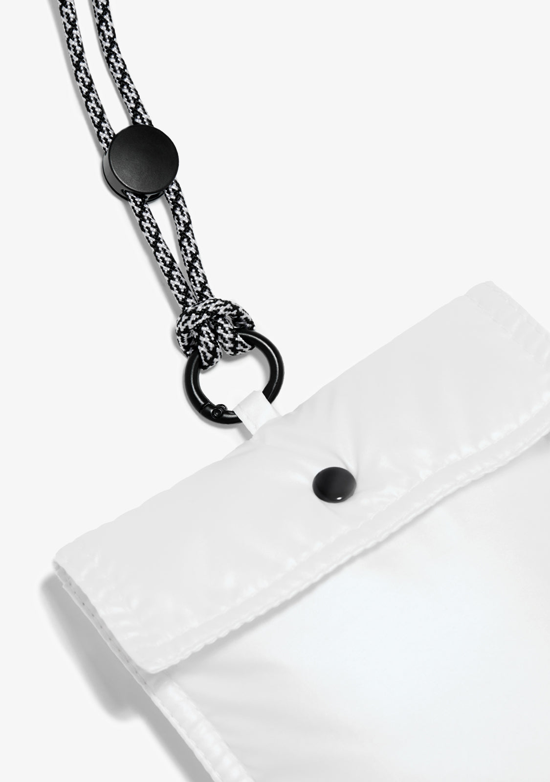 This model with an iridescent white finish has a removable black cord thanks to its metal ring that allows you to adapt its length. It features a button fastening and a black screen-printed D.Franklin logo on the front.