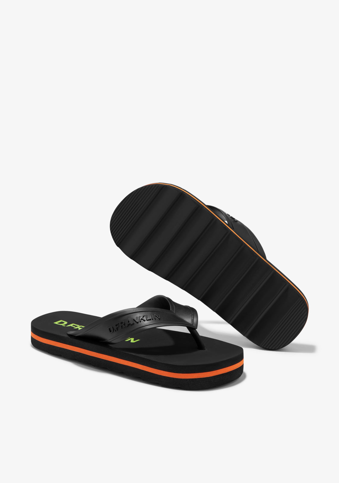 The D.Franklin Flop sandals feature a dark finish with a synthetic toe strap for a secure fit. They also feature our D.Franklin emblem on the upper and footbed. As well as an orange outline detail.