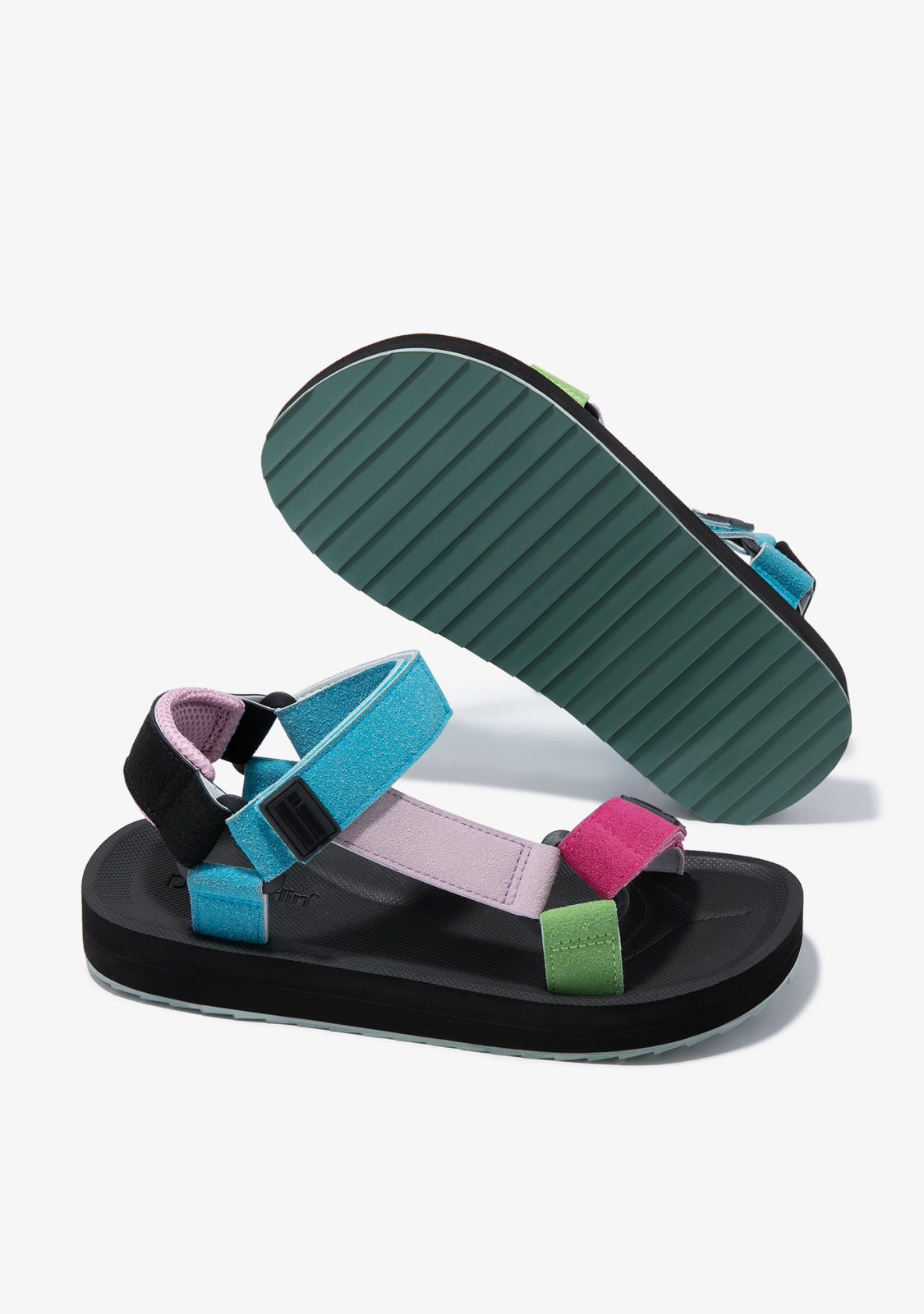 An escape from the city. A break from everyday life. A design with which to discover new places far from the familiar. Sporty style sandal with a combination of blue, white, fuchsia and green colour combination, on a black sole. Constructed with EVA sole for comfort.