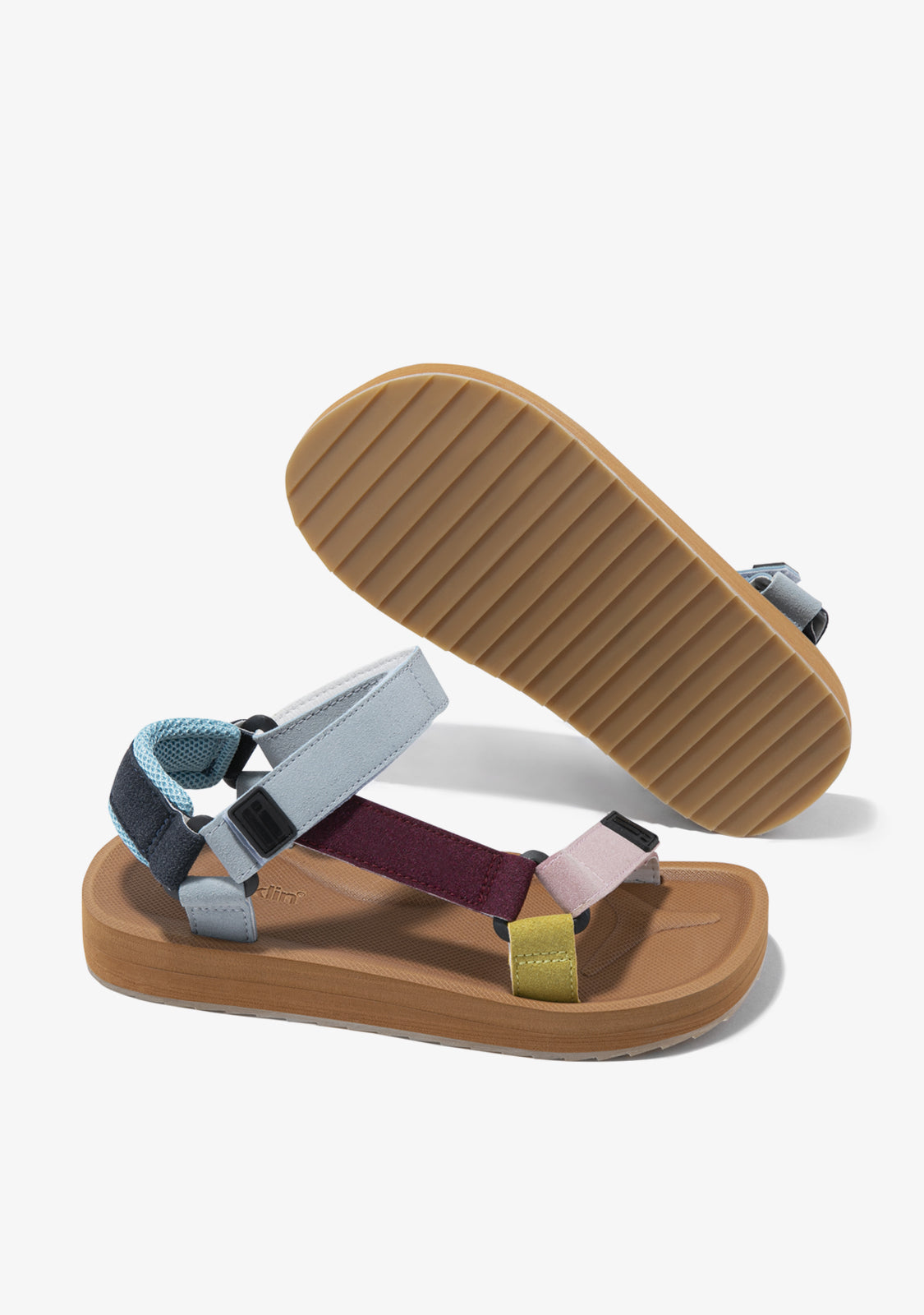 An escape from the city. A break from everyday life. A design with which to discover new places far from the familiar. Sporty style sandal with a grey, fuchsia and yellow combination strap fastening on a brown sole. Constructed with EVA sole for comfort.