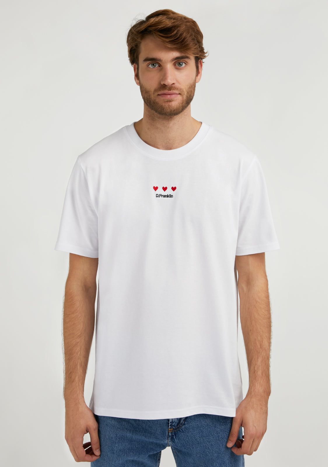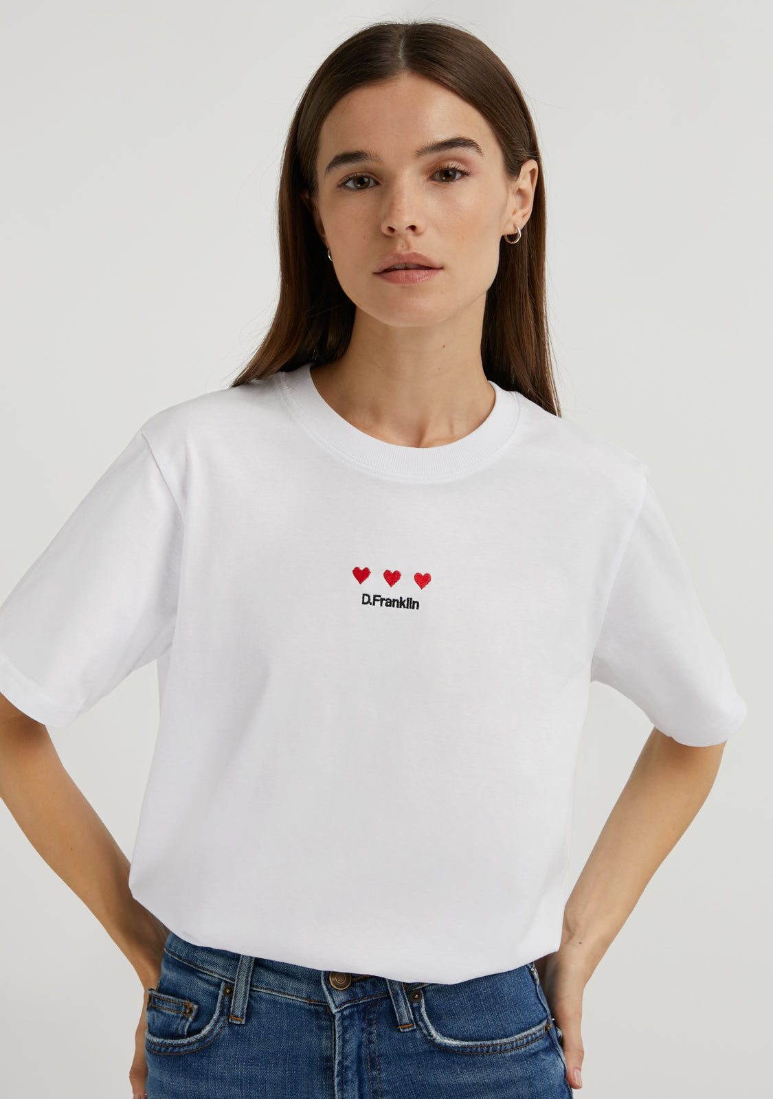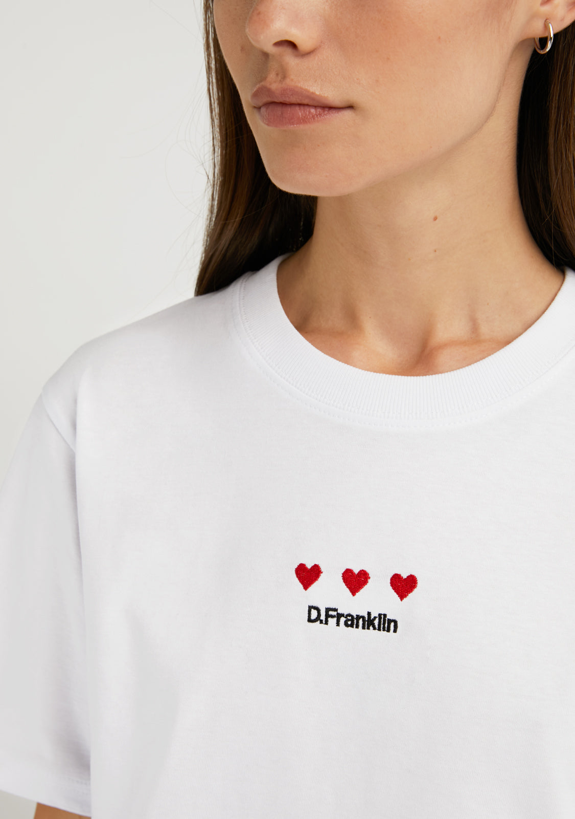 100% organic cotton t-shirt with bonded sleeves and ribbed collar. The design features the D.Franklin logo and three red hearts at the top of the T-shirt, which are the hallmarks of the From Heart To Heart collection.