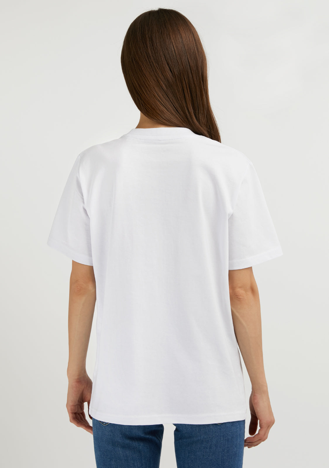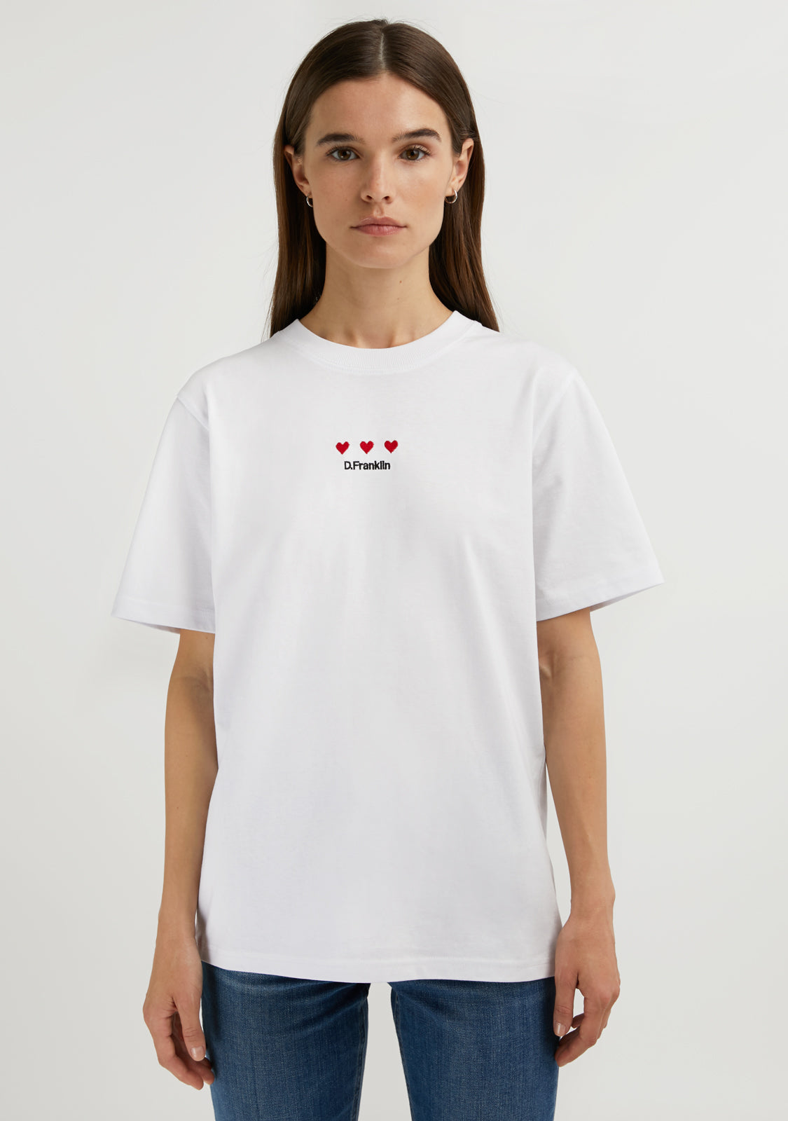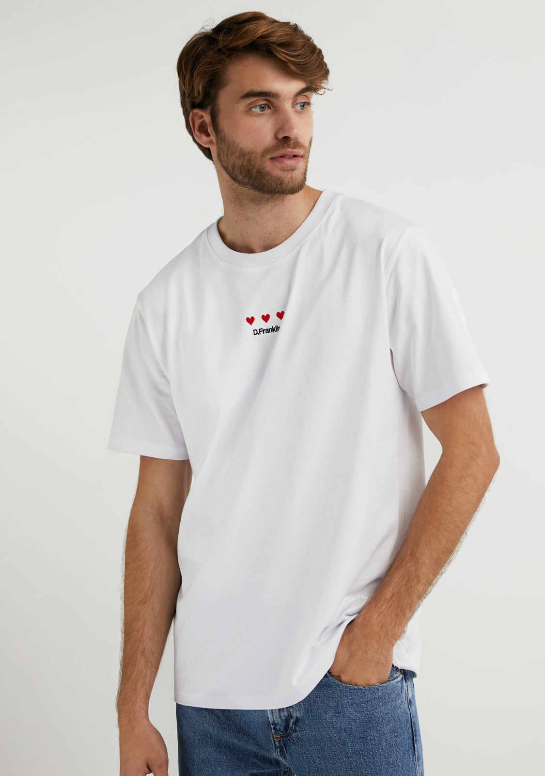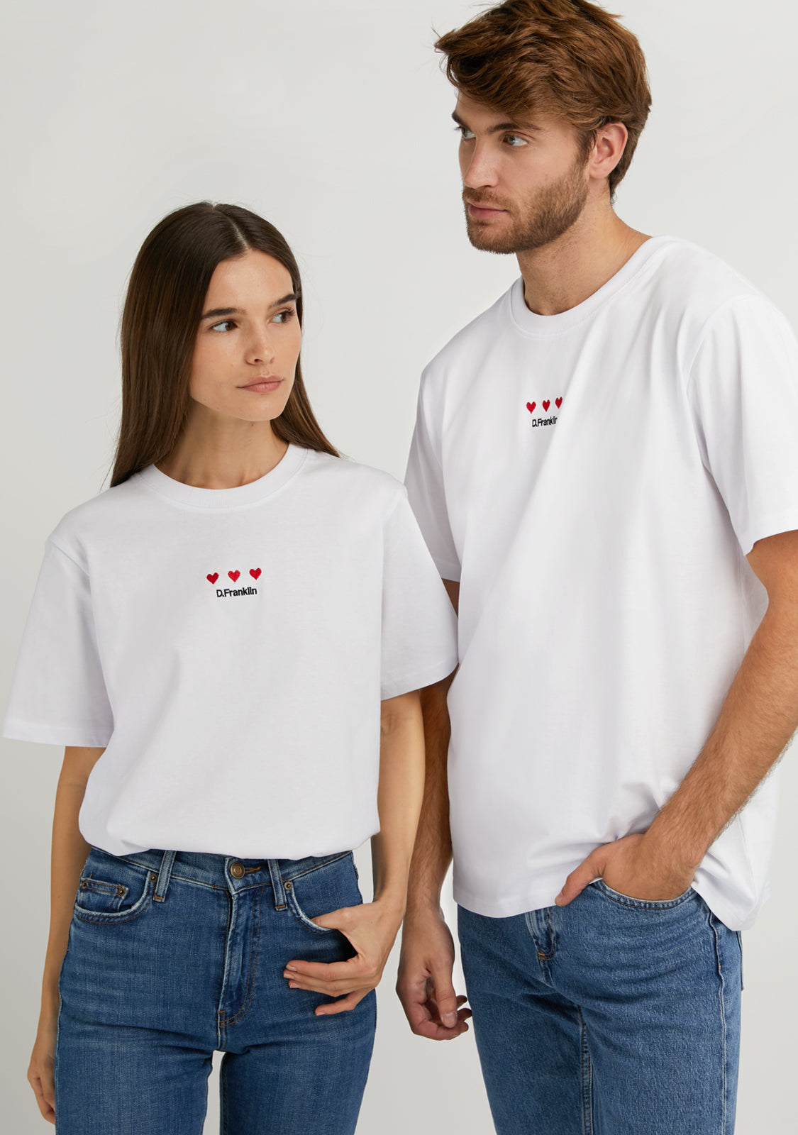 100% organic cotton t-shirt with bonded sleeves and ribbed collar. The design features the D.Franklin logo and three red hearts at the top of the T-shirt, which are the hallmarks of the From Heart To Heart collection.