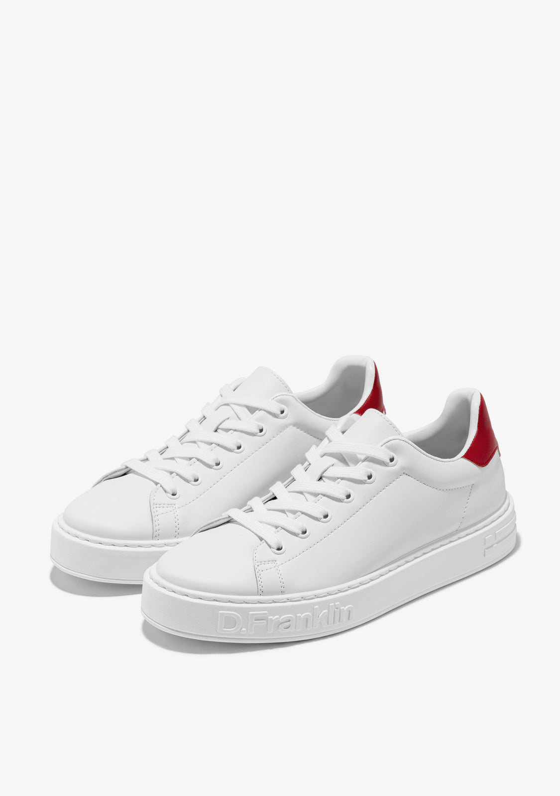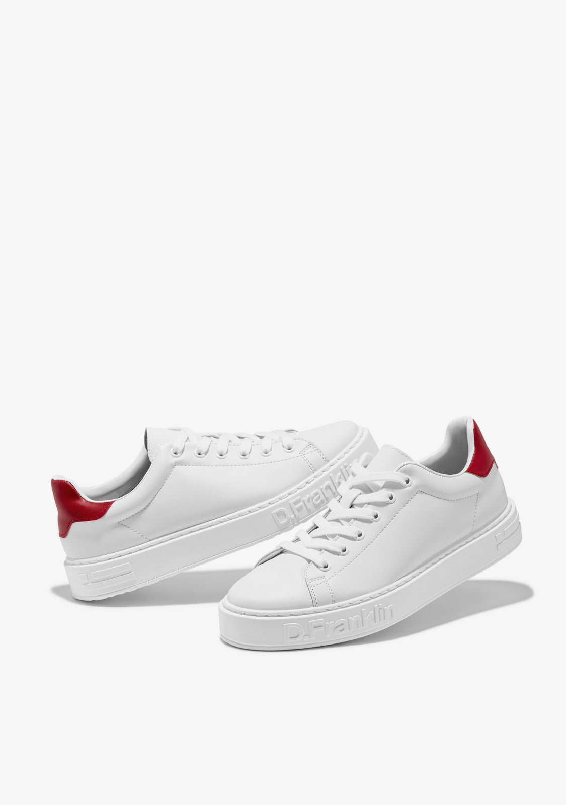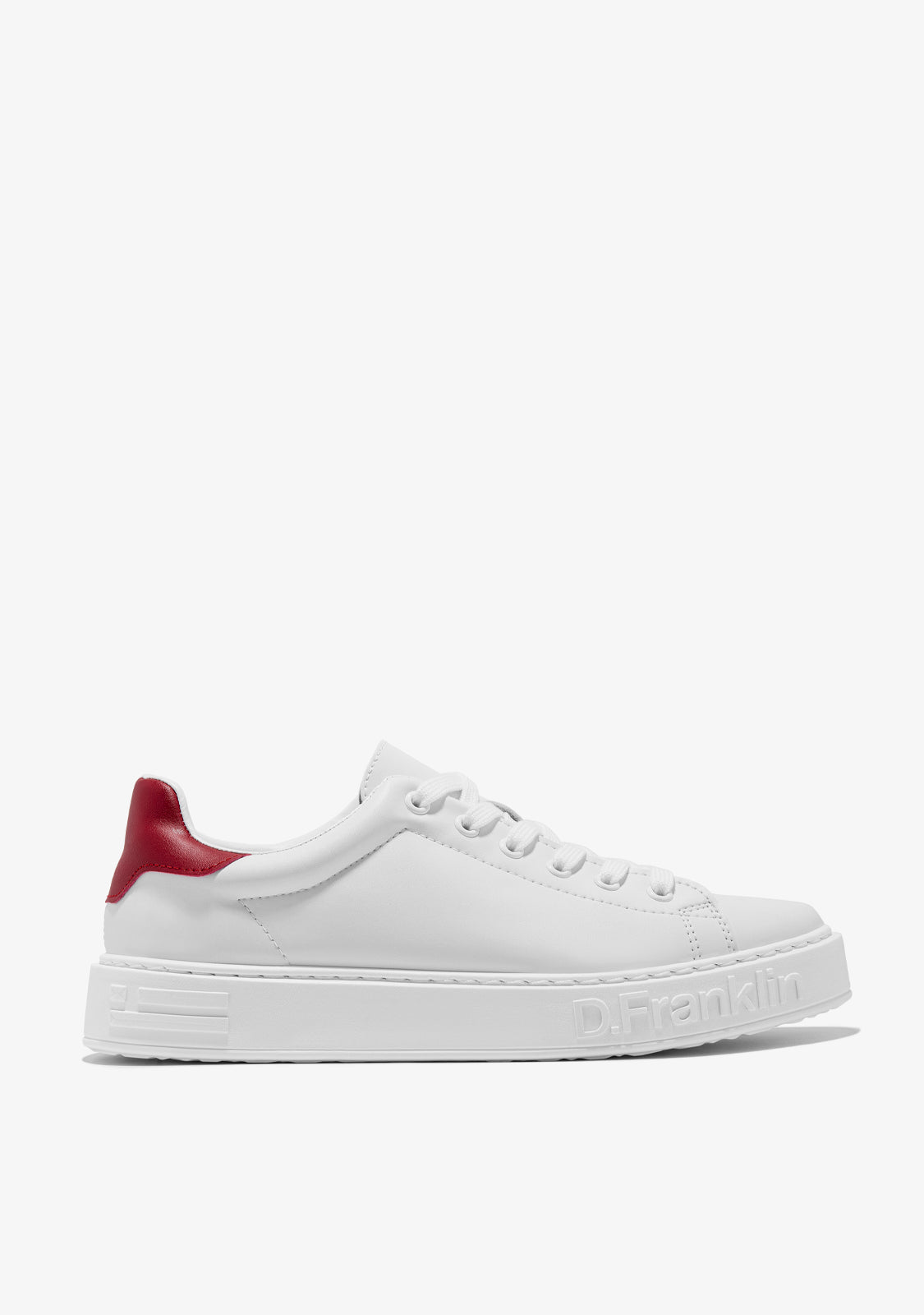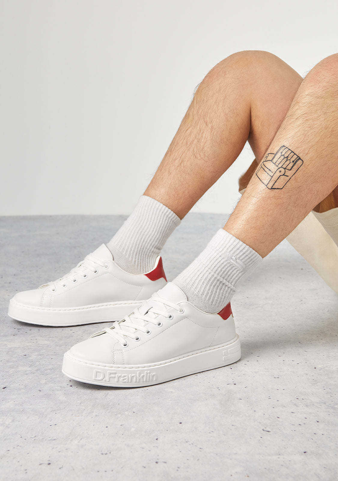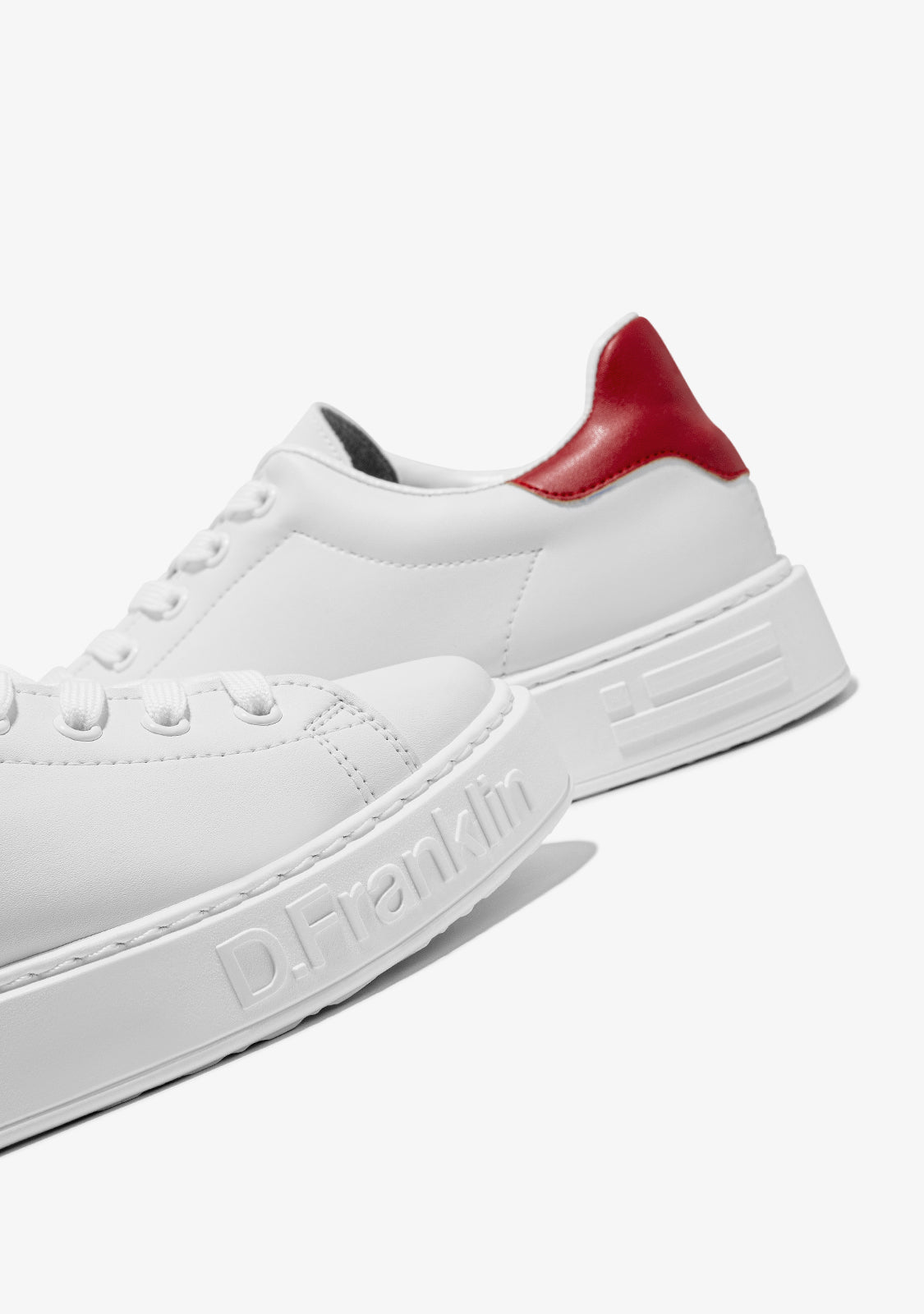 The D.Franklin Gumme 101 shoes breathe the energy of the big capitals with a simple design in white faux leather and red details. It features a 3.5cm high sole for lightweight cushioning with every step. With adjustable cotton laces for a perfect fit.