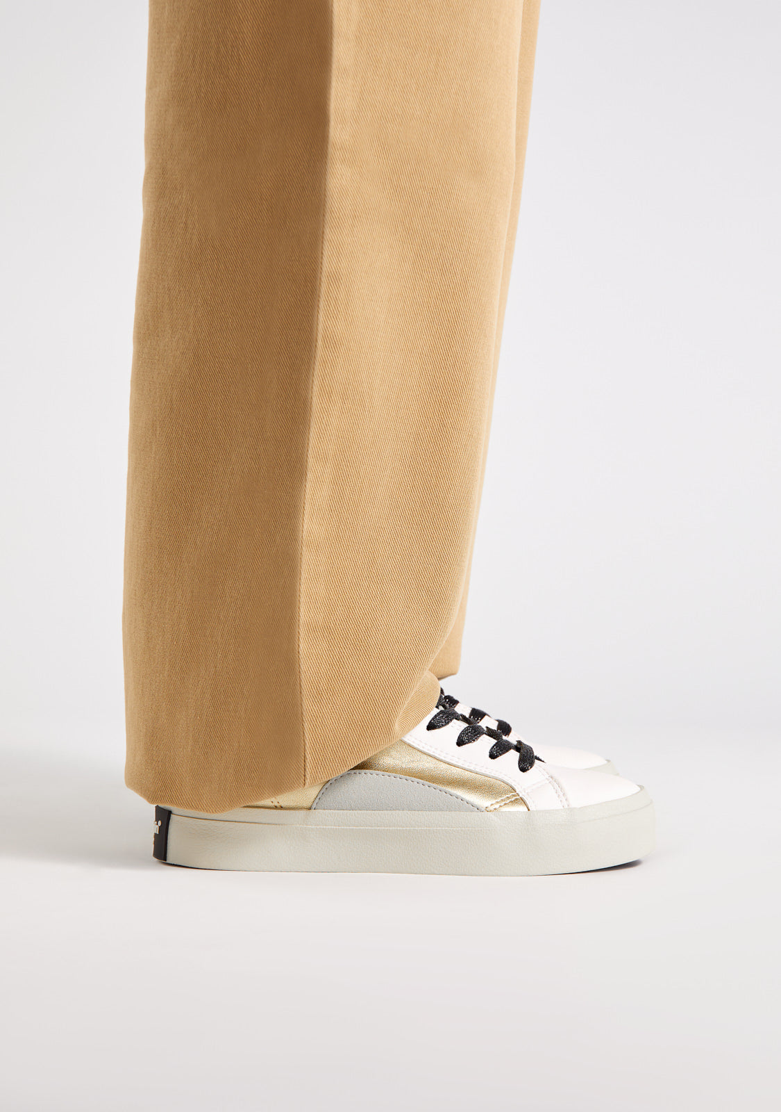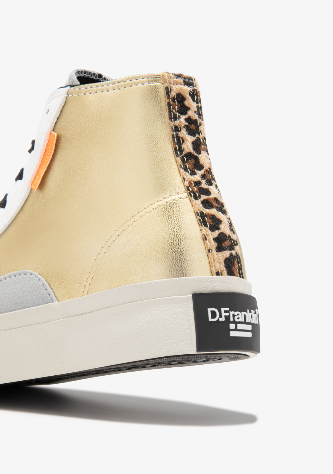 The Half Moon model captures the stellar aesthetic by combining shiny textures in gold, white tones and leopard print. It features a quilted upper and black lace-up fastening. It also features personalised lettering on the side and heel. As well as a half-moon detail in grey.