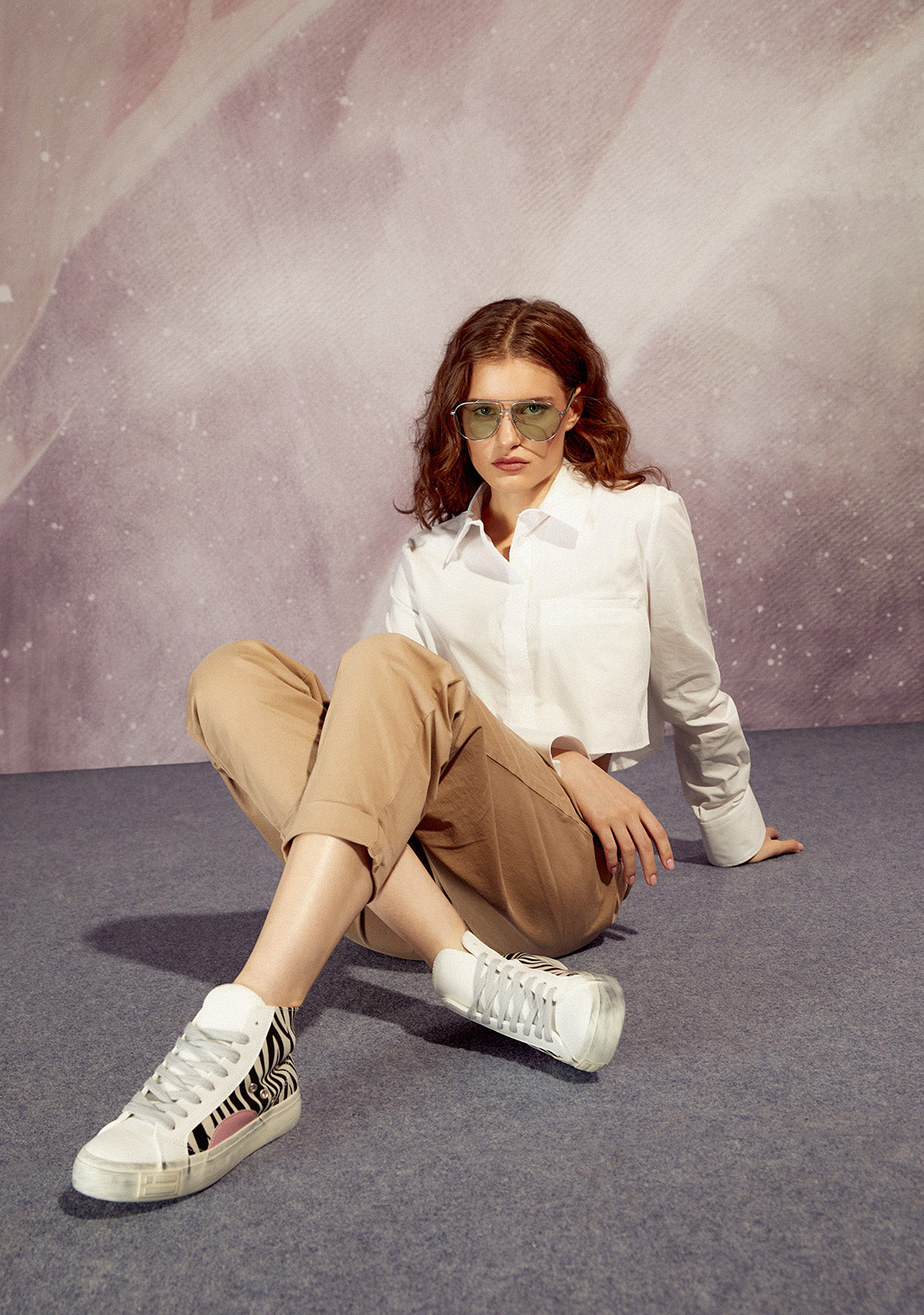 This model is constructed from faux leather and microfibre with zebra print. It features cotton laces and a matching pink half-circle with three metallic details. White monochrome 4cm rubber sole with D.Franklin emblem on the side and lettering on the heel.