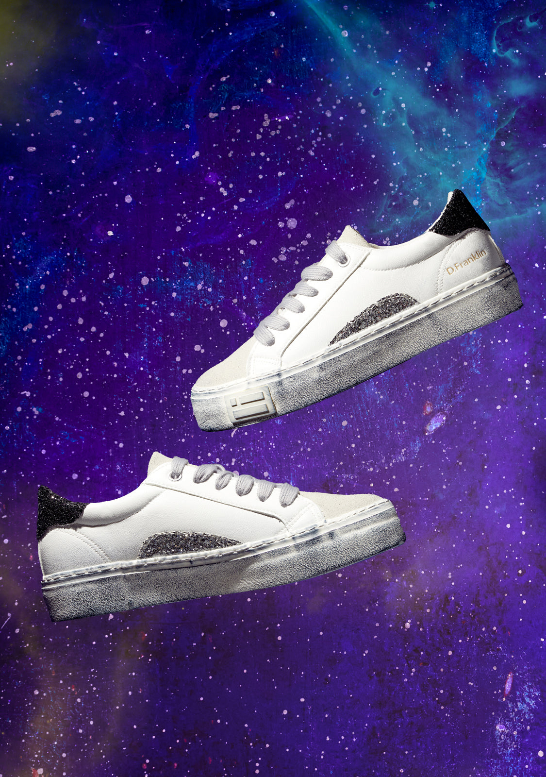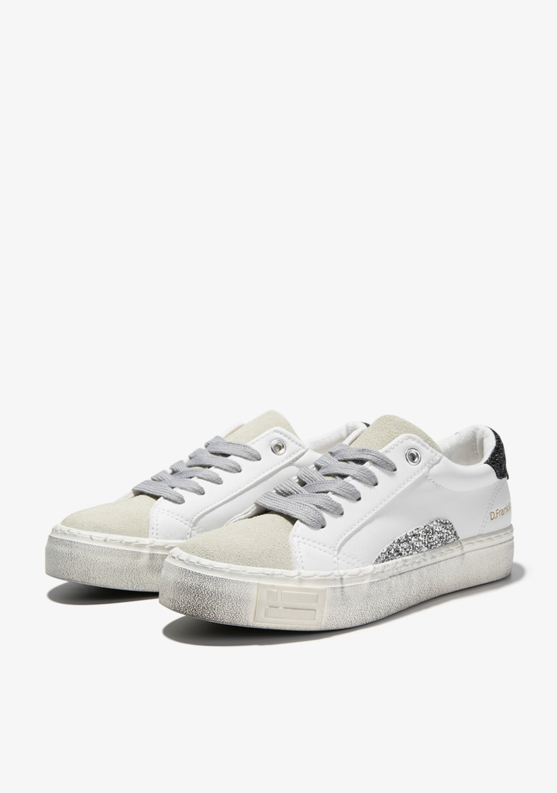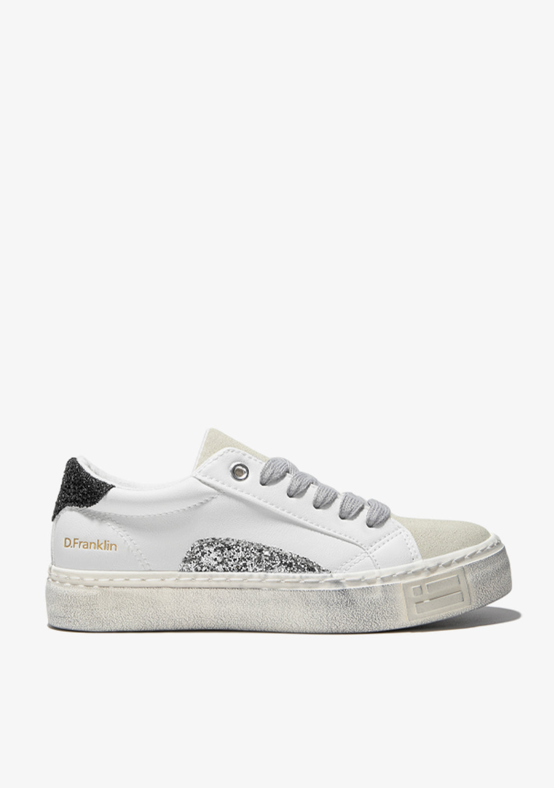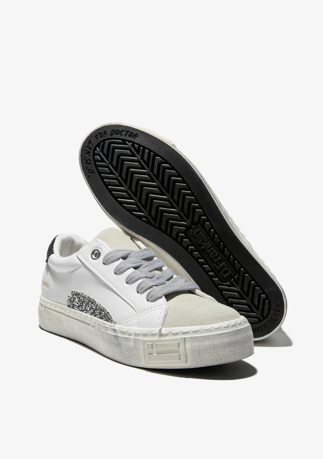 This model is constructed from faux leather and microfibre in white tones. It features cotton laces with a black glitter detail on the heel and a silver detail on the side. White monochrome 4cm rubber sole with D.Franklin emblem on the side and lettering on the heel.