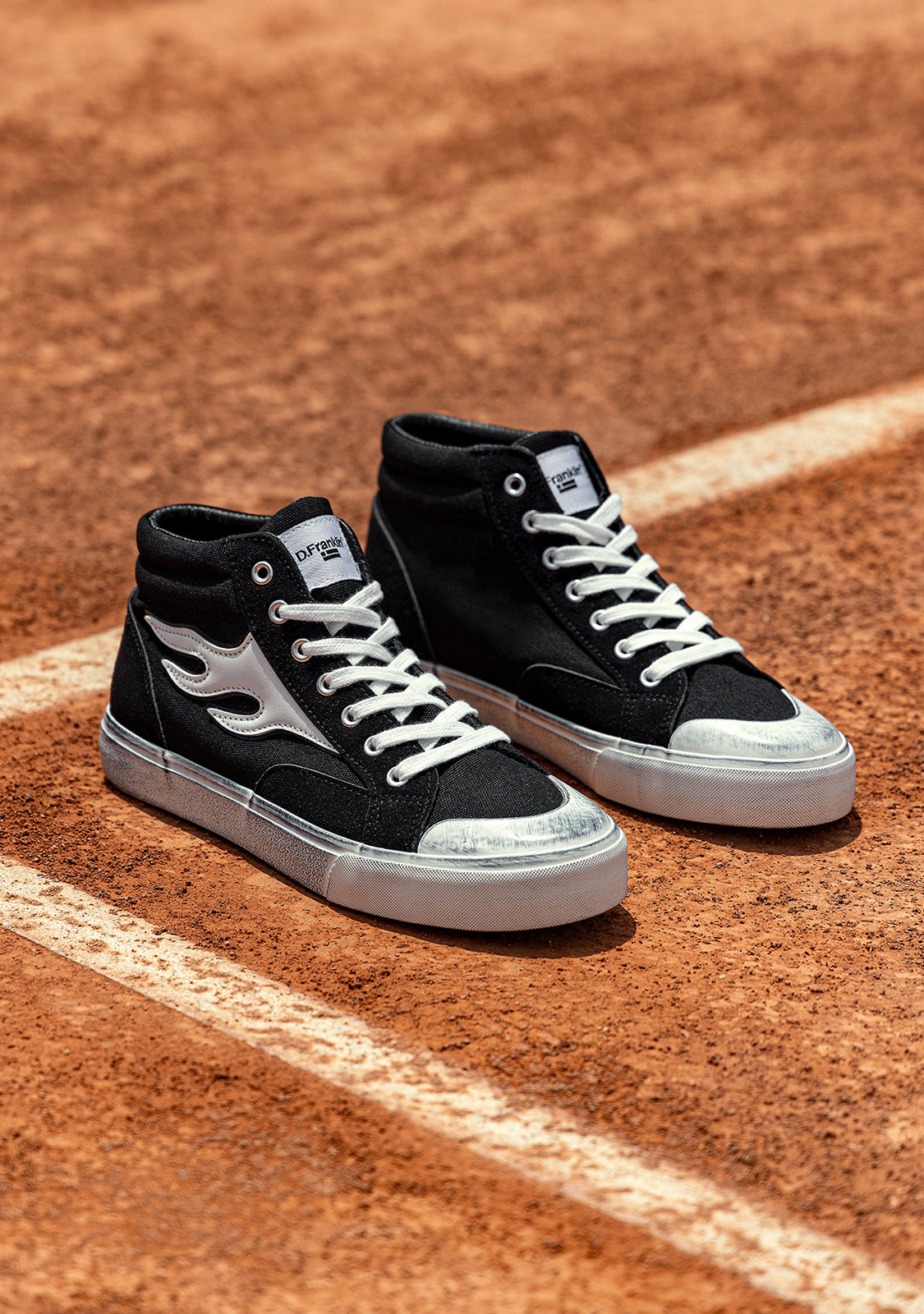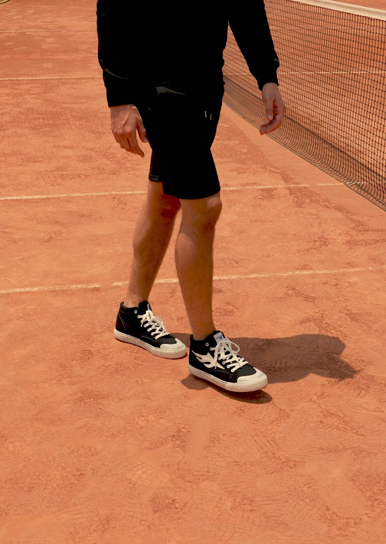 Made in black synthetic leather with suede details and white flames on the side and white flames on the side. These shoes feature cotton laces as well as our emblem and flag on the heel. The slip-resistant sole allows for a comfortable, extra-light tread.