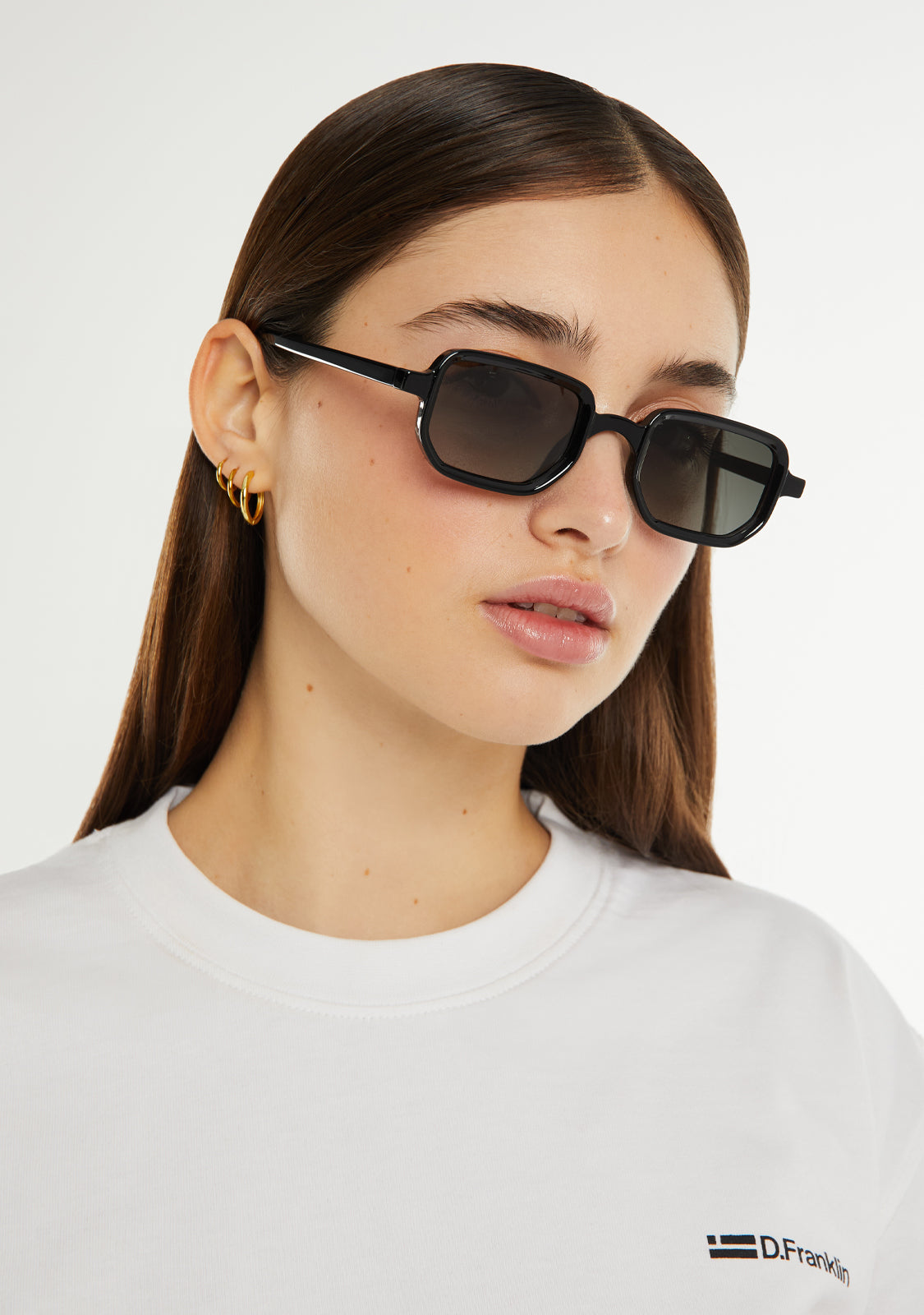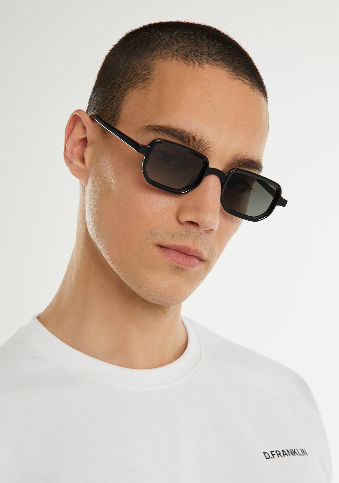 Check out our Jiggy model in black. This retro-inspired silhouette features signature D.Franklin details: the logo engraved on the temples and emblem on the lens. The lens width is 47 mm and the front is 143 mm. The side temples have a length of 145 mm.
