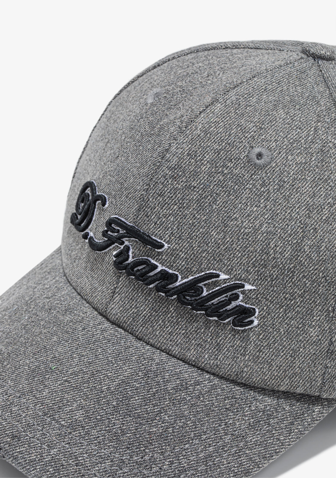 Cap designed in grey denim-effect cotton fabric. It features a D.Franklin emblem on the front in white contrast. It also has an adjustable snapback strap system with a metal buckle on the back.